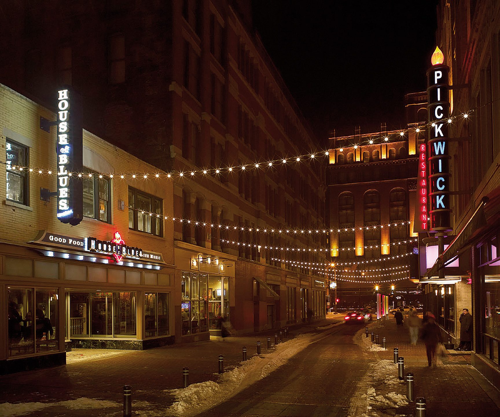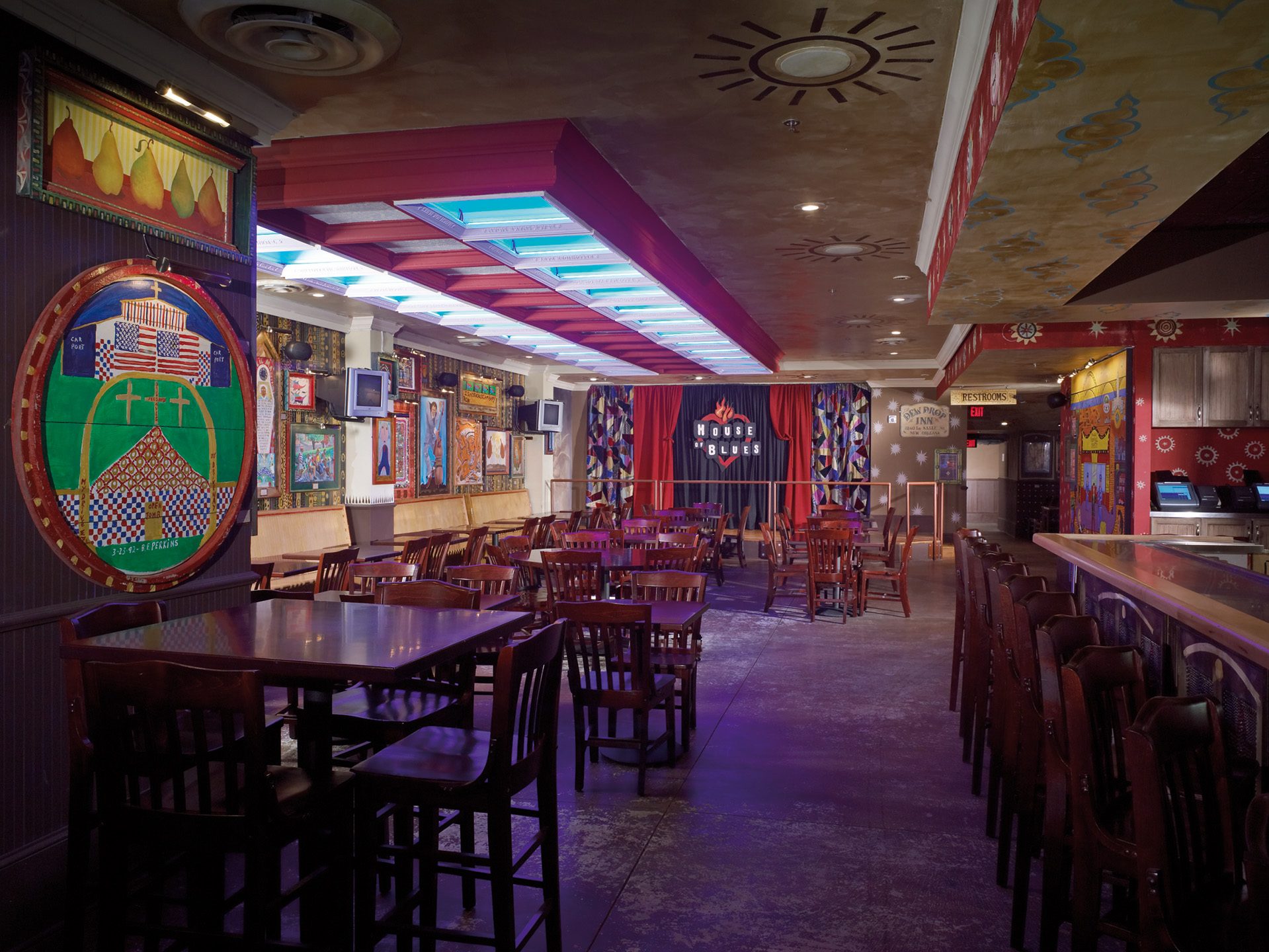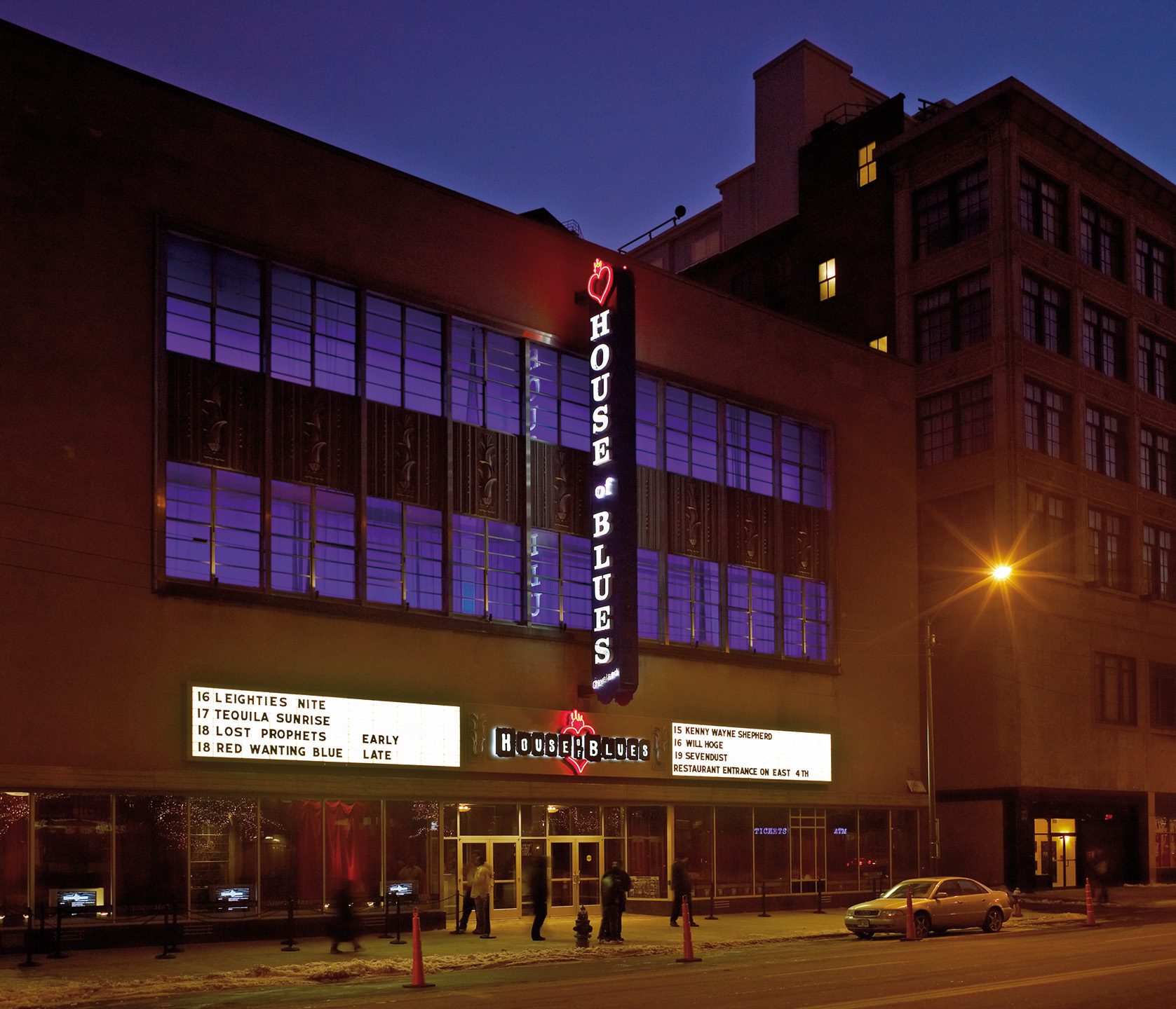 The House of Blues in Cleveland, Ohio, is the recipient of the 2008 Award of Merit for Historic Preservation from the Ohio Historic Preservation Office. Within the personality of the Cleveland House of Blues is a careful blend of ideas and styles that create a unique place revealing a story of Cleveland’s past. The current House of Blues that exists on 4th Street and Euclid Avenue in Cleveland was originally occupied by a Woolworth’s department store. The site was chosen for its location and the opportunity to bring life back to the area. The project team worked together to preserve many existing elements of the space. The exterior façade of the building was kept intact and restored. This was done not only to keep with the architectural tradition of the area, but also to preserve a piece of Cleveland’s history. Inside the House of Blues the terrazzo flooring was kept throughout the main level. Structurally, the team removed four large columns, and two floors were added on top of the current structure. The additional floors were set back from the street and faced with a rooftop terrace to maintain a uniform height appearance with the surrounding buildings. A skylight originally existed where the floors were added onto the existing structure. The design team removed the skylight structure and re-formatted the piece to work as a light fixture that is now mounted onto the ceiling of the lounge area.
