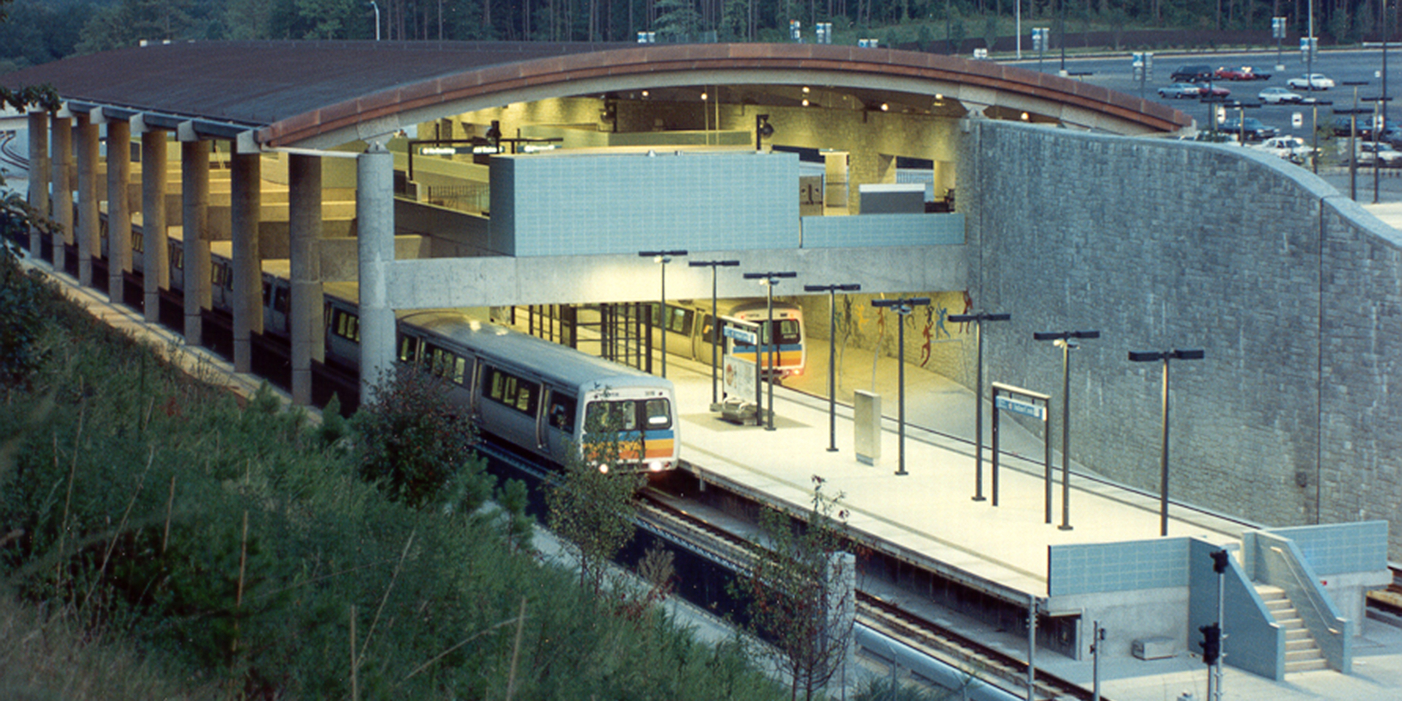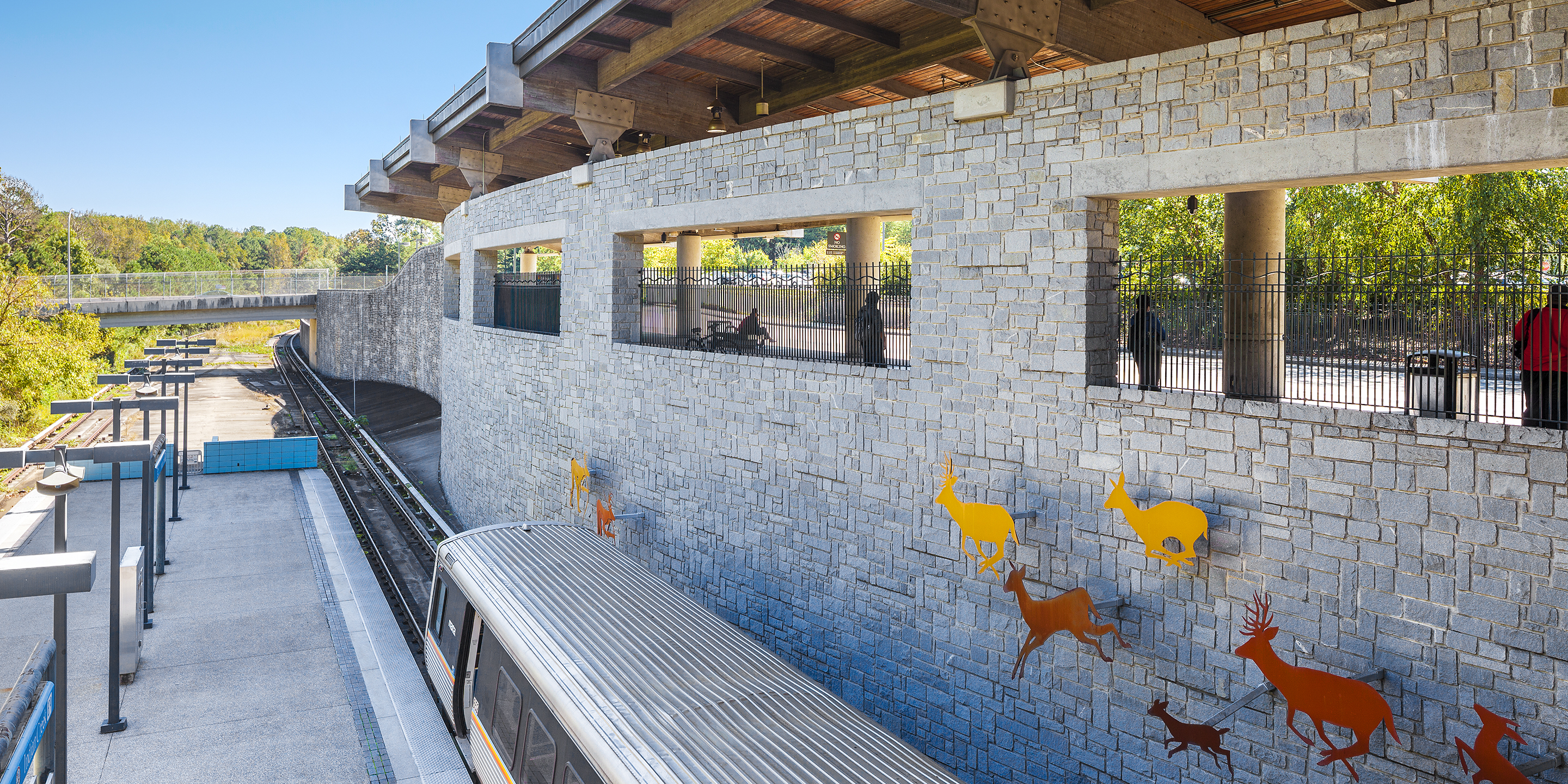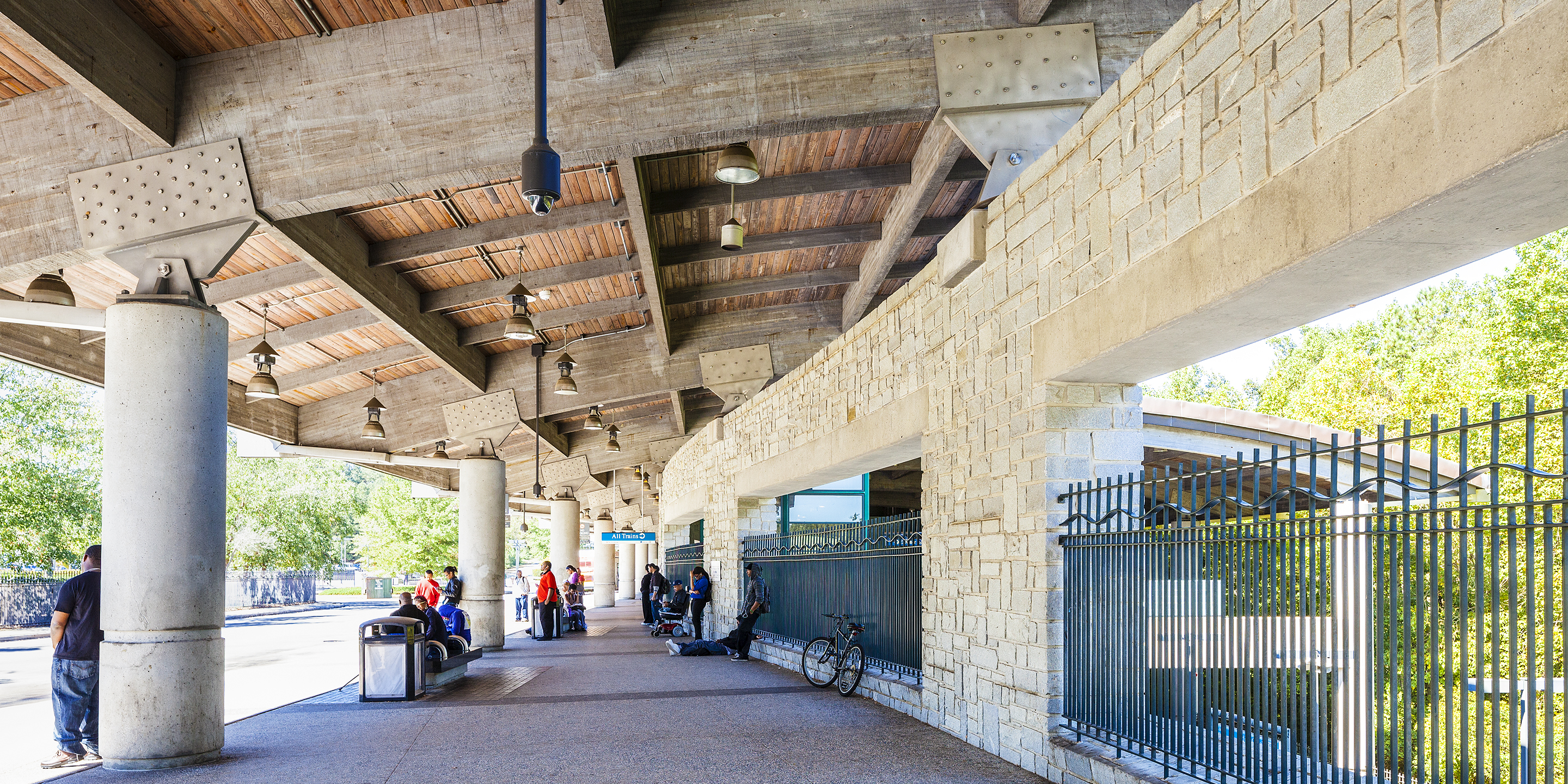 The Indian Creek transit station acts as the end of the line for the eastern leg of Atlanta’s rail system. As such, the station is the primary intermodal hub of six bus lines serving the eastern suburban communities. Located adjacent to a single family community, the station is nestled into a hillside along a creek bed to minimize the structure’s visual impact. Using natural materials of stone and heavy timber, the open air station is reminiscent of a park pavilion while serving the high volume pedestrian and circular and bus traffic. Parking is provided for 3,200 cars.