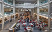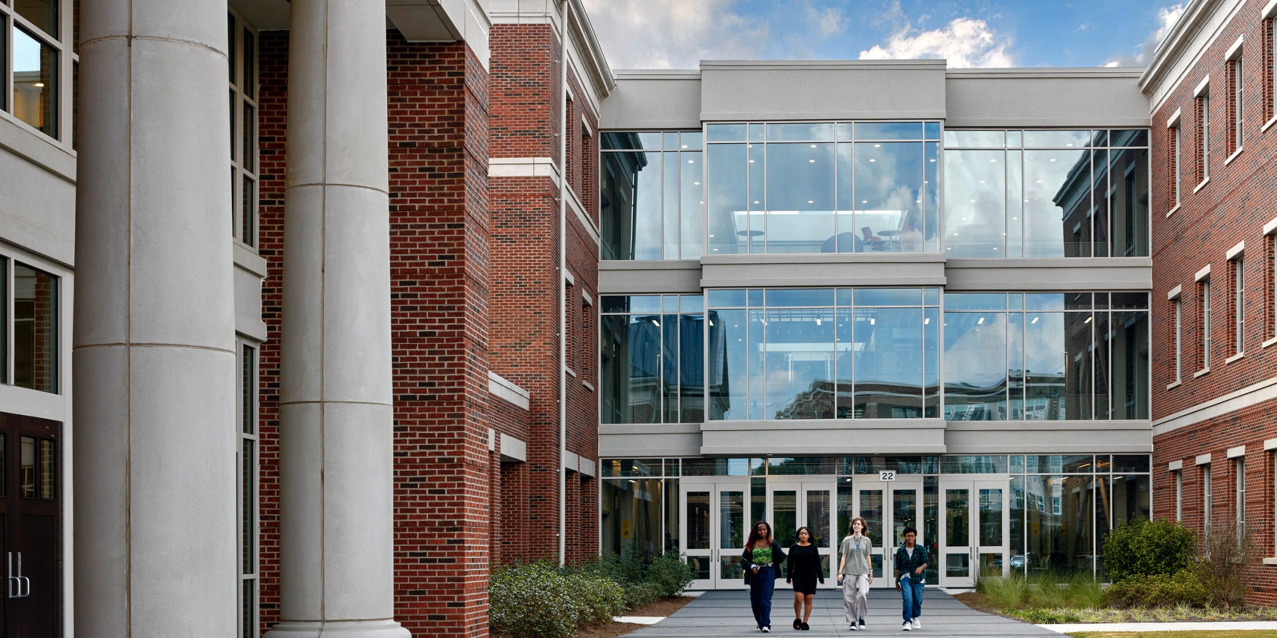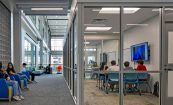Innovation Academy provides rigorous and relevant instruction in the STEM sectors of Information Technology, Engineering, and Health Sciences. The project is housed in the old Milton High School, and the traditional design of the exterior blends with the downtown Alpharetta area. The interior design capitalizes on collaboration through the creation of a central three-story atrium, known as Touchdown Commons. This space houses both the media center and cafeteria to create the ‘Starbucks effect’ in this communal space, where students can eat, collaborate, and socialize throughout the day.