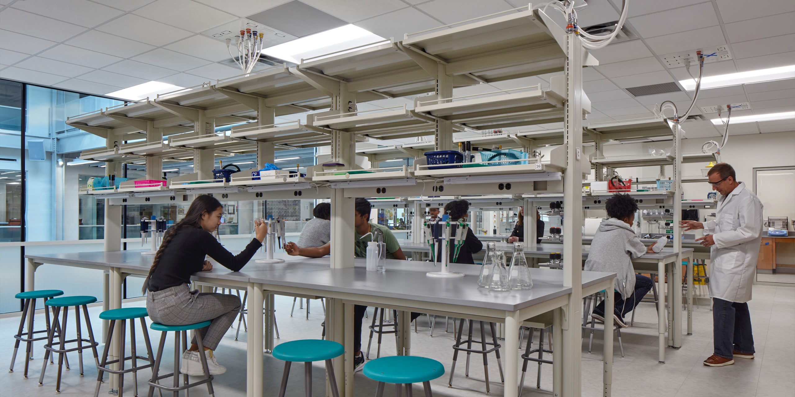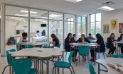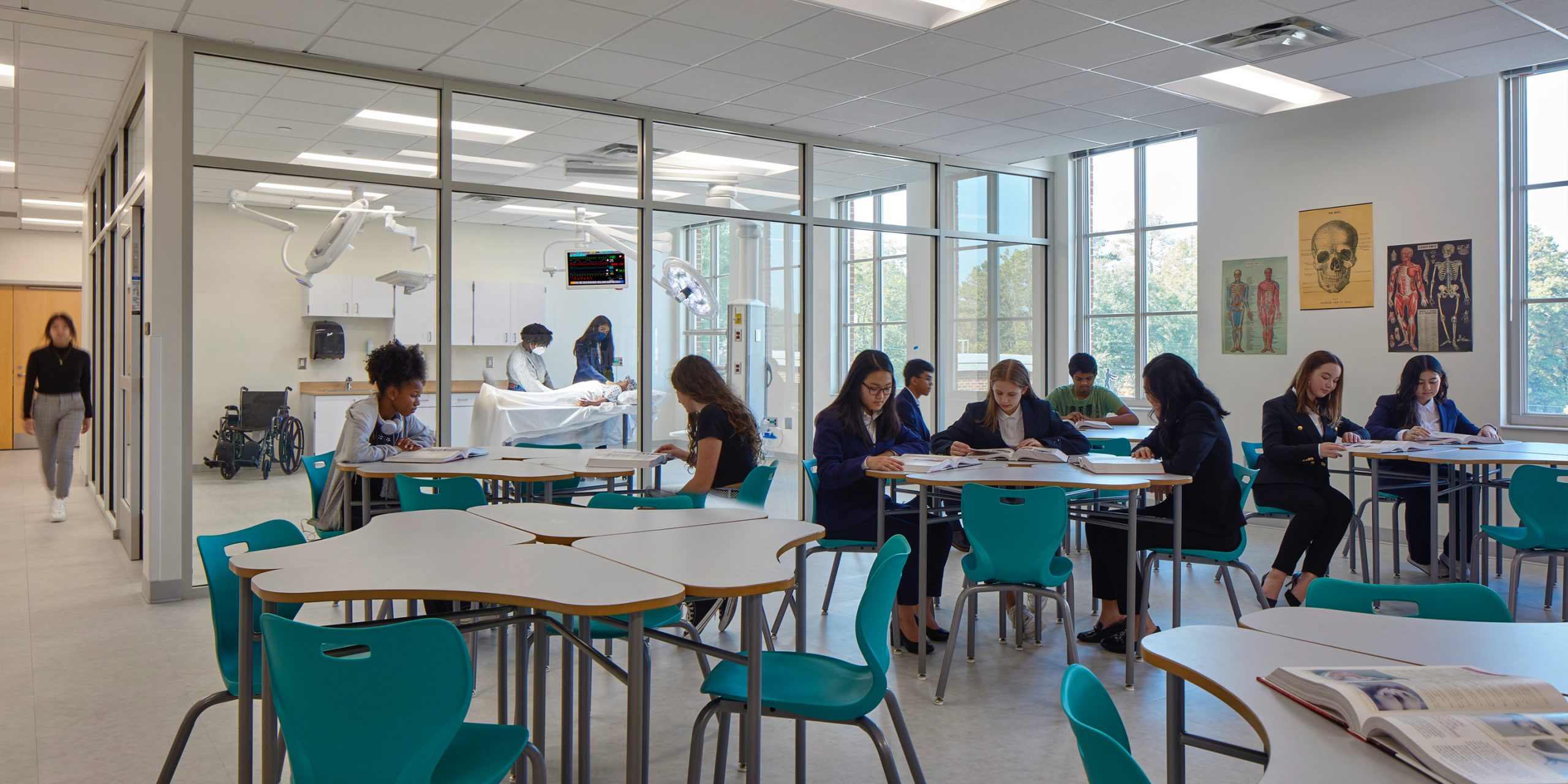 This project was designed by Cooper Carry’s K-12 Studio in collaboration with Cooper Carry’s Higher Education Studio and Science + Technology Studio. This unique blend of experience provided for vocational and career readiness strategies and specialized STEM design. Master planning services were provided in anticipation of the school’s growth, creating room for a future gymnasium, additional cluster classroom wing, and music and drama program. The modern space ensures that Innovation Academy can fully support up to 1500 students interested in pursuing the sciences.