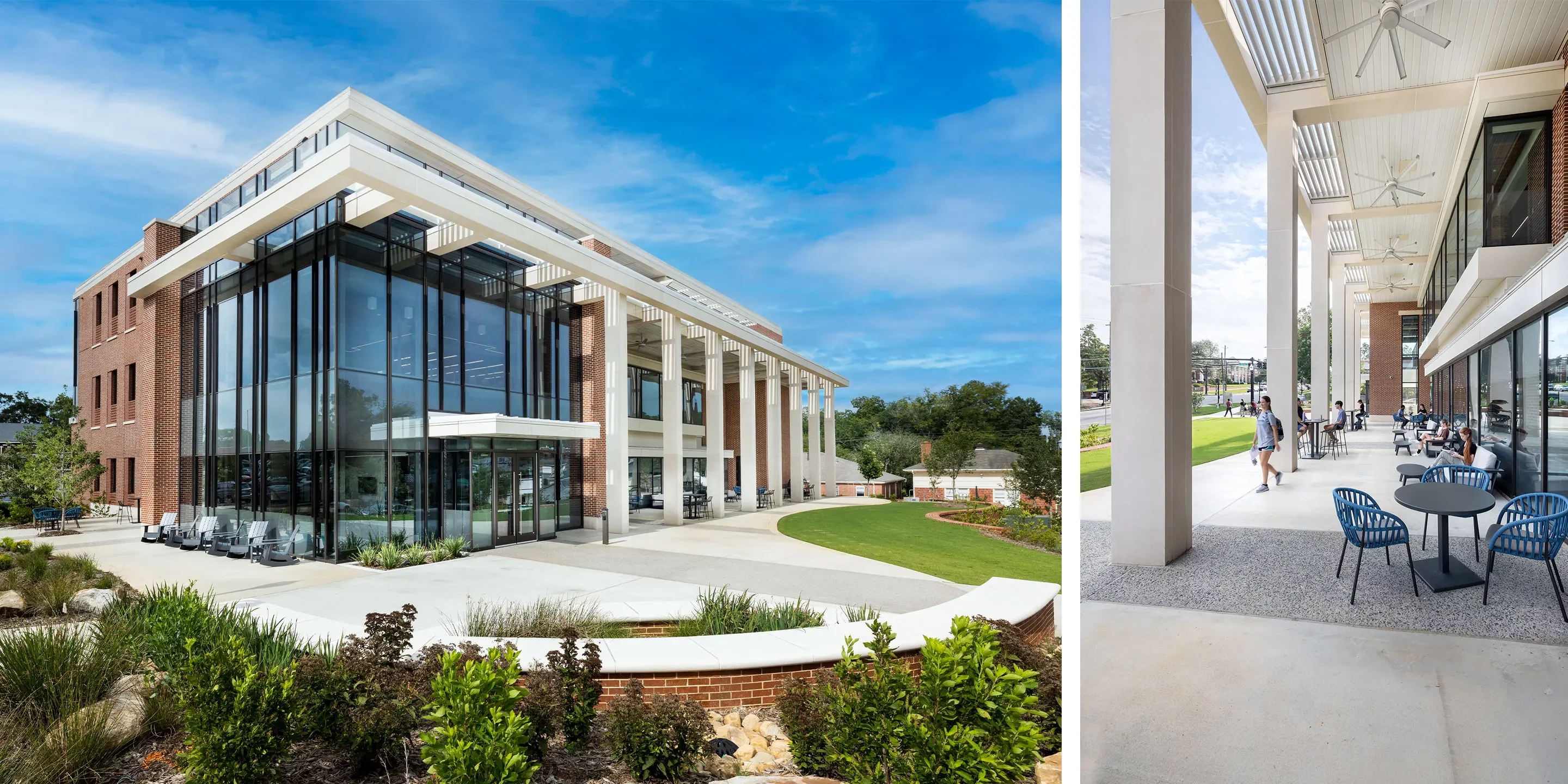 The exterior of the building also serves to reinforce transparency and connection. A teaching garden for biology, which can be seen directly from the outside patios, allows all students an opportunity to experience the biological sciences. Woodland and butterfly garden are also provided, and recycled glass in the soil from the Georgia College Glass Recycling Program reinforces a connection to nature and the campus.