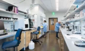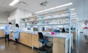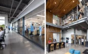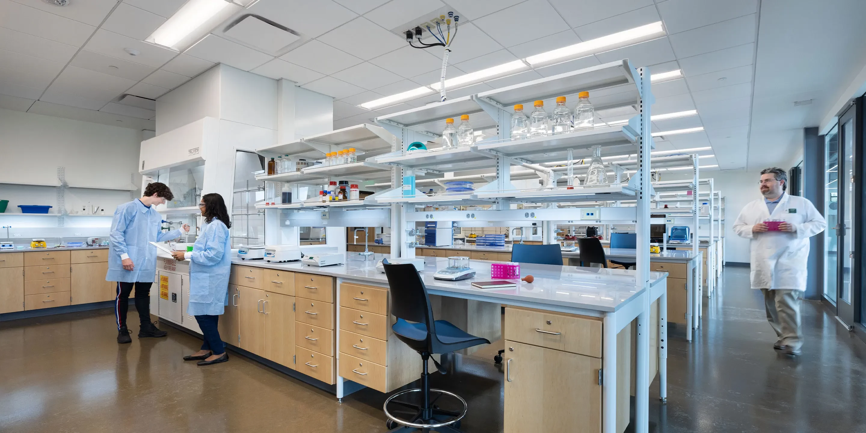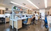 Open, flexible laboratory spaces were designed to allow research teams to expand and grow as needed, and give more students an opportunity to work closely with faculty, starting at the undergraduate level. Transparency was key in creating the much-desired connections. Floor-to-ceiling glass throughout the labs and interior areas activate the spaces and allow for the research to speak for itself. Gathering spaces were intentionally carved into the building to support a variety of meeting needs. A warm wood wall and ceiling in the lobby envelops the gathering spaces and draws a visitor’s gaze up the double-height space, and unique art fills the building.