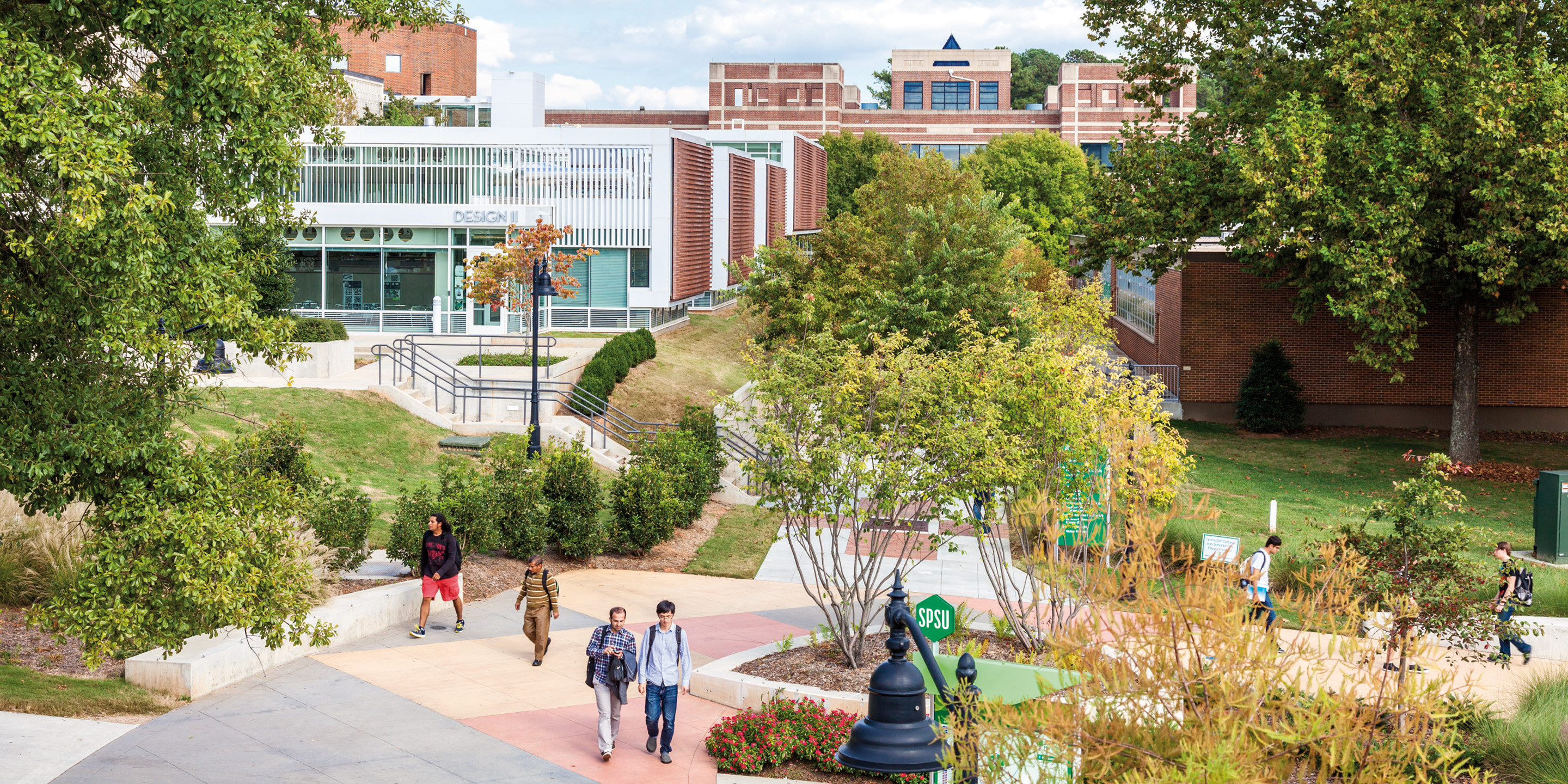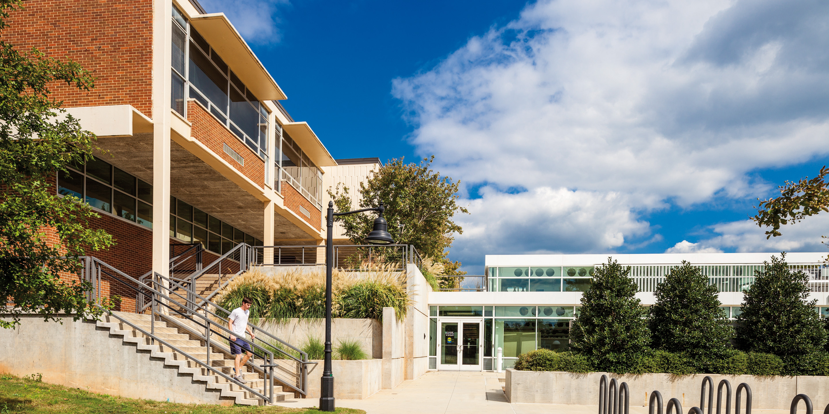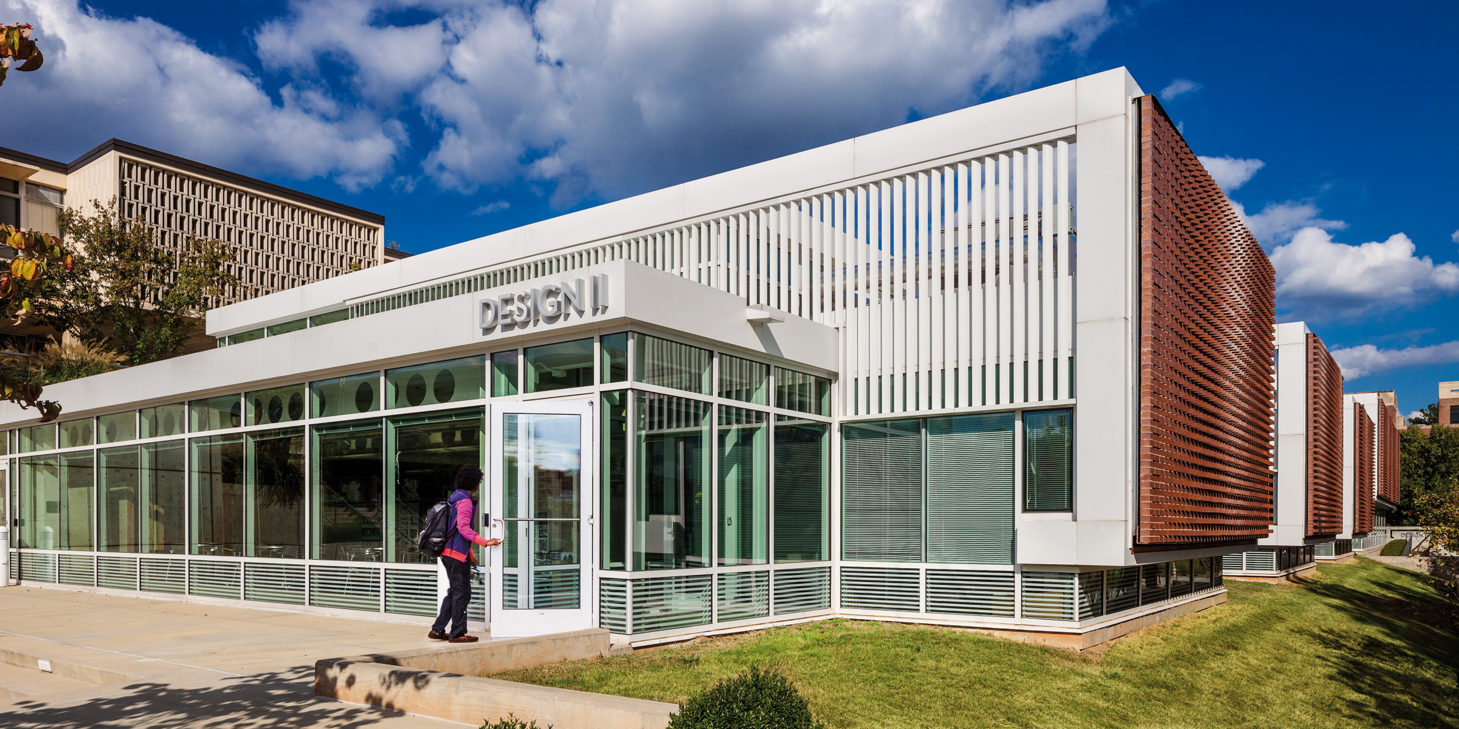 The 14,600 square foot Design II Architecture Studio addition at Kennesaw State University in Marietta, Georgia addition houses the Department of Architecture’s second year design studios. The Architecture Program offers a 5-year professional degree in Architecture and is the only 5-year Bachelor of Architecture program in the State of Georgia. The building site rests on a hillside that slopes down fifteen feet below the existing first year studio building. Therefore, the roof terrace of Design II rests at the first floor elevation of the existing building, creating a green roof patio and outdoor classroom shared between the two buildings. The curriculum for second year students explores design, materials and methods, building systems, and building construction. A principle design objective of this addition is to provide instructors a teaching tool, demonstrating fundamental concepts of construction and material use. For example, the building features a brick multi-dimensional rain screen wall to demonstrate a creative and flexible use of brick as a construction material. By minimizing typical interior finishes, such as drywall and suspended ceiling systems, the design allows students to easily understand how many types of structural and building components work.