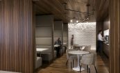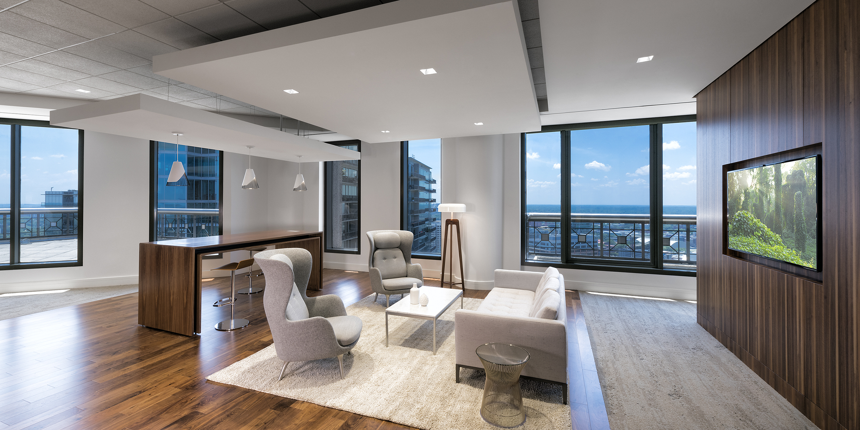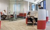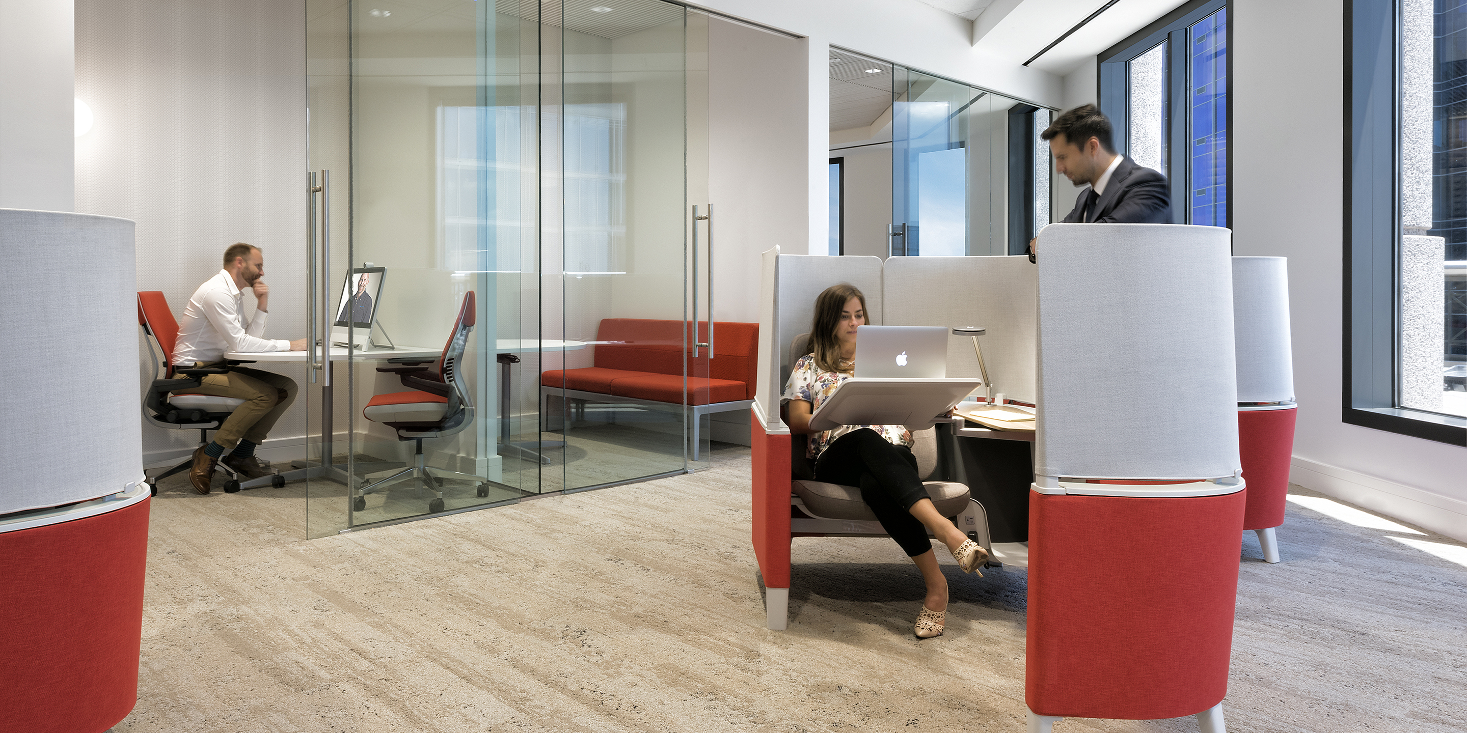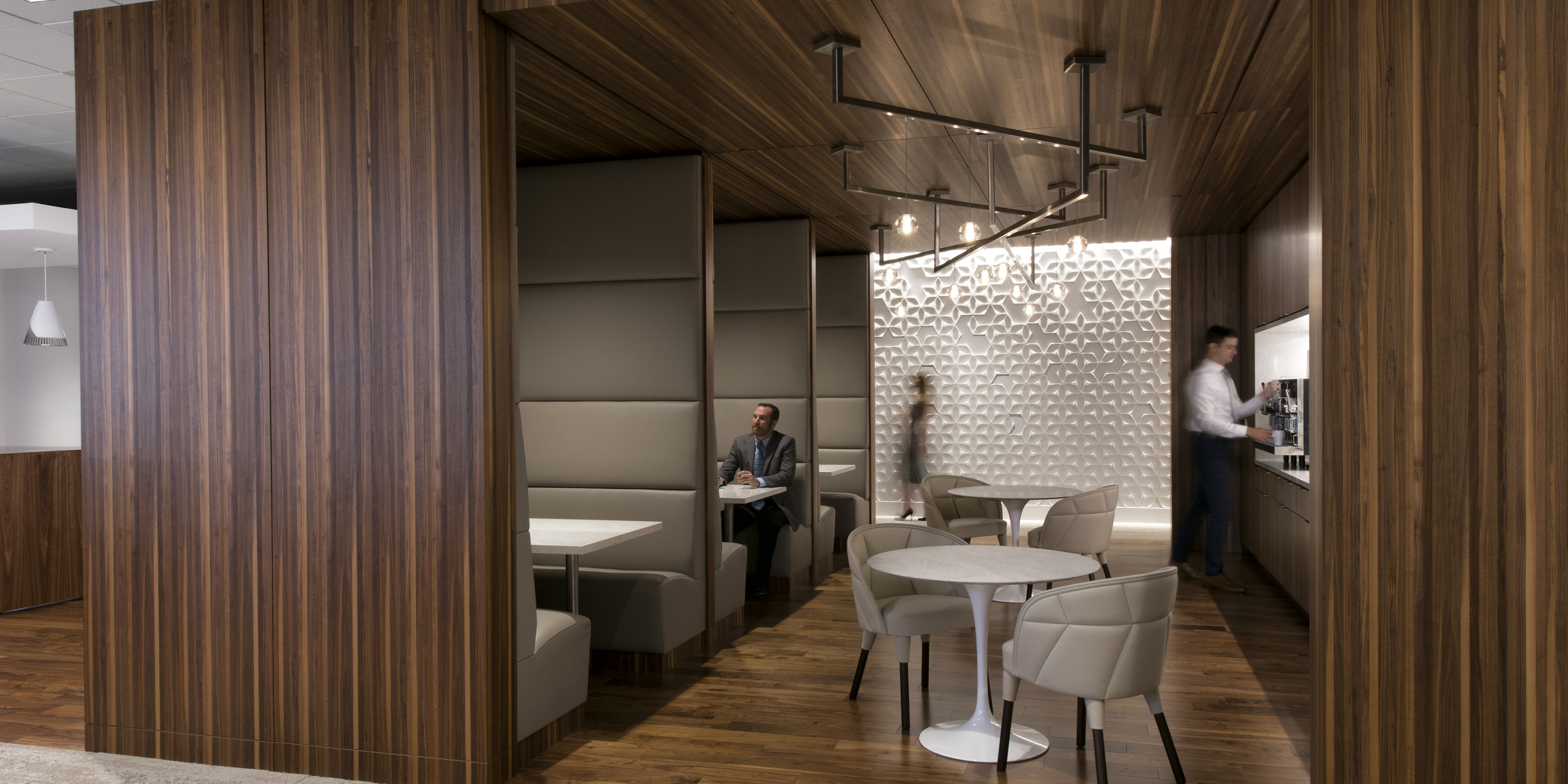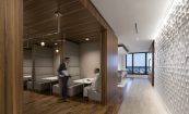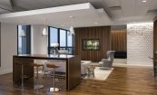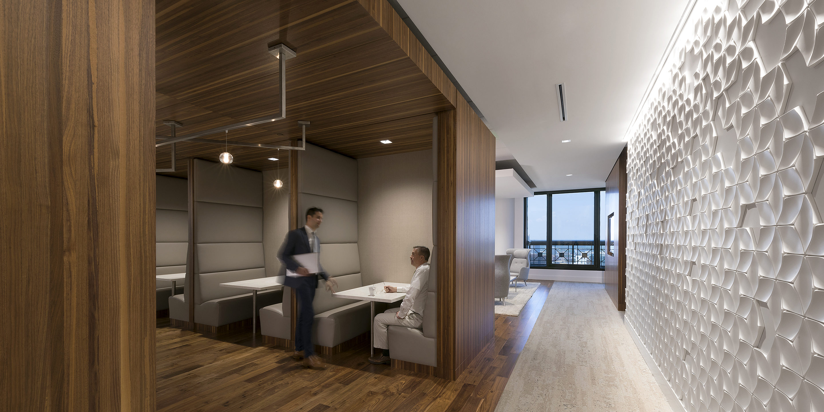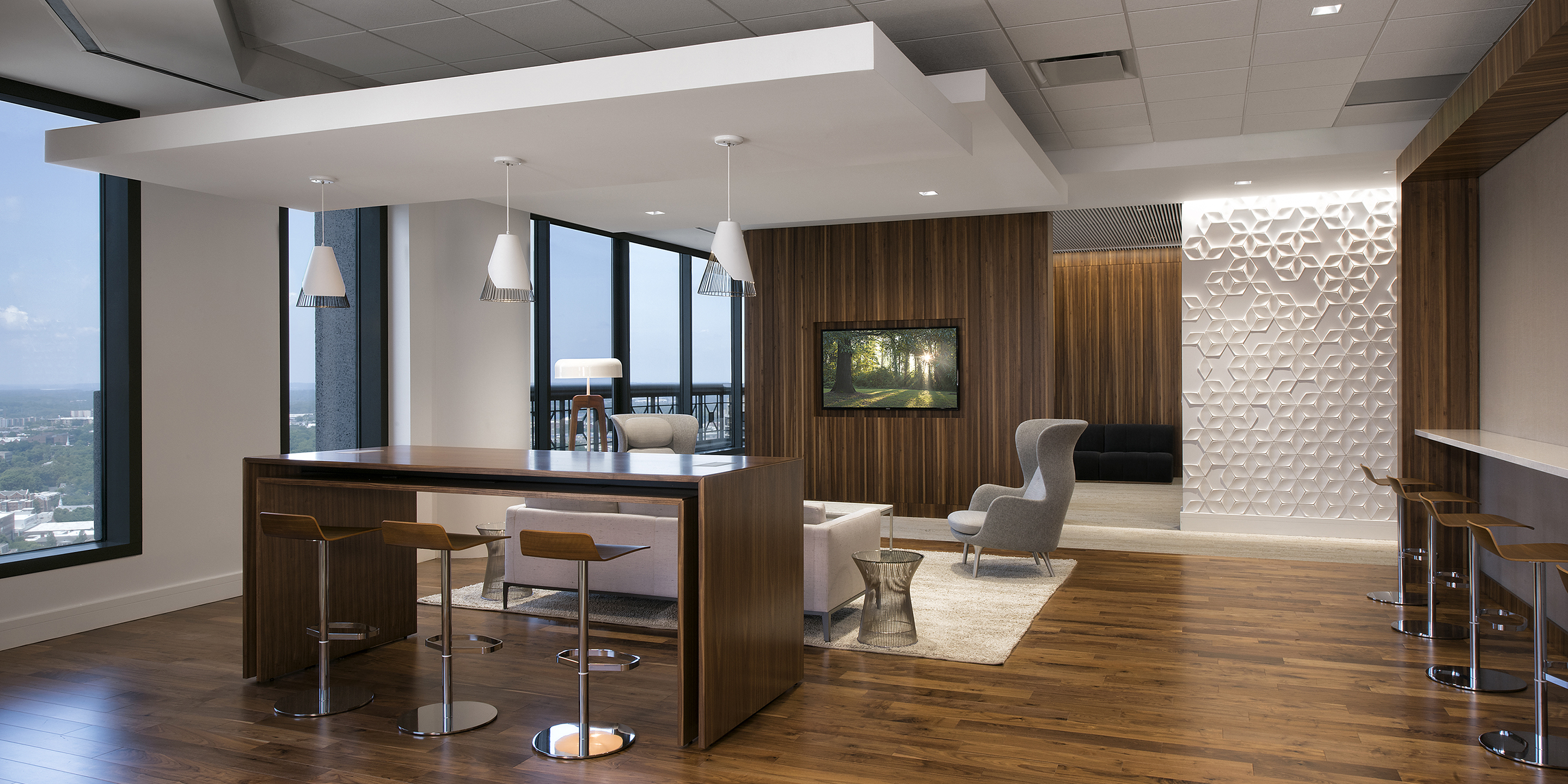 Cooper Carry was again contracted by Kilpatrick Townsend Stockton to renovate their 3,148 SF library space in their Atlanta Office. The existing library was converted into a flexible “community hub,” and provided an environment where Kilpatrick’s employees could gather. The basis for the project was to begin to foster more collaboration among colleagues in a working environment that did not previously have a dedicated space for it to happen organically. The design included an adjacent “work café” area offering premium, high-end coffee and provides both open and semi-private work spaces for individuals or groups to take their work into a different and unique environment from those offered on their current floors. Additionally, the Cooper Carry team created a series of rooms which each provide its own character and opportunities for working, meeting, or the chance to unwind. Amenities of the space include a reading space, an integrated news ticker and TV, colorful collaborative work spaces, lounge area, and standing height tables for impromptu meetings. In addition to the open, collaborative spaces, a series of individual “work pods” complete with a footrest, lamp, and power were included to perform more focused work, or to provide a hoteling space. Adjacent to this focus area are several enclosed glass “huddle rooms” for quiet individual work, or a small two person collaboration session which include dedicated video conference capabilities.