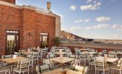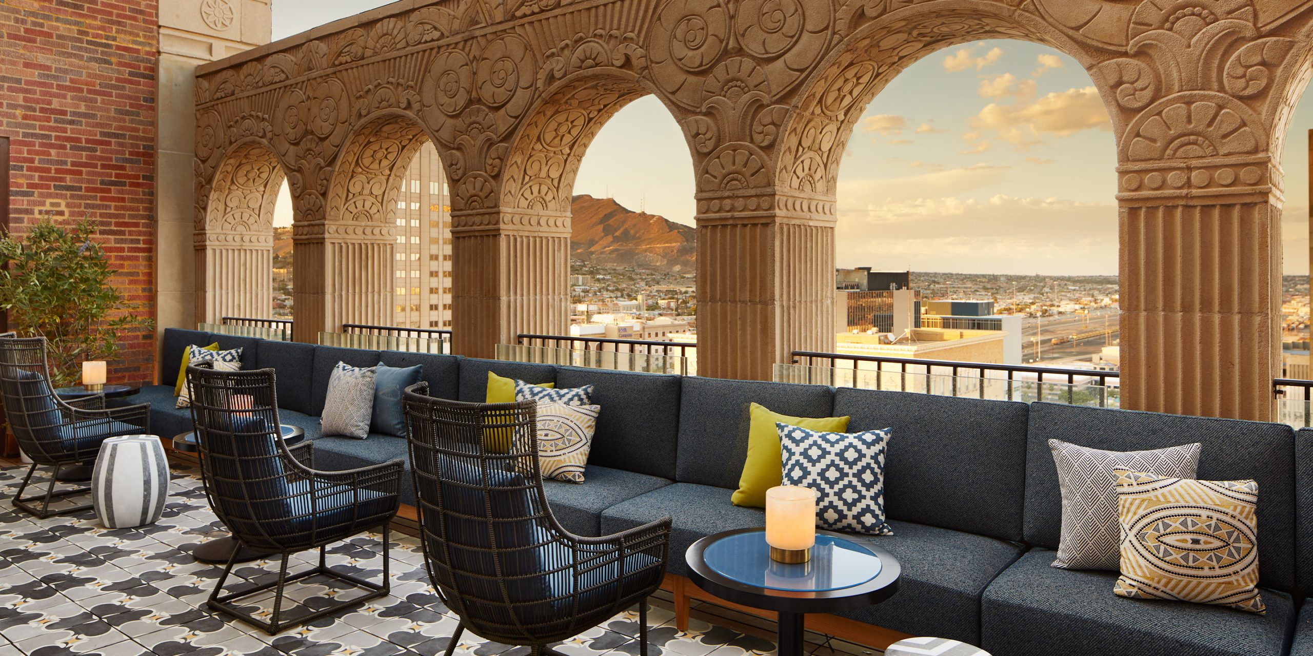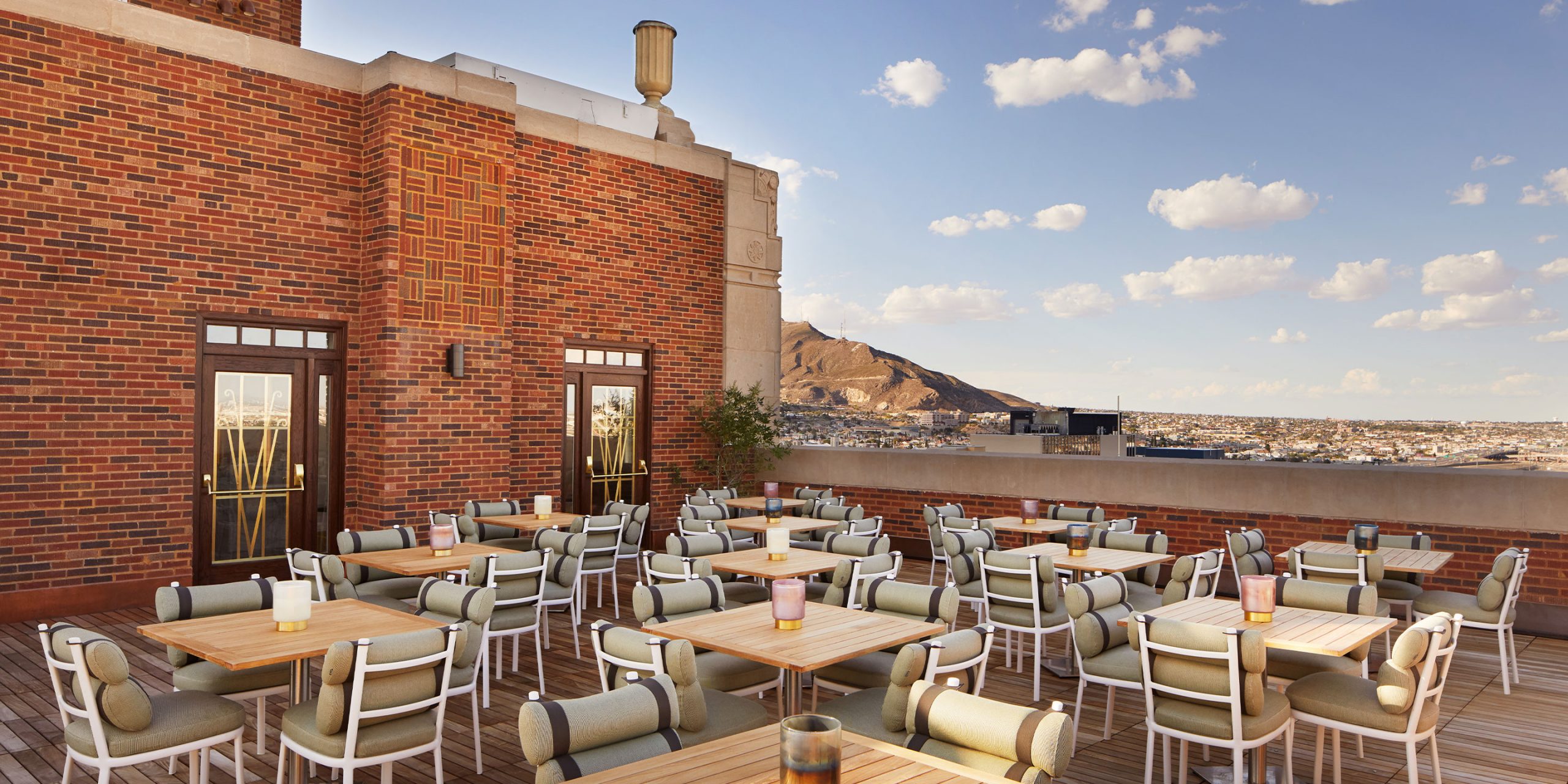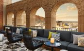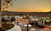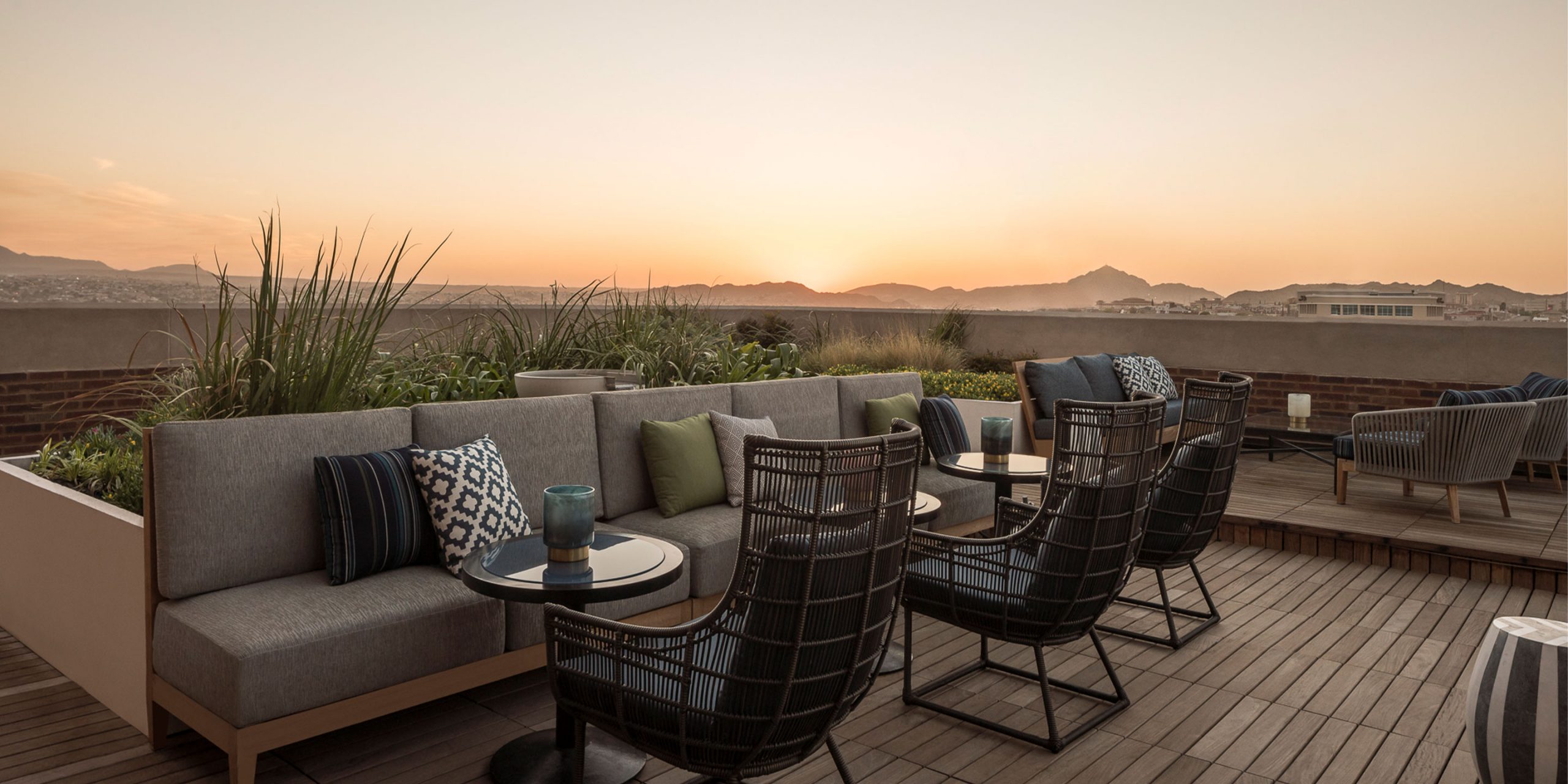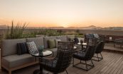 With fantastic views of the skyline and mountain vistas, the 17th-story terrace bar was ripe with possibilities as well as challenges. The environmental elements of the desert, such as the intense heat and dust, required fade-resistant, durable fabrics on the furnishings. The team pivoted from the original inclusion of lush green plants to dessert succulents that would remain attractive year-round. To help camouflage the sand blown into the space, the design team used patterned fabrics on the semi-private seating areas.