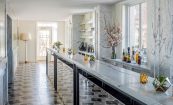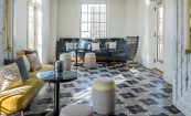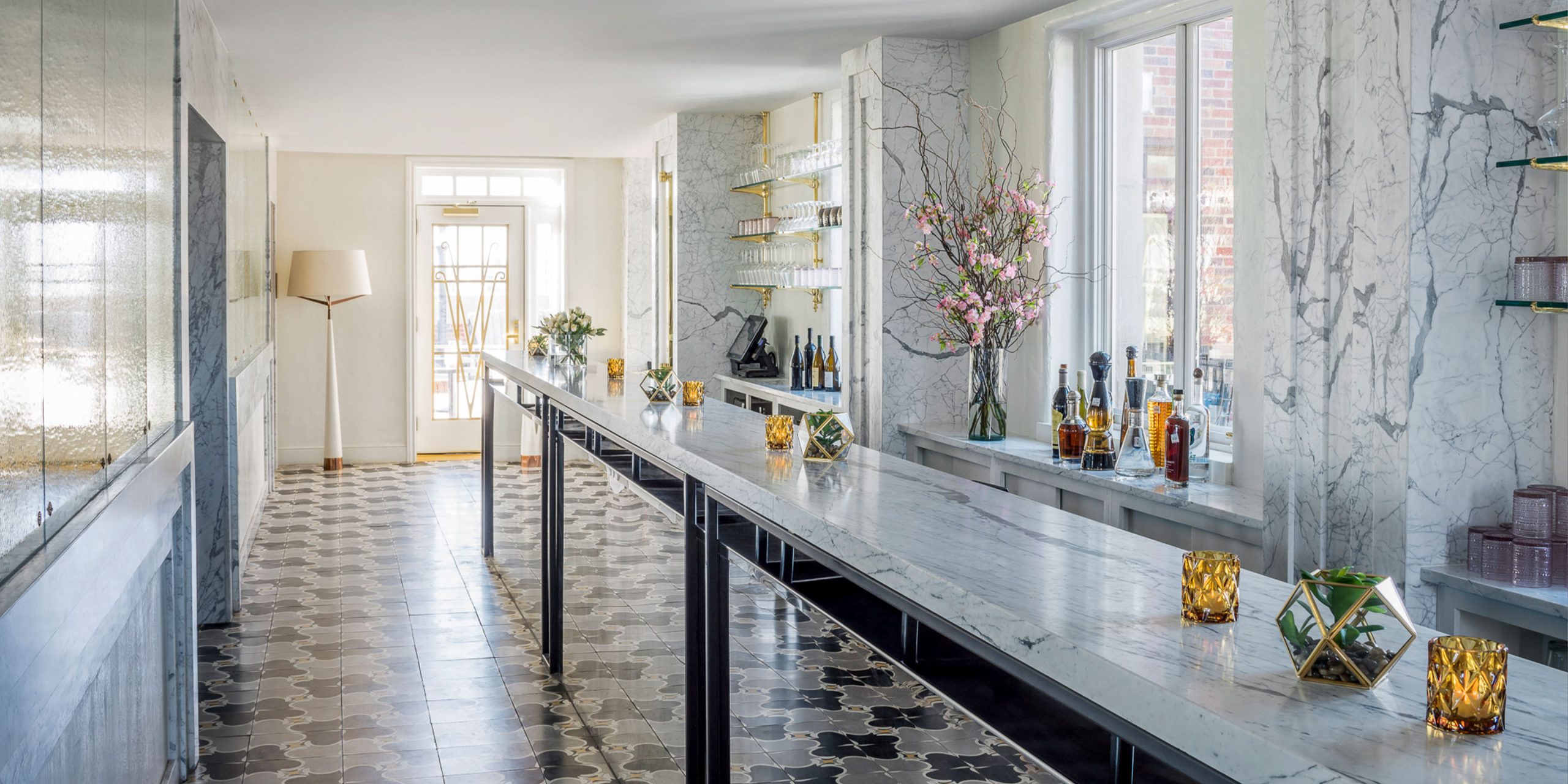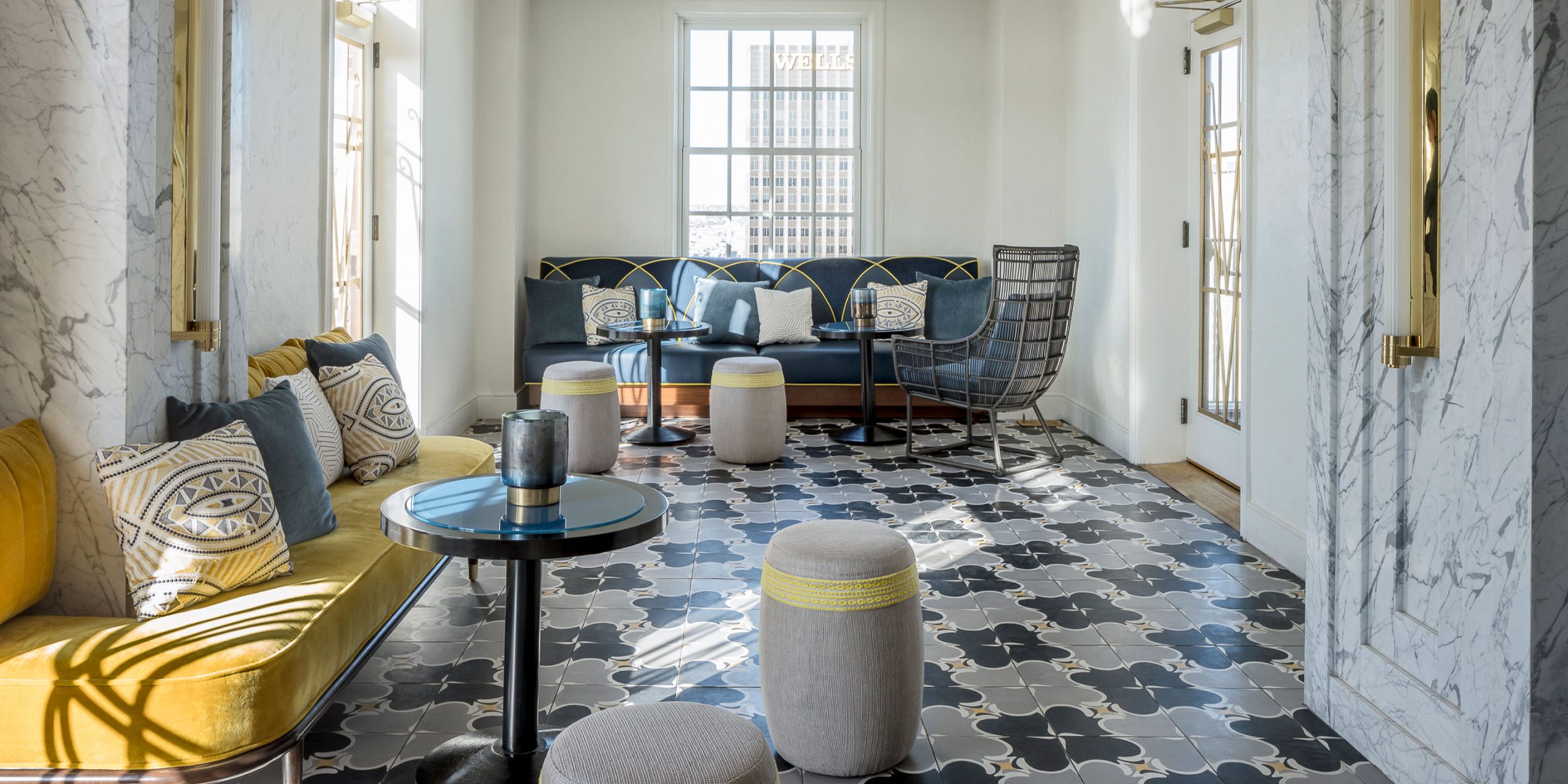 Bold patterns, such as the yellow accents featured on the side tables and pillows, help tie the old with the new. Inside the main bar area, modern touches include the white marble bar top with black accents, clear glassware on open-shelving, and the neutral gray and navy seating areas. Guests can comfortably relax, sip a cocktail, and enjoy the convivial ambiance.