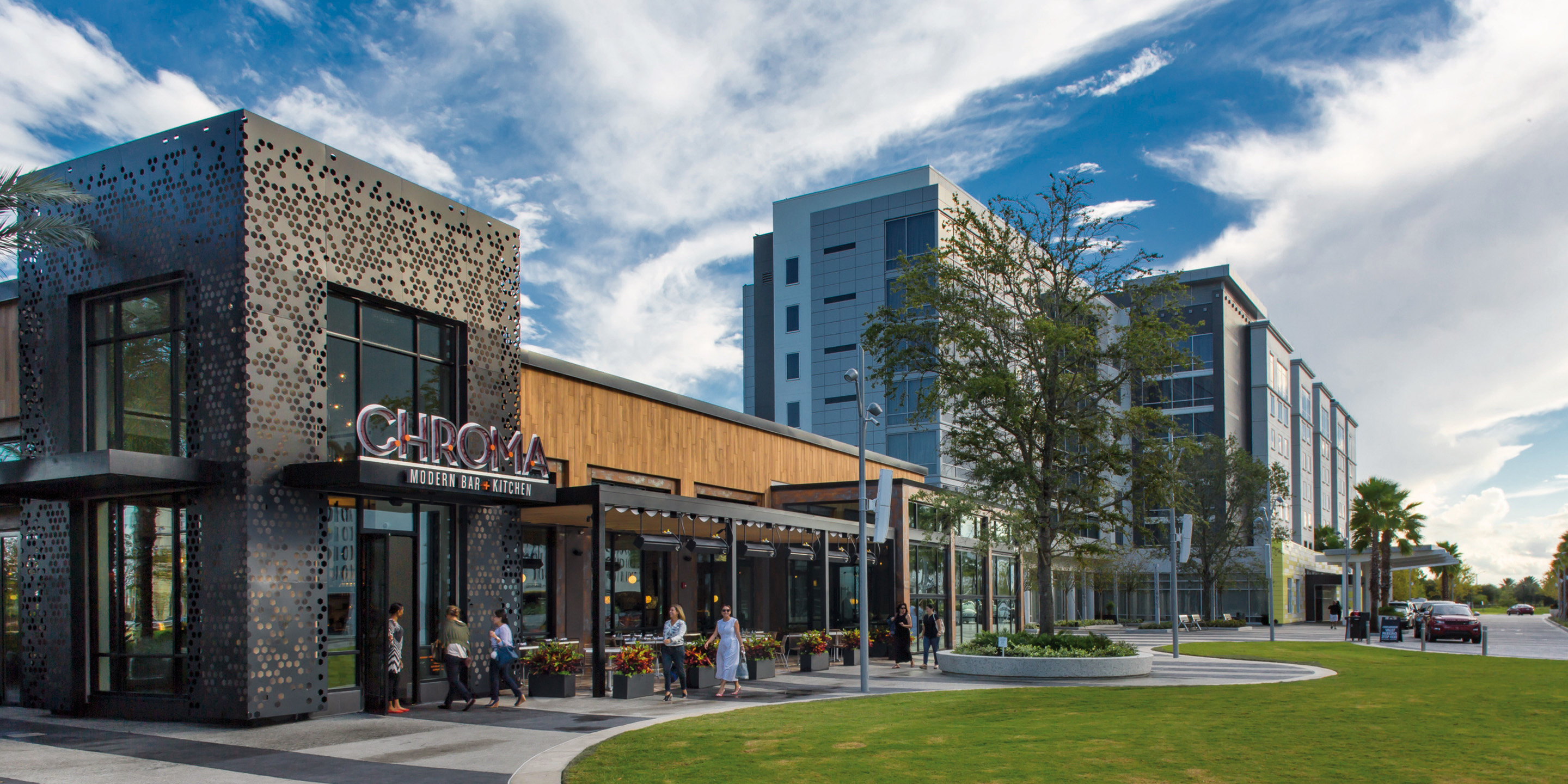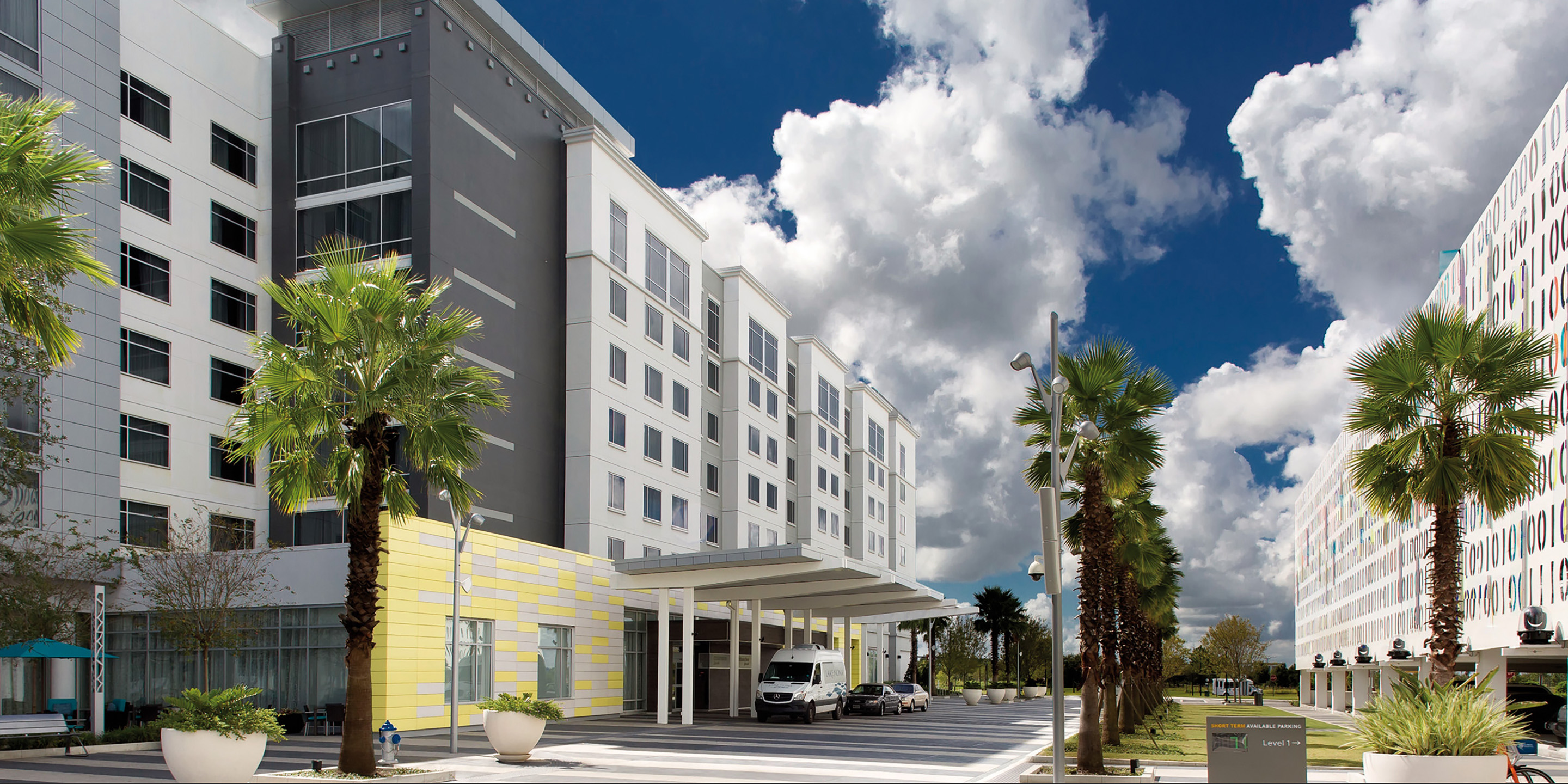 Cooper Carry designed the Courtyard and Residence Inn Dual-Brand Hotel as part of a larger development that included an office building, a parking deck, and two freestanding restaurants in Lake Nona, Florida. Each brand has its own identity on both the exterior and the interior of the building while maintaining a unifying overall design composition and material palette. The project opened in the Fall of 2015.