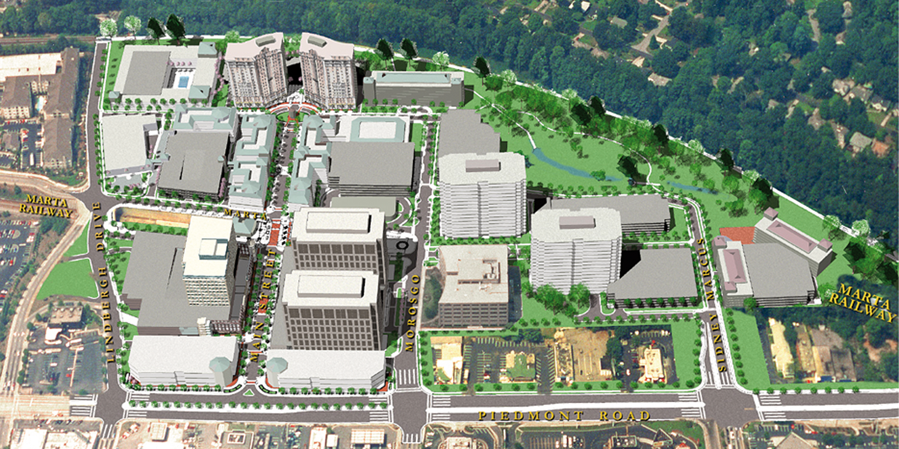 Located on a 30 acre site, Atlanta’s Metropolitan Area Rapid Transit Authority (MARTA) undertook the redevelopment of its large surface parking lots and the mostly abandoned warehouses around its Lindbergh Station into a mixed-use, transit-oriented community. Working with MARTA and Carter, and also the City of Atlanta, local landowners, and neighborhood associations, we analyzed possible uses for the Lindbergh site and adjacent areas. Largely lauded as the first mixed-use development of its kind in Atlanta, residents now have a place to live, work, shop and be entertained in a pedestrian-scaled, urban environment designed from the ground up. The orientation of pedestrian and transportation connections and the integration of public greenspace render Lindbergh City Center a flagship demonstration of traditional urban planning principles.