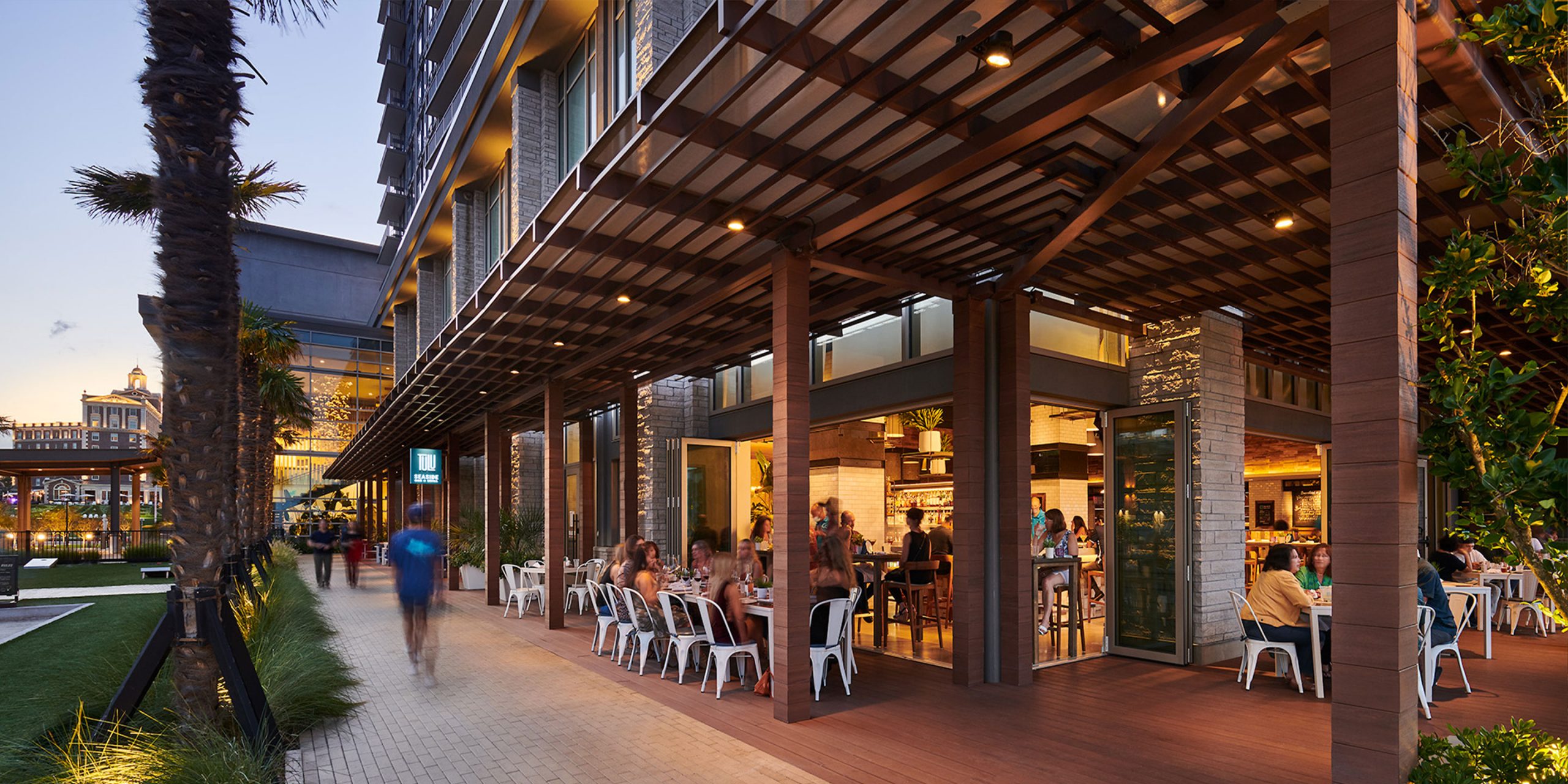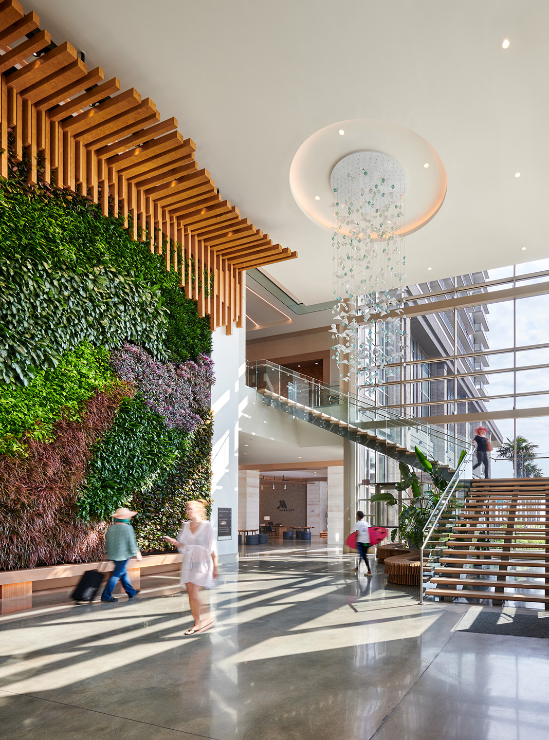 Flexibility was a main component of this hotel design. Operable glass walls were used to extend the living experience outdoors, including in the on-site restaurants and the ballroom, allowing guests to take in impressive, open-air views of the eastern seaboard.