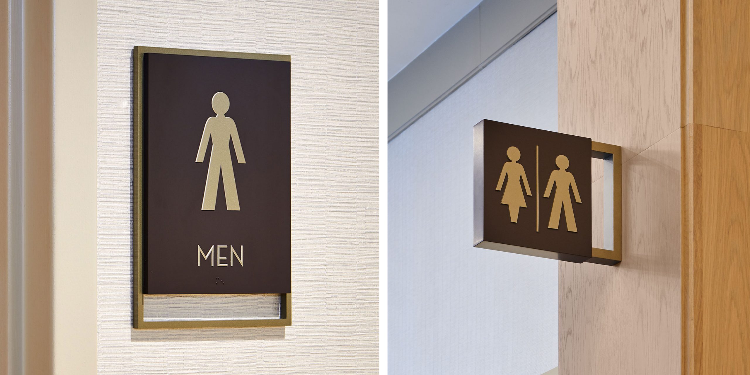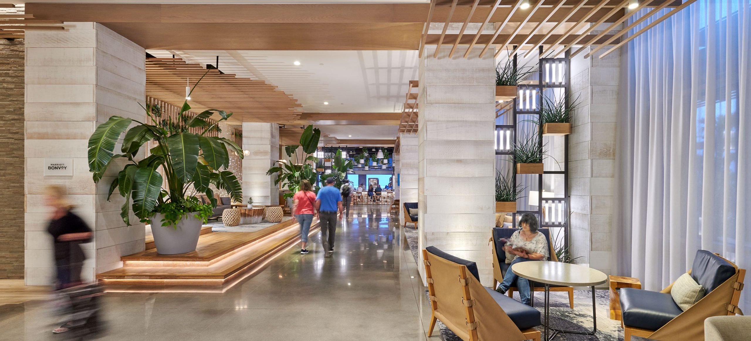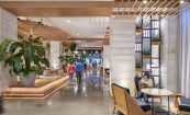Each guest room was also reconfigured with sofas turned to face the views of the ocean, and king suites include Juliet balconies for a further connection to nature. Navy, gray, and gold round out the color scheme in the rooms. In the public spaces, biophilia and raw materials create a contemporary style that sets the hotel apart from others in the brand. Custom wayfinding seamlessly guides guests throughout the property and complements the interior finishes.