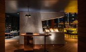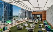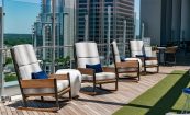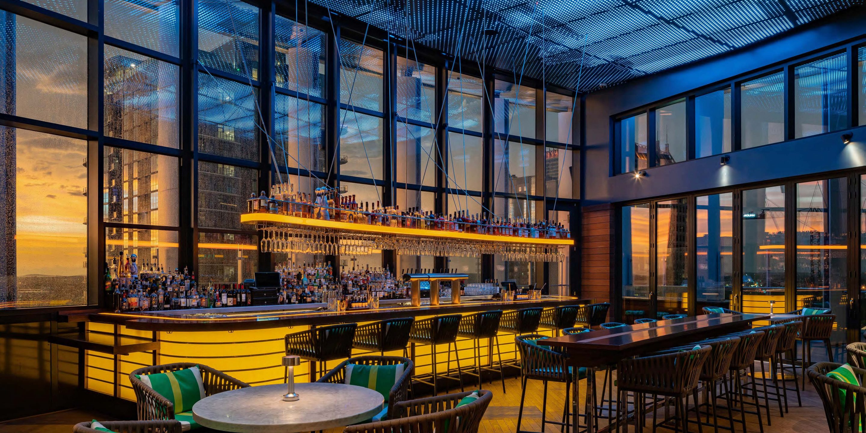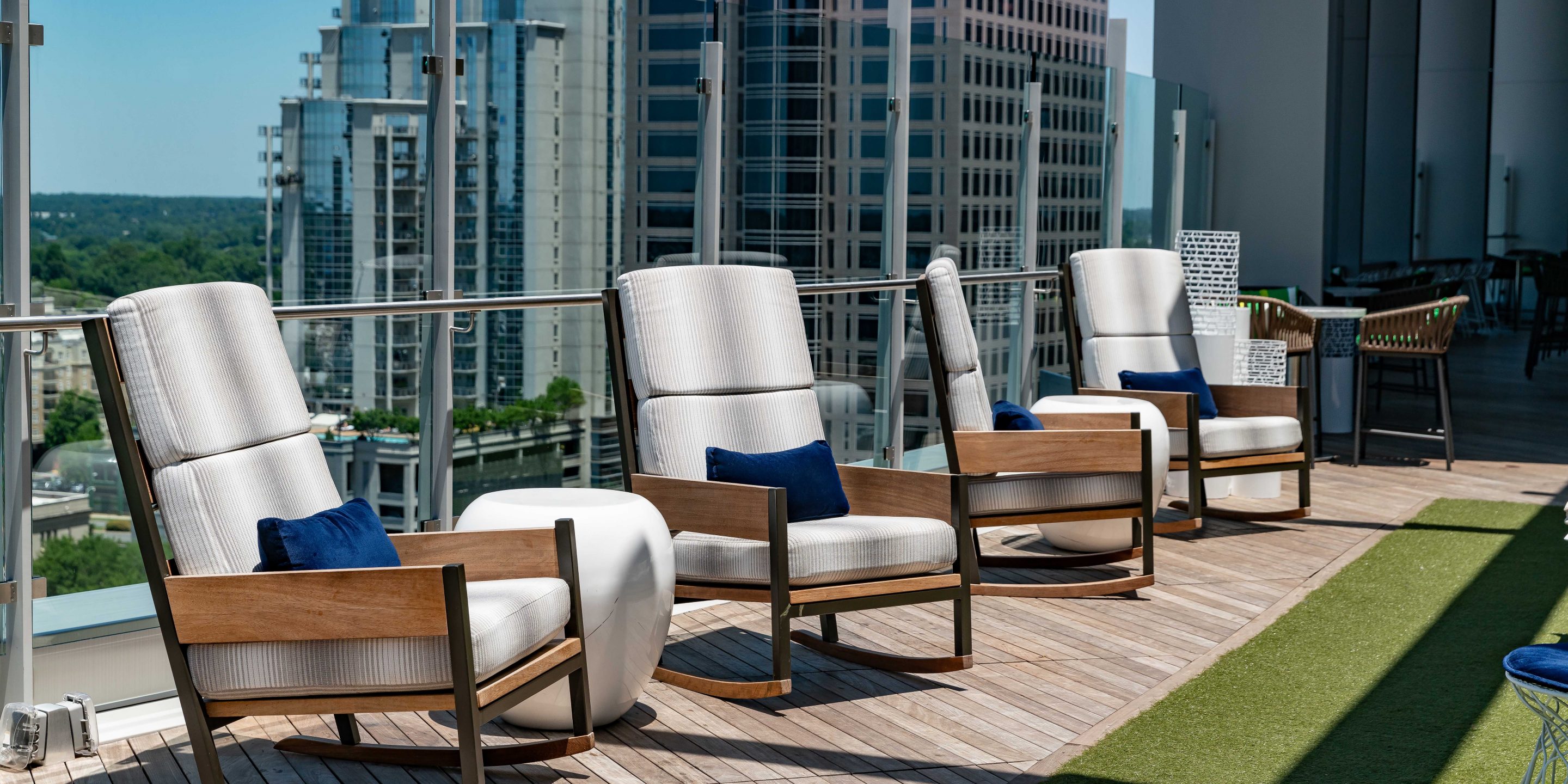 The glass walls and operable doors featured within the bar allow guests a full view of the skyline. Through the glass doors guests will find a lounge lawn with a retractable roof and a video wall that can be customized to display art, entertainment and ambient video. The exterior lounge doubles as private event space. A synthetic grass floor makes the space feel like an aerie. In fact, it was designed to feel like a lofty front porch. Cozy lounge furniture creates varying types of seating at the exterior lounge with a backdrop of ipe wood slats, white concrete three-dimensional geometric tiles, and a feature television wall. Rocking chairs and custom floor lamps offer an intimate view of the city and reinforce the Southern aesthetic.