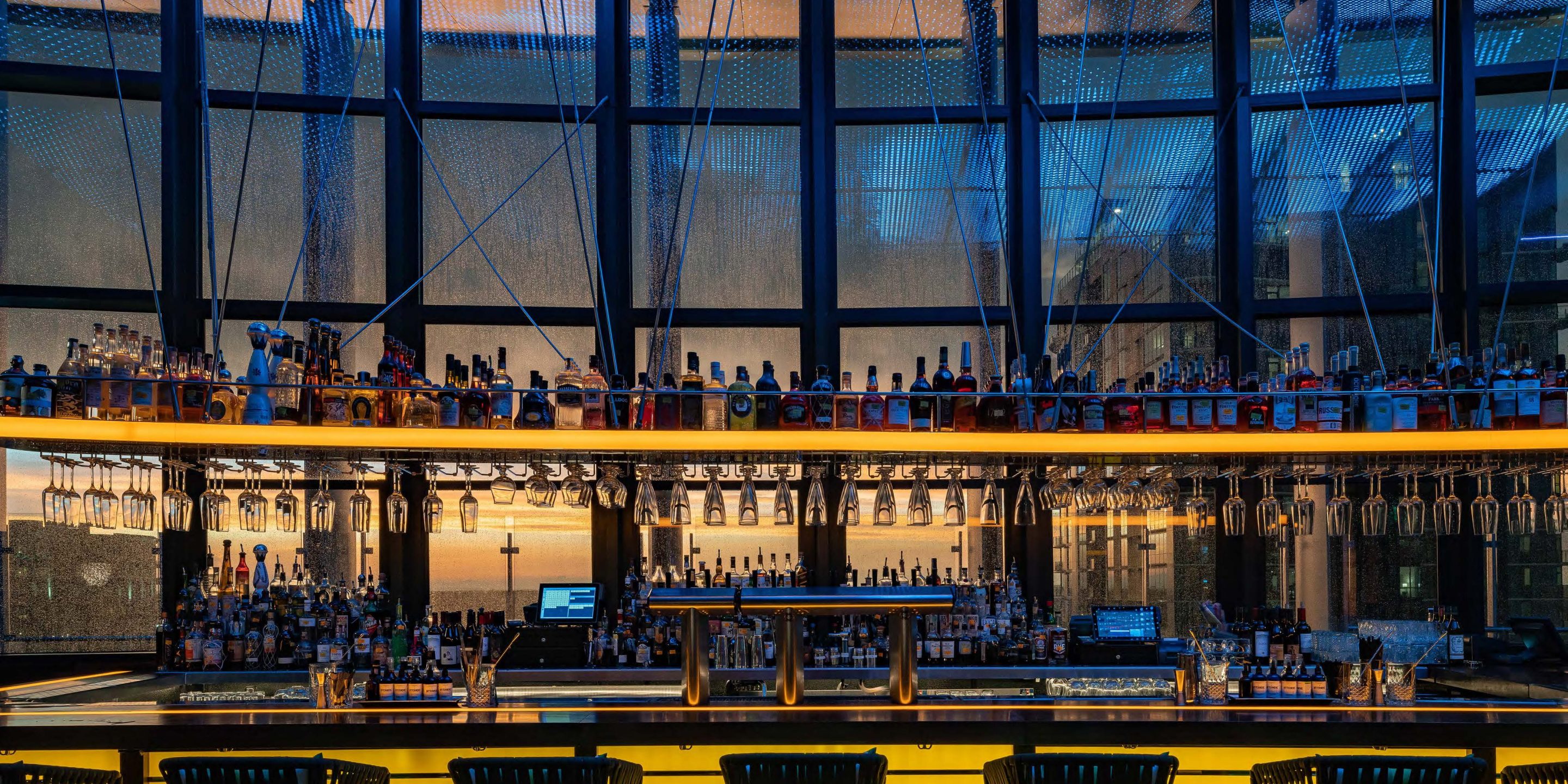 Merchant & Trade's design features include an exterior street entry with a glowing amber canopy and vortex fire feature. In-ground lights lead guests from the street entry to the rooftop-exclusive elevator that jets guests to the roof. The fire element repeats at the rooftop lounge with a large stone fireplace behind a walnut slab host stand accented with polished stainless steel. When guests exit the private elevator they are met with a perforated cloud-patterned ceiling backlit with LED lights that change colors, subtly transforming as the sun moves from a daylight scene to sunset to an evening sky. The bar has an amber-glowing bar die with a radiant, amber-glowing over bar shelf. It's positioned so that guests enjoying their beverages have an unobstructed view of the city below.