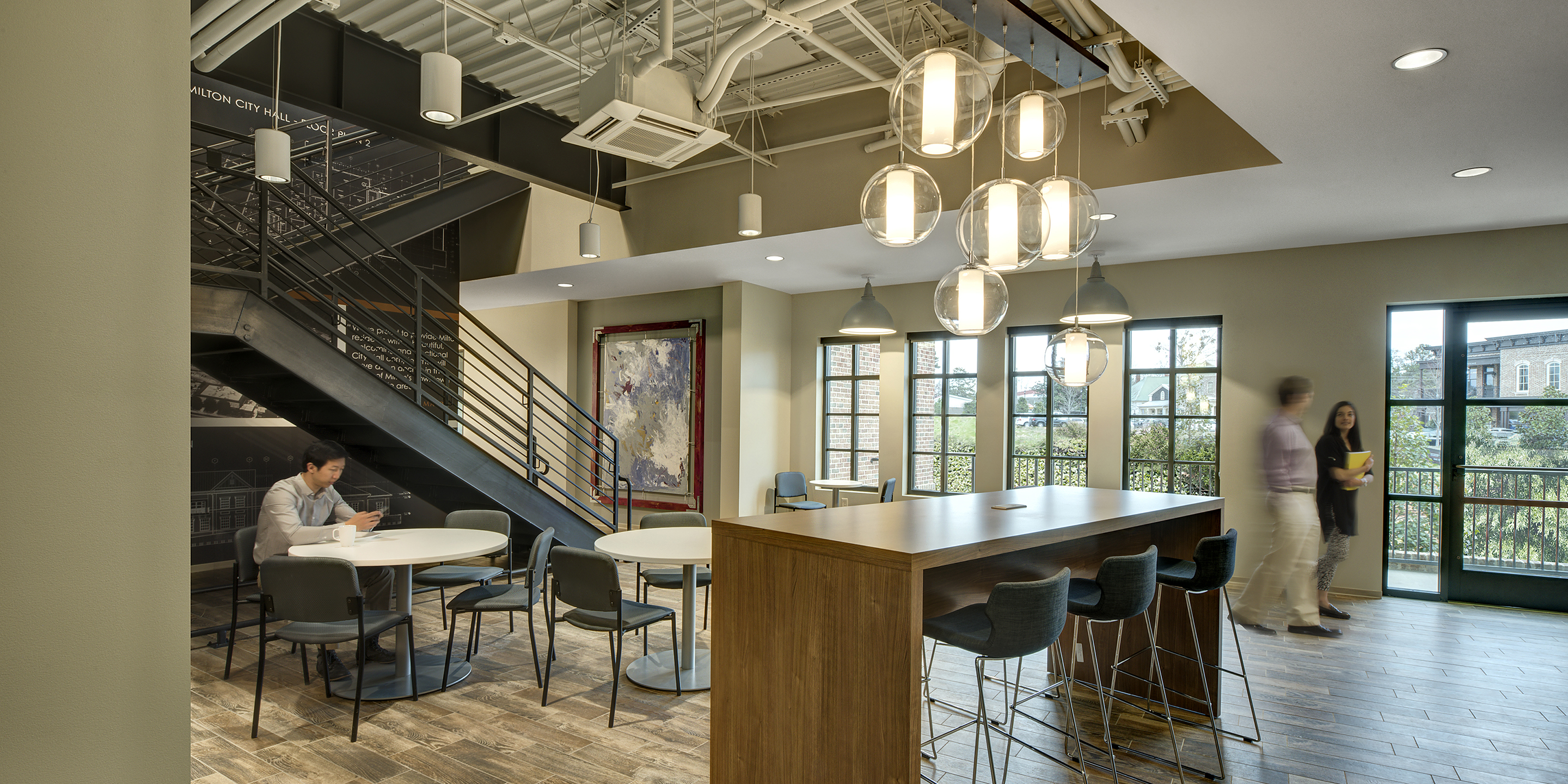 The site includes parking, a native landscape design and a large public plaza that facilitates outdoor events and festivals. Cooper Carry provided full architectural design, landscape/hardscape design, environmental graphic design, as well as workplace strategy and interior design services.