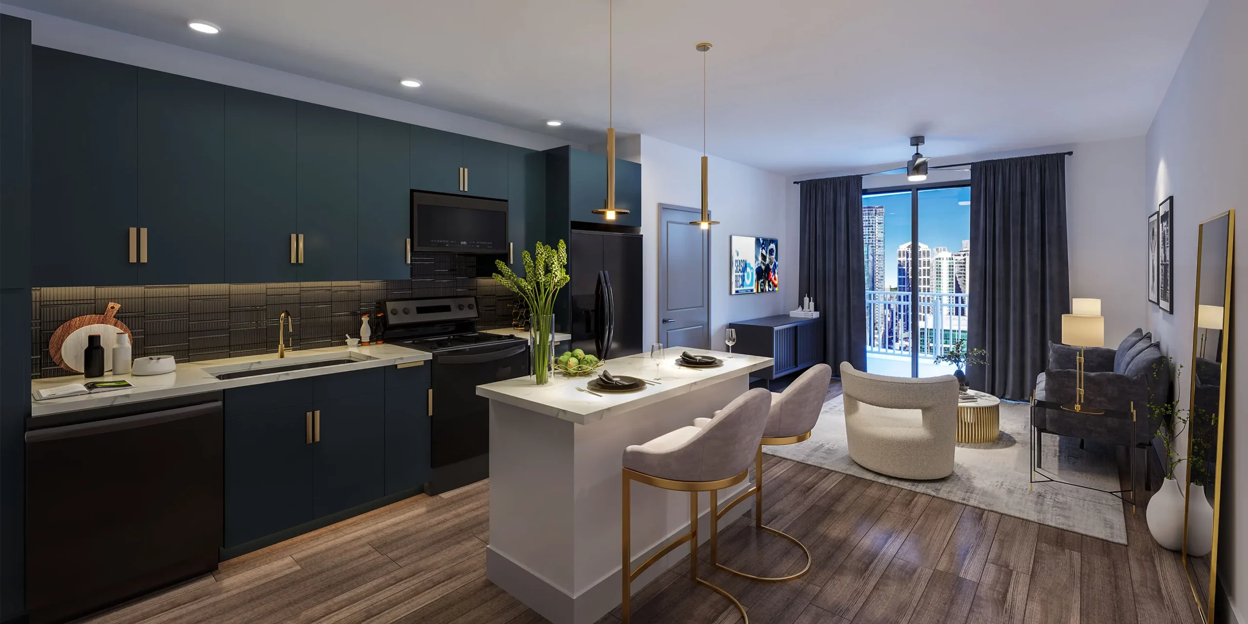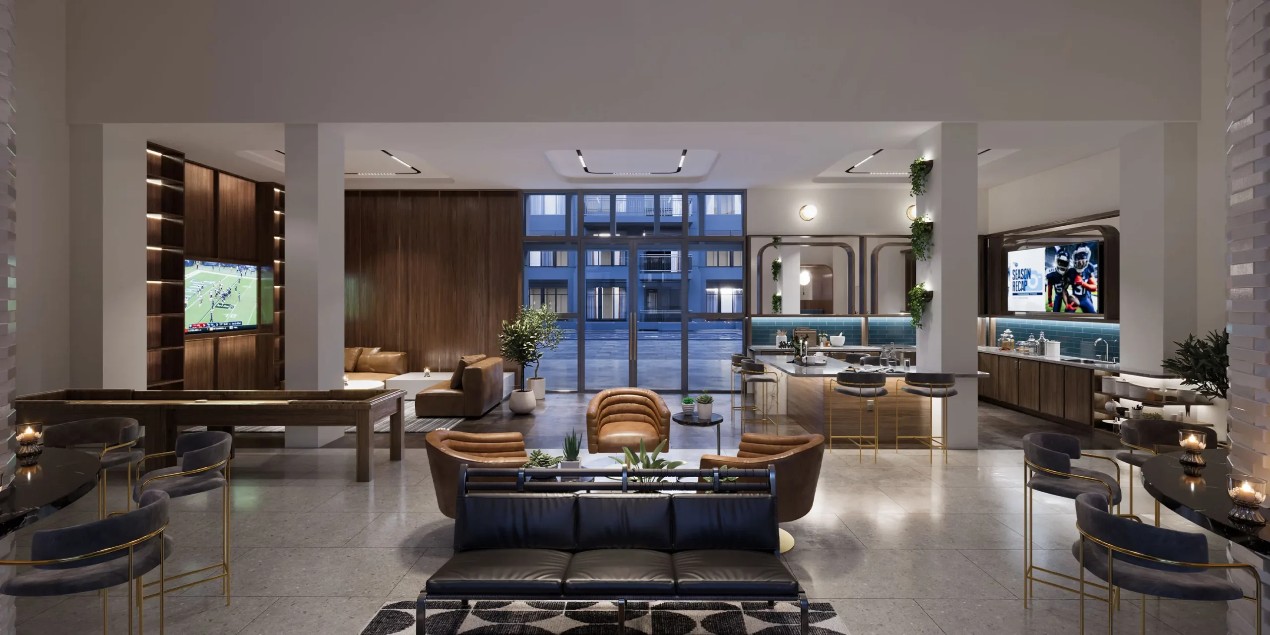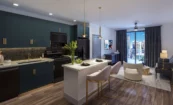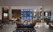 The interior design exudes luxury, with masculine tones such as brown, cream, maroon, and blue. Geometric forms add a dynamic interest to the upholsteries, including sofas and rugs. Sleek furnishings and custom-designed lighting differentiate the public areas from other competitors in the area. Multiple interior color palettes are provided in the units to offer future residents the choice of design to fit their personalities.