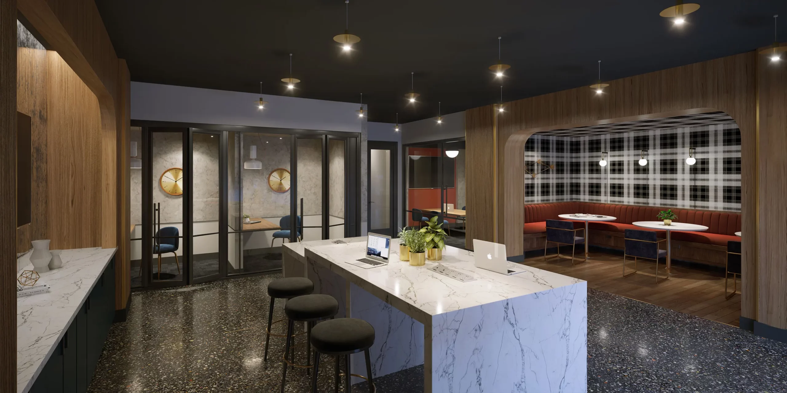 Amenities include co-working spaces with both individual pods for privacy and long marble tables for communal working and socializing. A clubhouse with a bar and lounge, outdoor pool, dog park, fitness center, and an indoor/outdoor rooftop lounge with city views are also planned for the community.