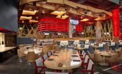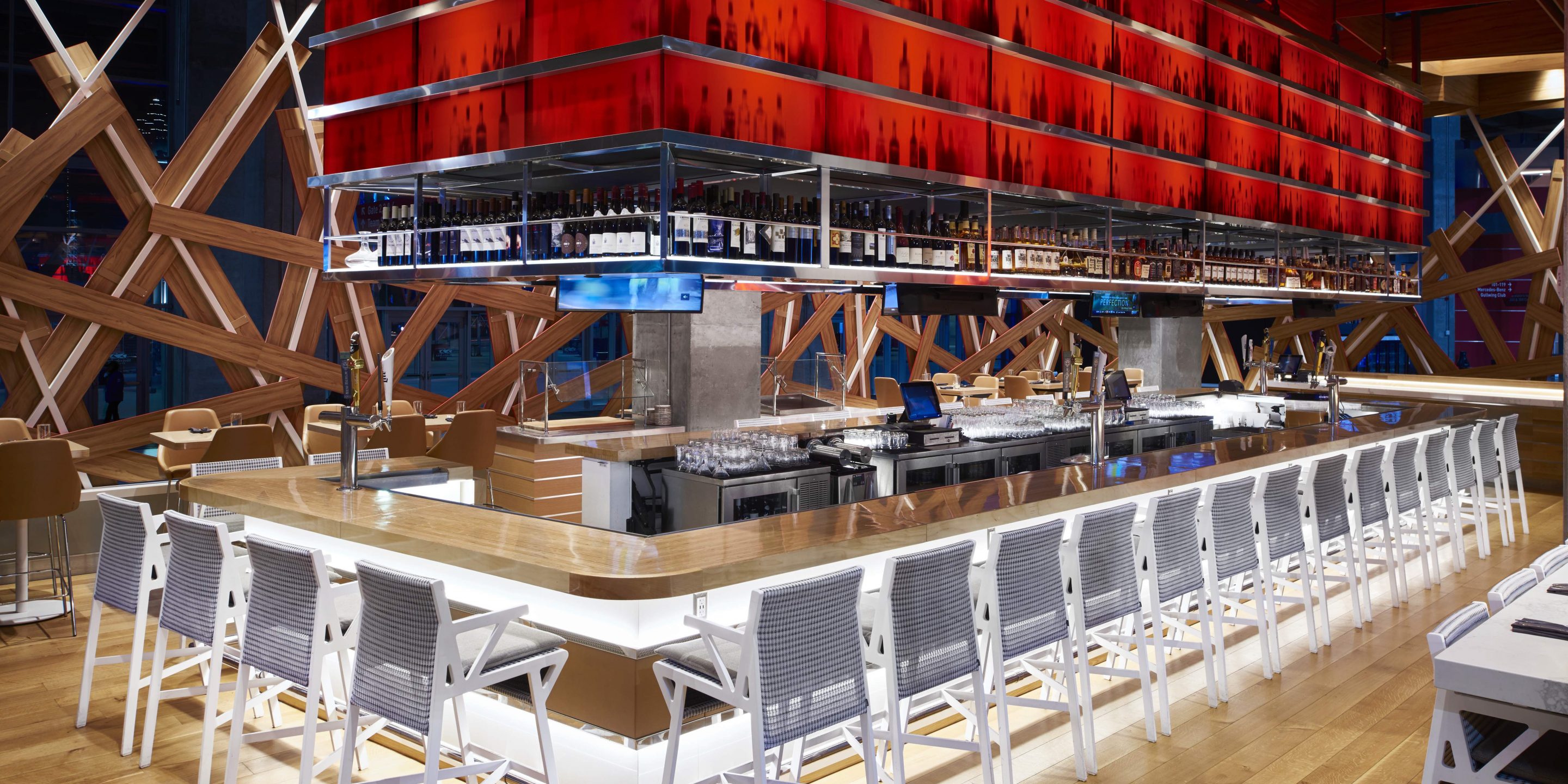 The high-profile restaurant is located just off the concourse and adjacent to one of the busiest entrances in the stadium, providing an excellent opportunity for visibility but also posing a challenge for the design team to create a somewhat protected venue. The team created a curved screen modeled after a bird's nest to envelop guests and add warmth to the expanse of concrete, steel and glass. The interior is highlighted with spots of Falcon's red. Highlighting the bar is a lighted focal point that also serves as bottle storage. This unique design can be seen throughout the stadium. Offering both traditional table seating, bar seating, and standing height tables, Molly B's offers guests an exciting and upscale dining experience while providing unparalleled views of the game.