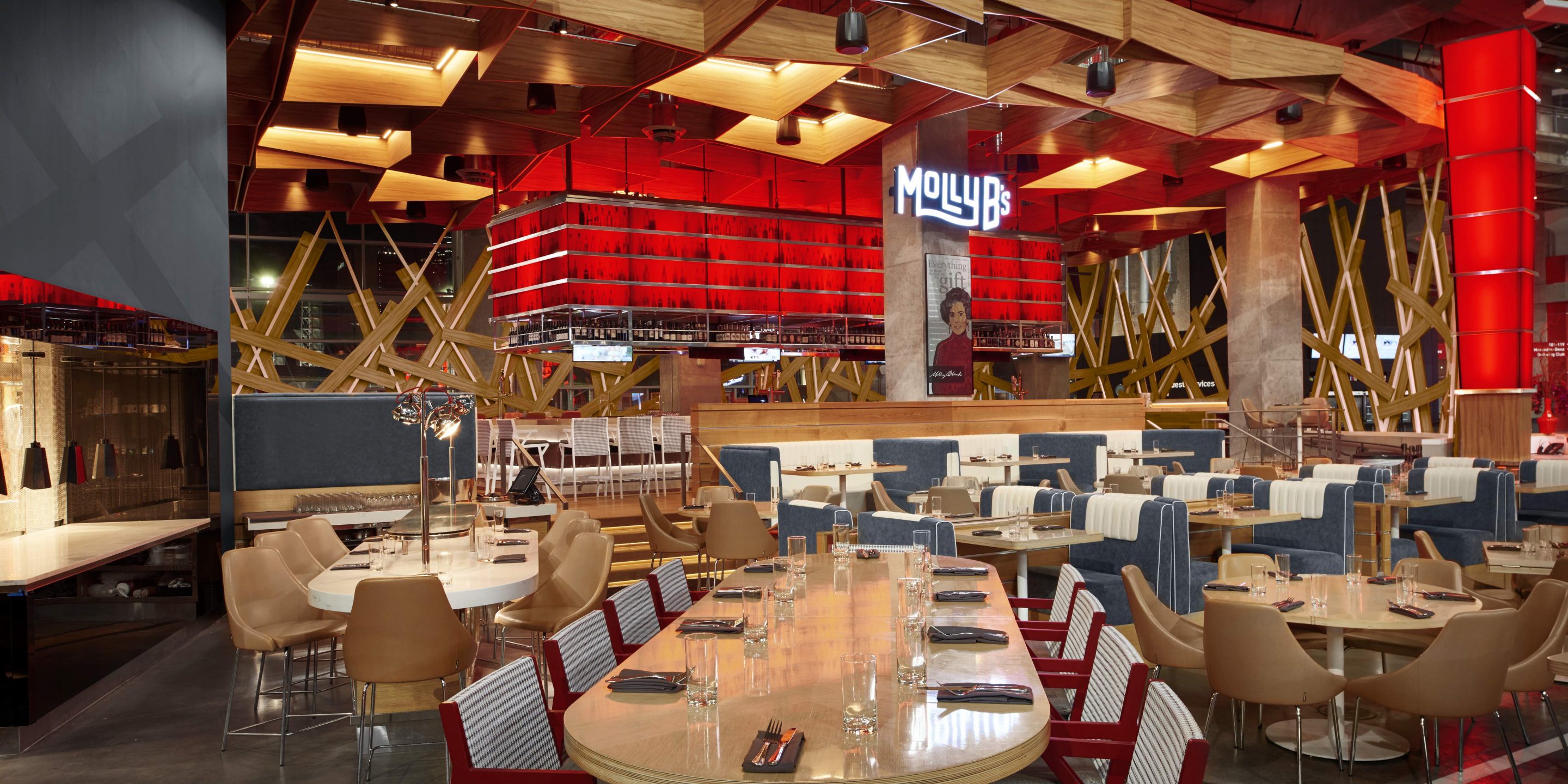 The Johnson Studio at Cooper Carry was chosen to design this new signature restaurant at Mercedes-Benz Stadium in downtown Atlanta. Named after the mother of Arthur Blank, the owner of the Atlanta Falcons, Molly B's offers sweeping views of the new and innovative stadium that serves as the official home of two teams, the Atlanta Falcons and Atlanta United, and numerous entertainment events.