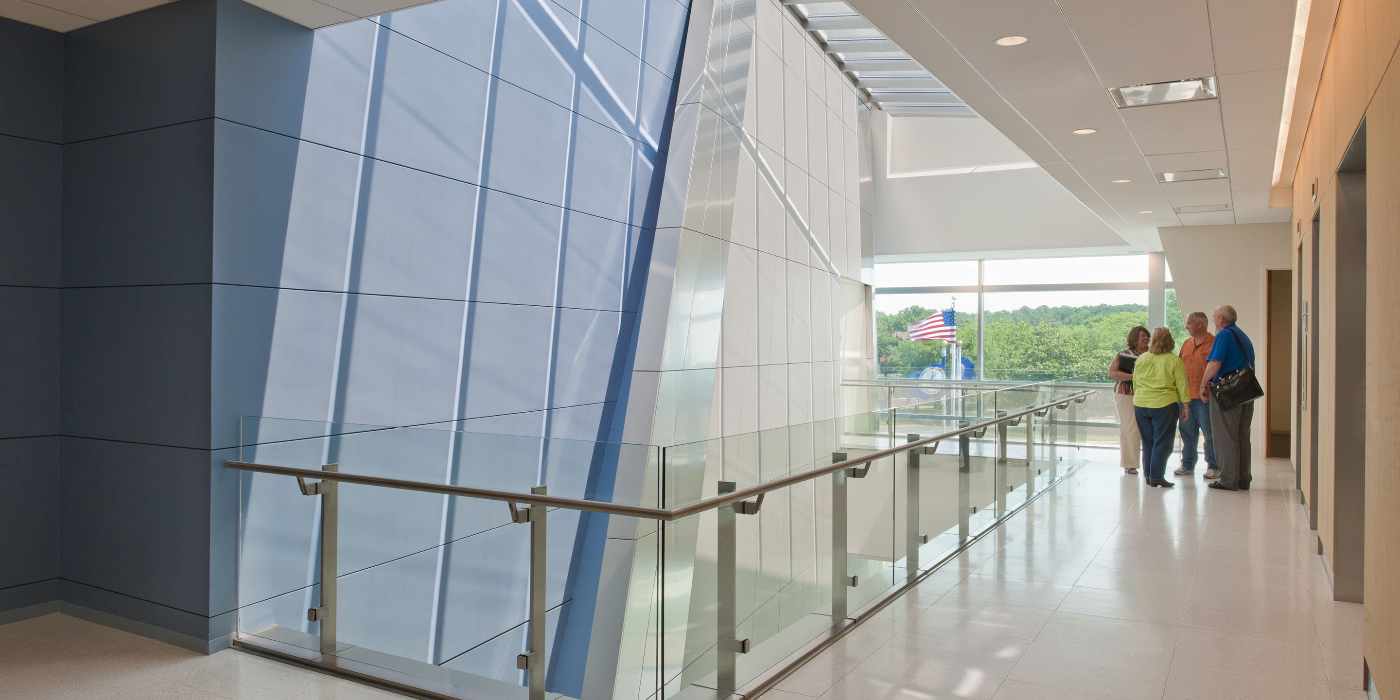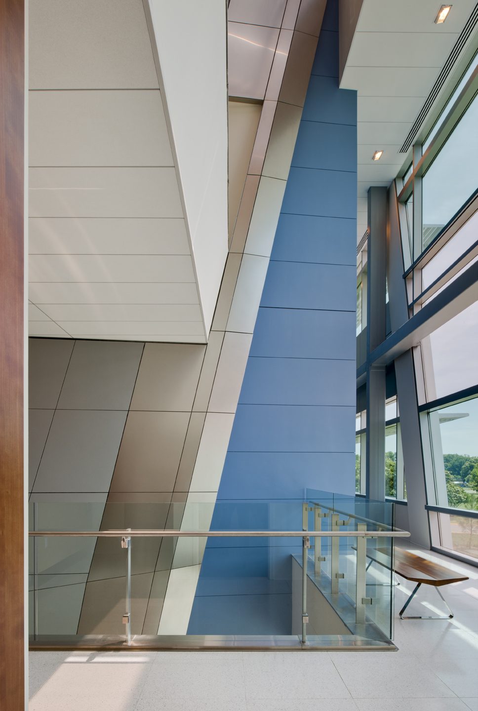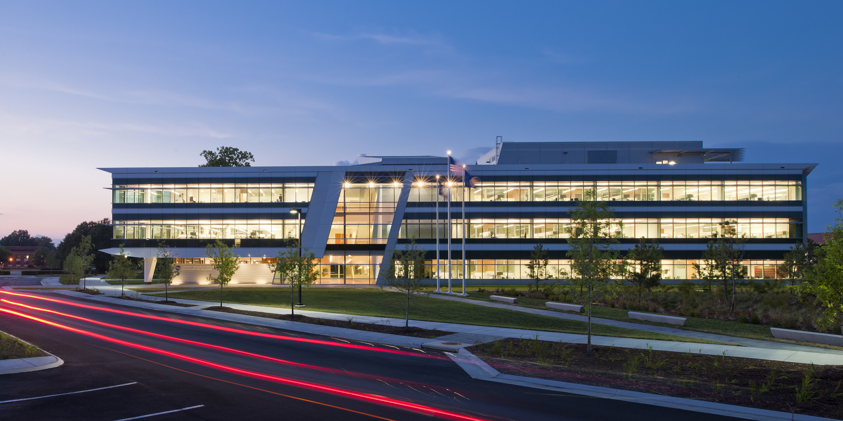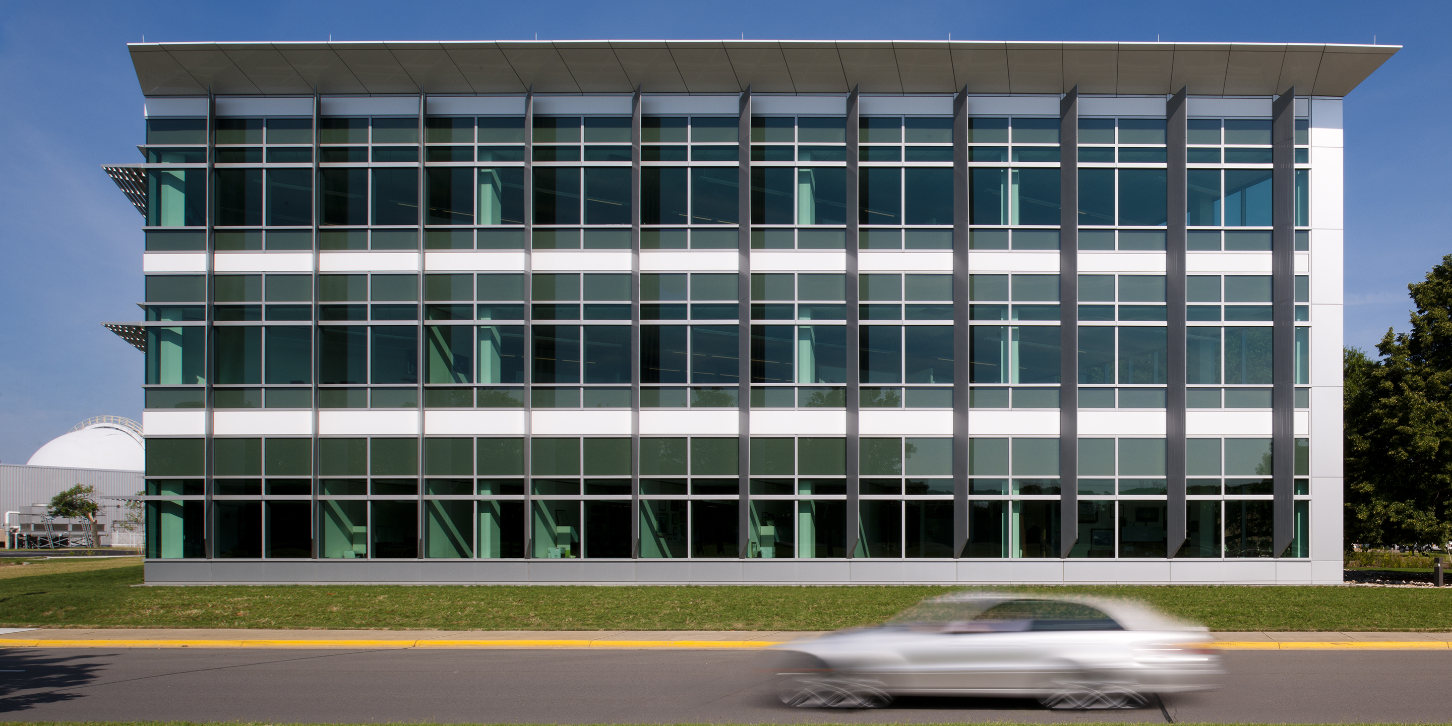 New Town is the densification of NASA’s oldest research center in Hampton, Virginia. NASA looked to the U.S. General Services Administration (GSA) Region 3 to help them plan for six buildings, through GSA’s Design Excellence Program, so they could consolidate inward from buildings that are well over 50 years old. Cooper Carry was selected as the Architect of Record as part of the GSA’s Design-Excellence Design-Build program. This 75,000 gross square foot, three story, all glass and metal panel building is the new home for the Center’s Director, her team, and five other departments. In adhering to NASA’s directive to be sustainable along with a required service life of 40 years, our team proposed a better than LEED Gold rating, ultimately achieving Platinum, through innovative solutions. Cooper Carry’s Environmental Graphics team developed an interior and exterior sign system to be used over the entire New Town. Using materials found throughout the building, the design reflects the mission of the Langley Research Center of exploring earth, atmosphere and space.