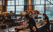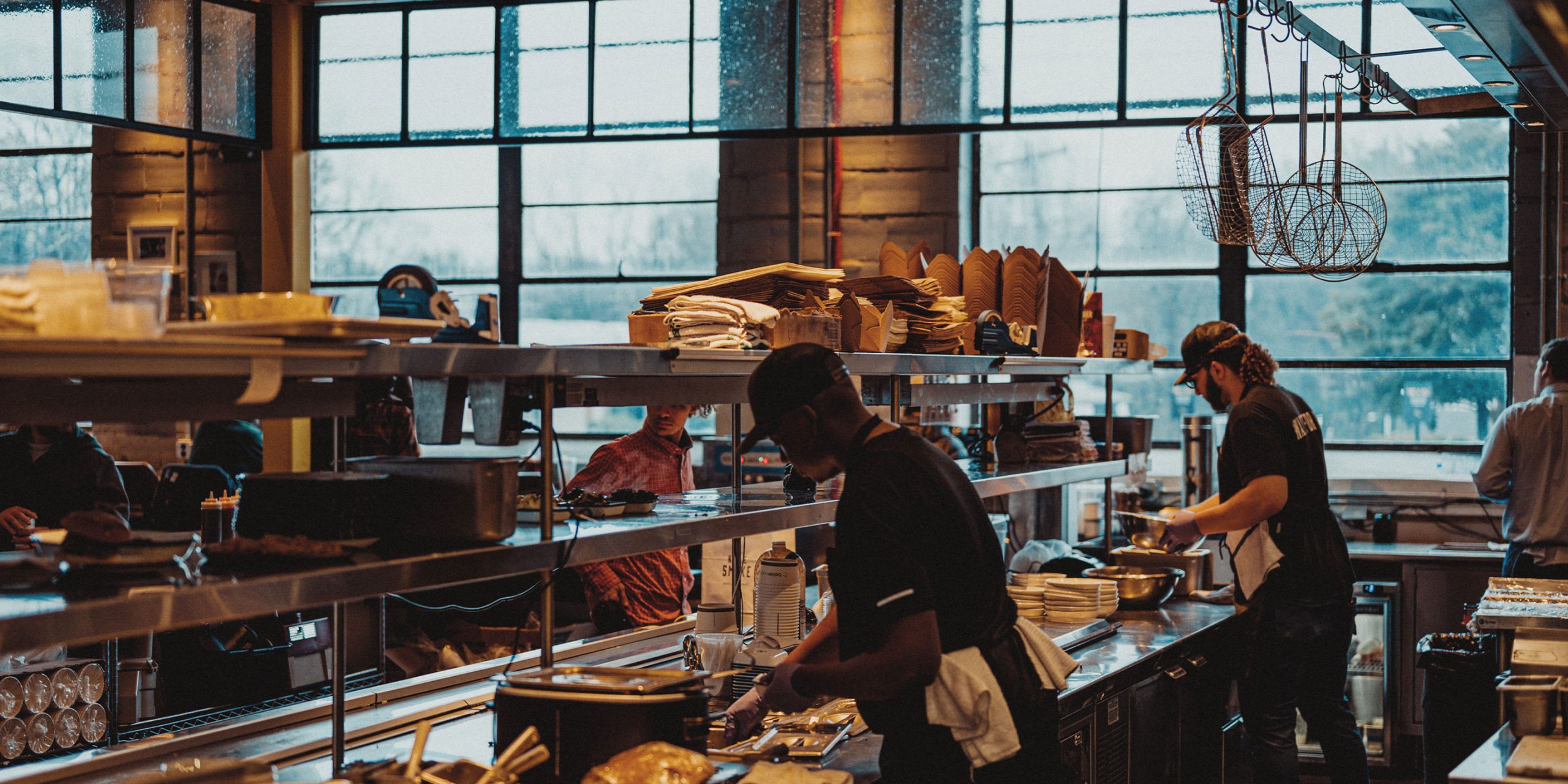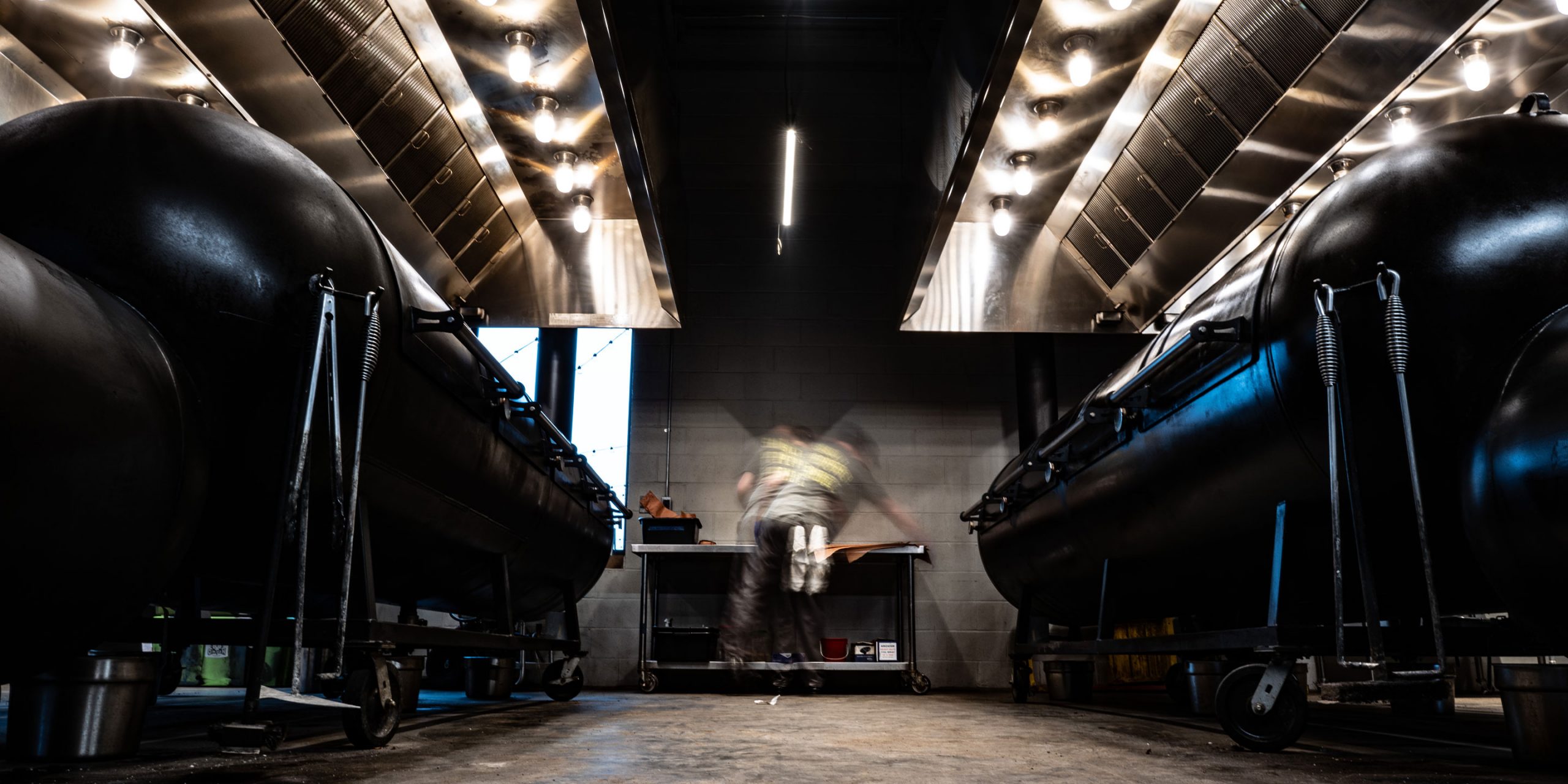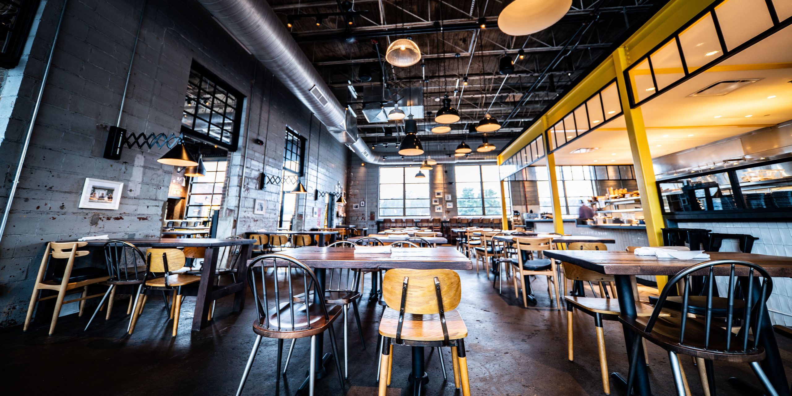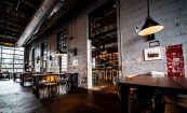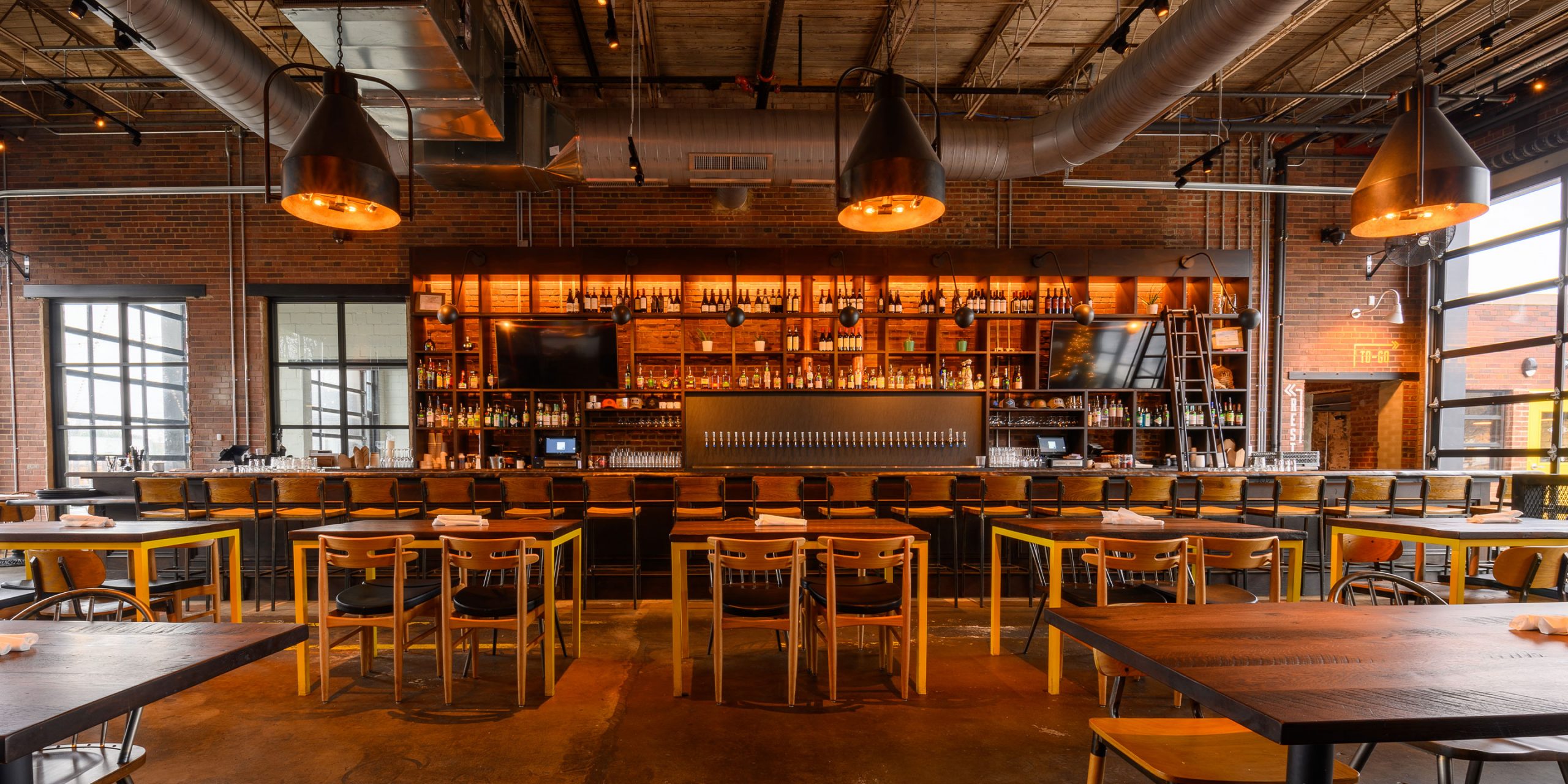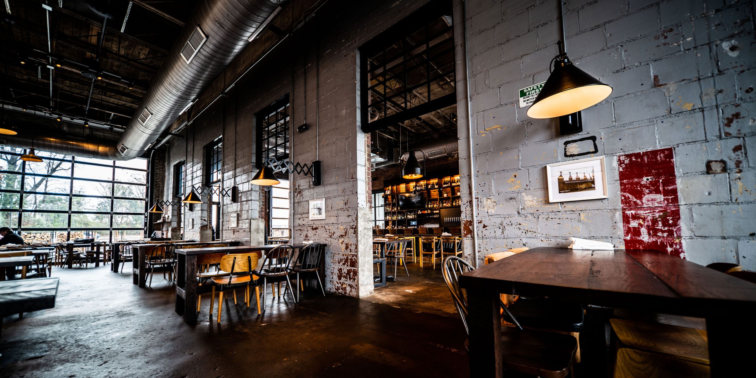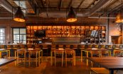 Noble Smoke is housed in a building built in 1953 by WH Transit as a maintenance facility for trucks, with huge garage bays and soaring 20-foot ceilings. Now the historic building has been reimagined into an eclectic take on a barbeque experience. The design concept emphasizes holding on the decades of use of this space. The industrial style, cast iron pendants hanging over the dining area near the kitchen are dated mid-20th century and were shipped over from Amsterdam. The open kitchen features a chopping block front and center, surrounded by a 23-seat legends counter to honor the Southern BBQ greats both past and present.
