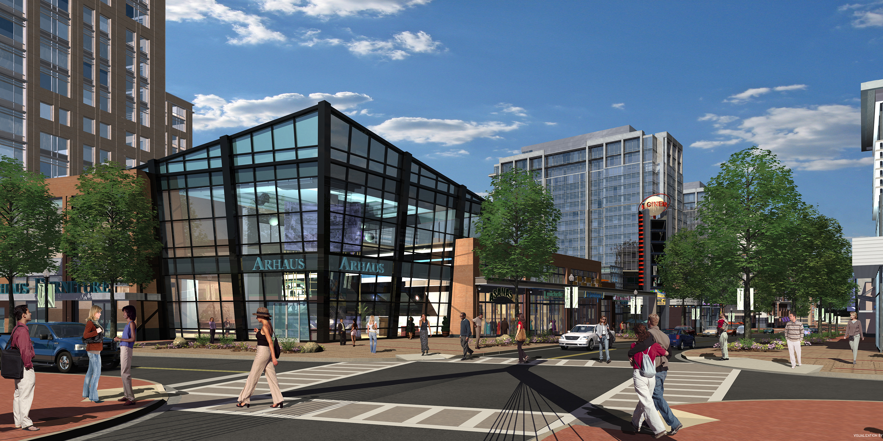 In the spirit of the Washington region’s increasingly compact growth, LCOR Inc., retained Cooper Carry to master plan a transit-oriented development on LCOR property at the White Flint Metrorail Station in Bethesda, Maryland. In conjunction with WMATA, LCOR reclaimed 20 acres of land that included natural woods and commuter surface parking to create a Main Street mixed-use development. The program includes 928,000 square feet of office space; 202,000 square feet of retail space; and a 220,000-square-foot Westin Hotel. An additional apartment tower with 1,275 units is currently under construction, along with a Harris Teeter grocery store. The development sits off Rockville Pike, which originates as Wisconsin Avenue in Georgetown. The site is bounded on the North and South by Old Georgetown Road and Marinelli Road, sitting due east of the new Montgomery County Conference Center. A bridge from Rockville Pike crosses the Metrorail line to tie into the pedestrian-friendly Main Street. The street is bounded by a natural forest preserve, and culminates in a residential community green.