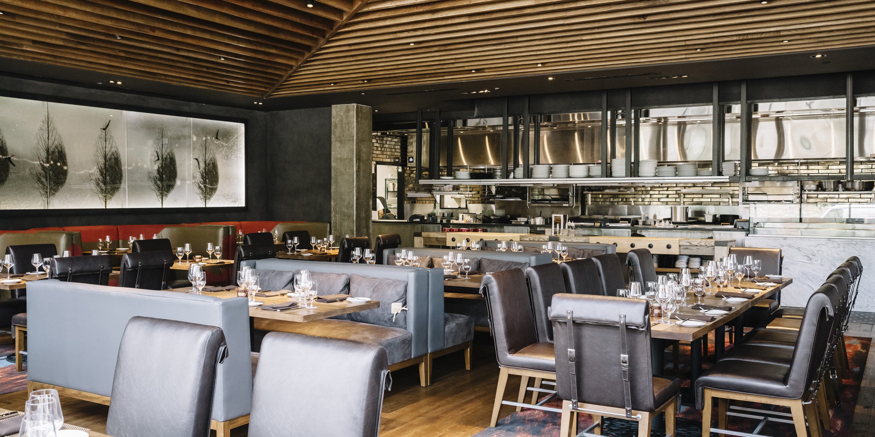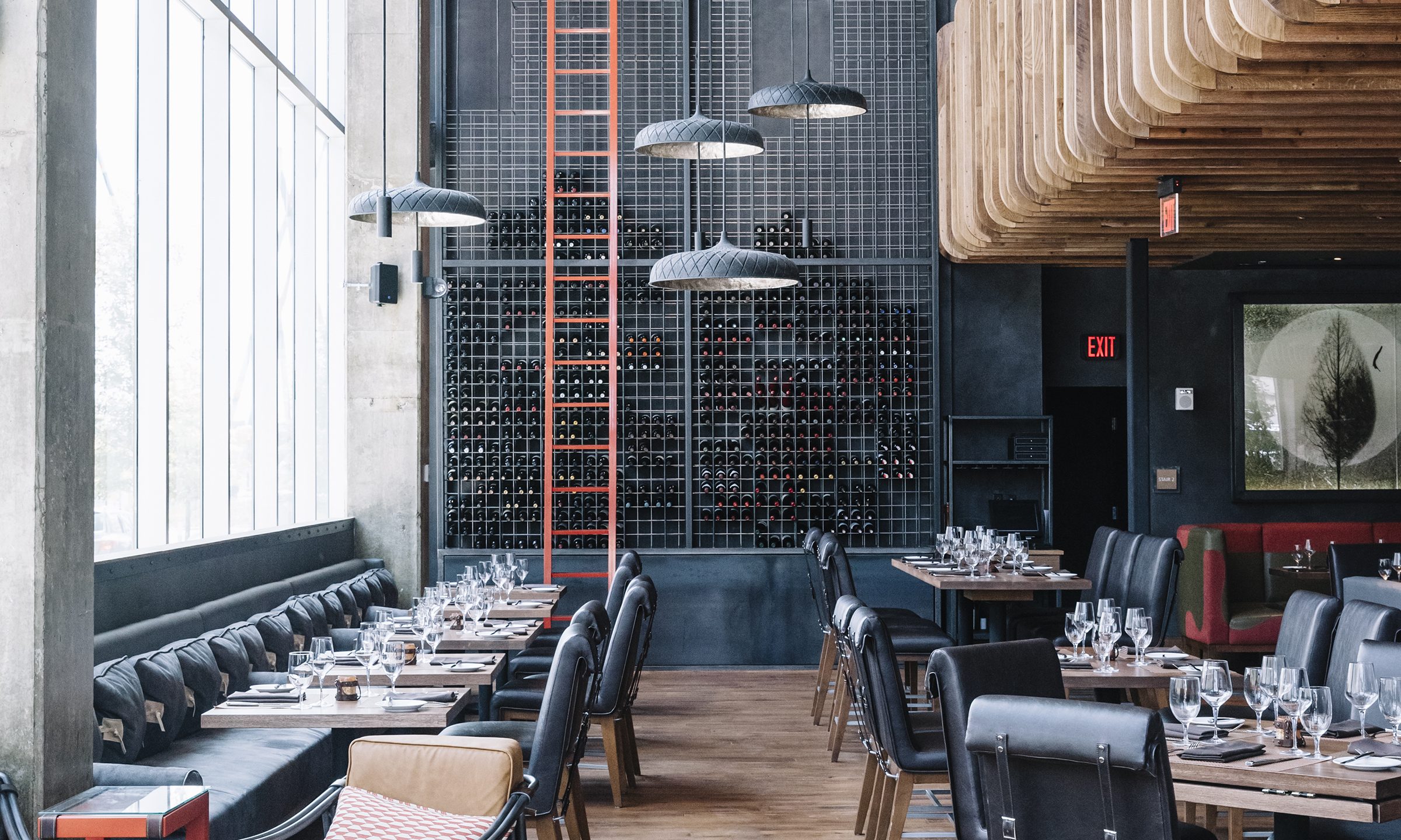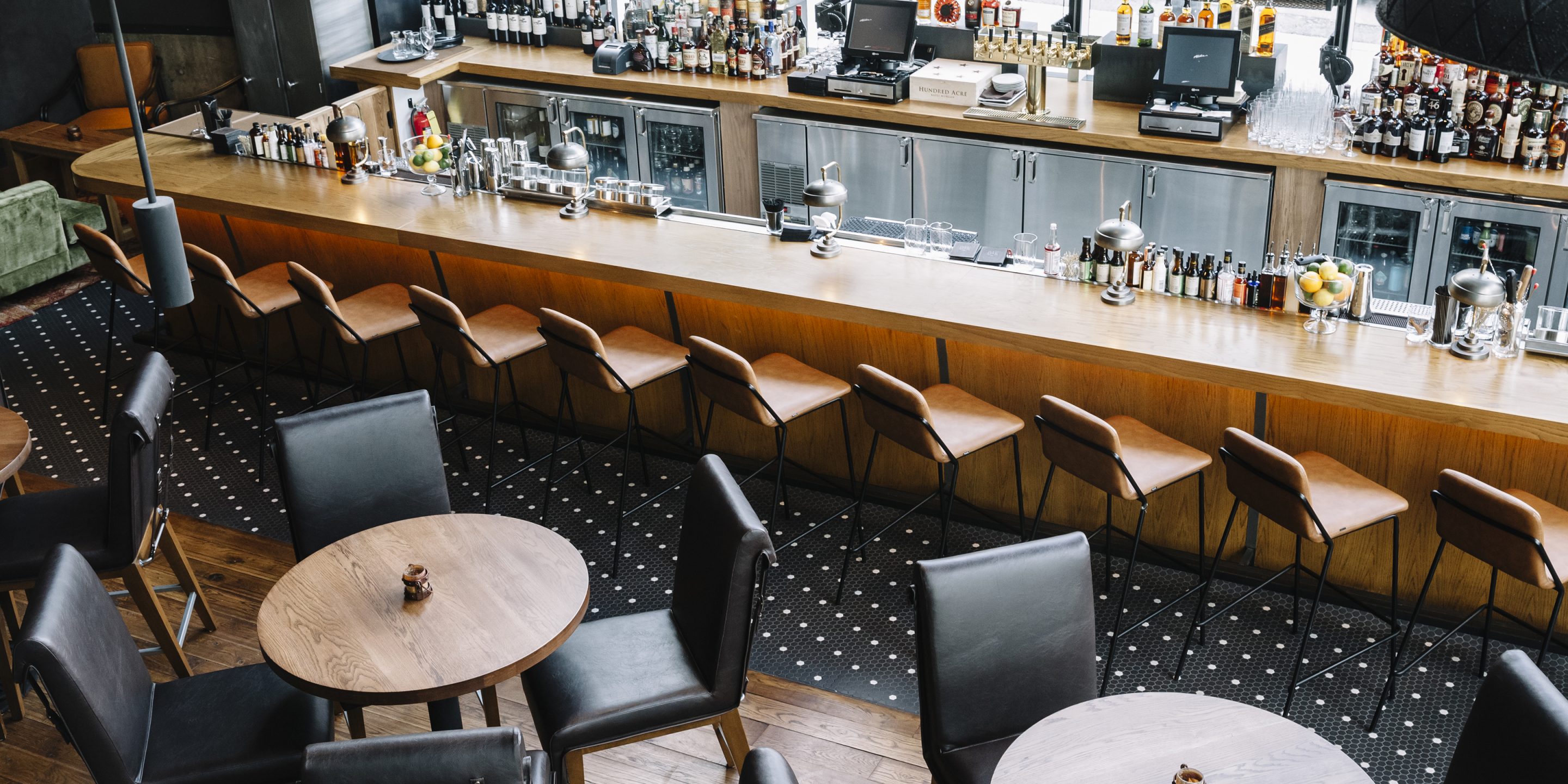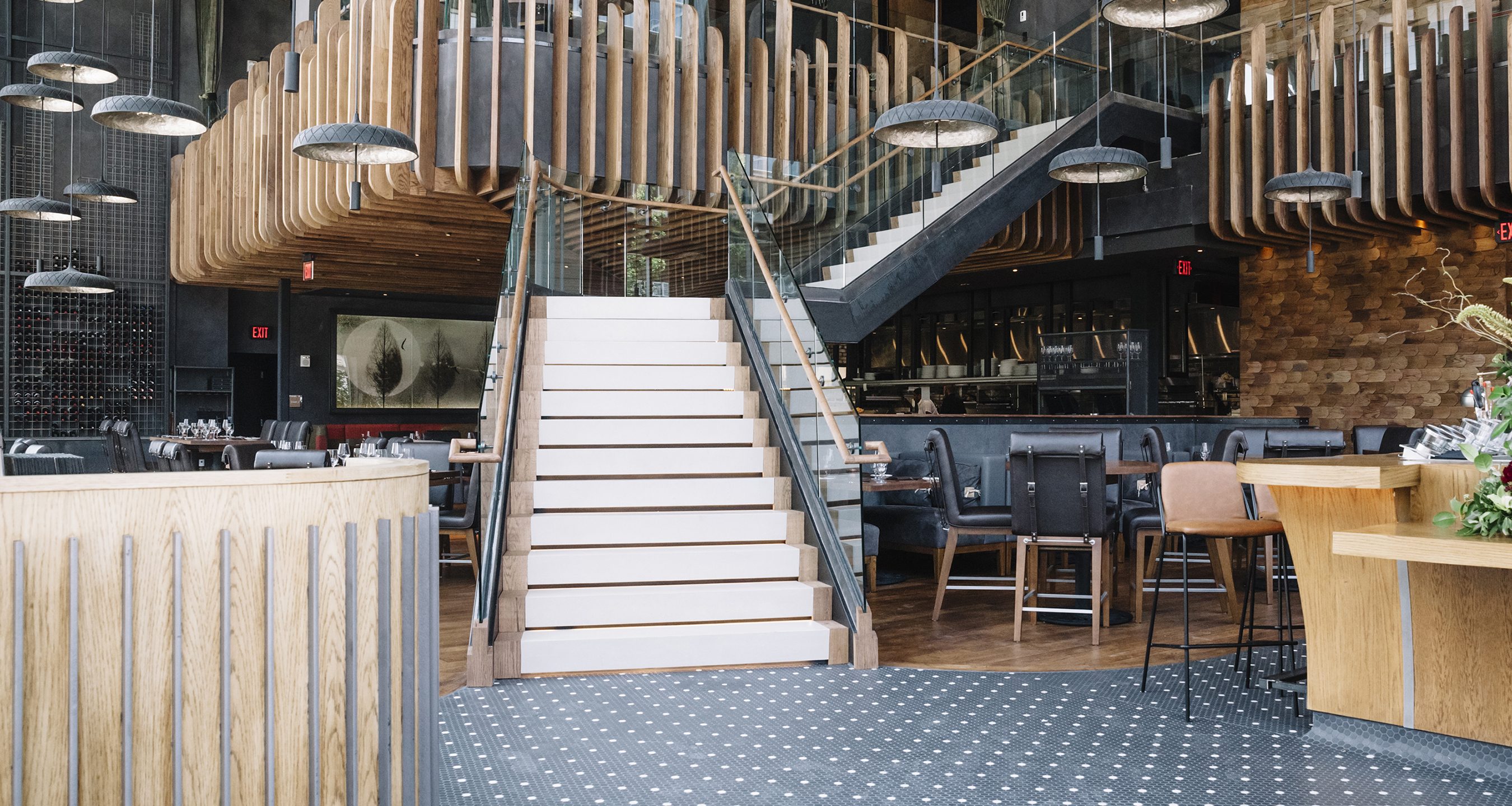 Oak Steakhouse, located adjacent to the Westin hotel in downtown Nashville, is a dramatic two-level space with soaring 35-foot ceilings. The Johnson Studio's design concept is an inverted oak tree with its "roots" turned upward to cradle the upper mezzanine dining room with abstract "dropping acorn" pendant lights. With only one species of oak used throughout, as well as 100-year-old reclaimed wood, the space gives a rustic nod to Nashville's western heritage. The design commits fully to the arboreal theme with 'bark'-inspired shapes and furnishings. A gleaming marble raw bar is dotted with 25' custom pendant lights and pewter accents. An open expo kitchen with a 2-foot custom butcher block table puts the chef on display and adds activity to the room. Various seating groups include u-booths, loose tables, bespoke settees and a banquette along the window to provide different options for guests. The slick oak bar features operable back bar baskets that move top-shelf liquor up and down as needed. Mechanical cranks, steel baskets and racking all created by a local Nashville metal artisan add authenticity and grit to the otherwise refined restaurant. Together the design elements create a restaurant that is striking yet comfortable.
