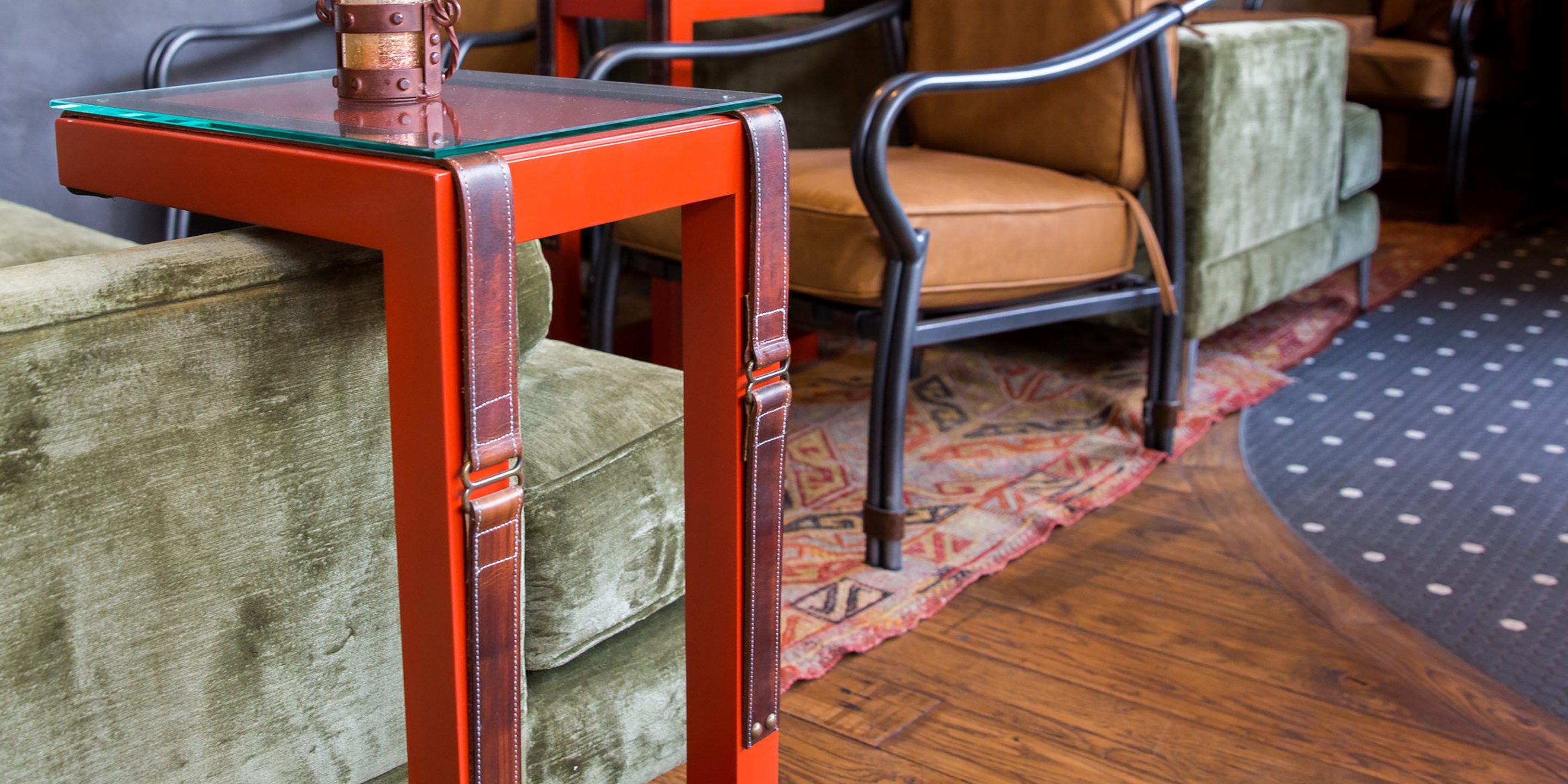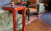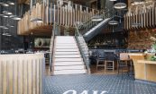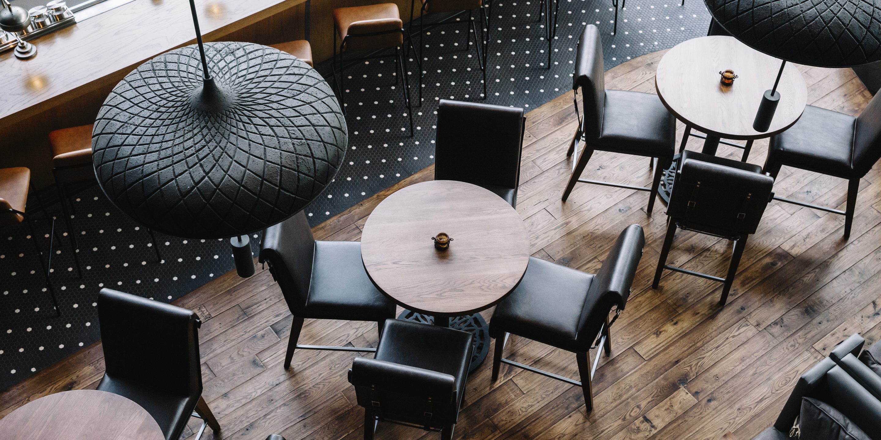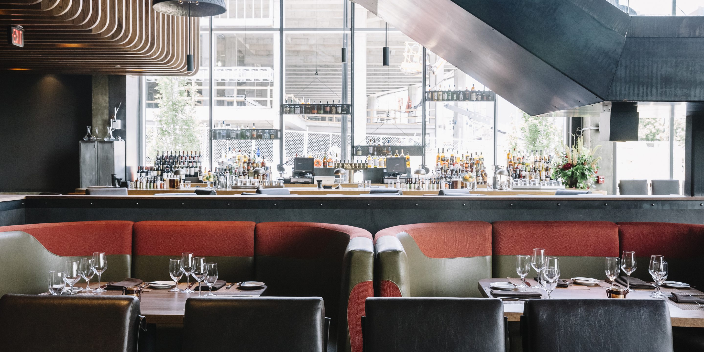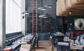 Oak Steakhouse, located adjacent to the Westin hotel in downtown Nashville, is a dramatic two-level space with soaring 35-foot ceilings. The Johnson Studio's design concept is an inverted oak tree with its "roots" turned upward to cradle the upper mezzanine dining room with abstract "dropping acorn" pendant lights. With only one species of oak used throughout, as well as 100-year-old reclaimed wood, the space gives a rustic nod to Nashville's western heritage. The design commits fully to the arboreal theme with 'bark'-inspired shapes and furnishings. A gleaming marble raw bar is dotted with 25' custom pendant lights and pewter accents. An open expo kitchen with a 2-foot custom butcher block table puts the chef on display and adds activity to the room. Various seating groups include u-booths, loose tables, bespoke settees and a banquette along the window to provide different options for guests. The slick oak bar features operable back bar baskets that move top-shelf liquor up and down as needed. Mechanical cranks, steel baskets and racking all created by a local Nashville metal artisan add authenticity and grit to the otherwise refined restaurant. Together the design elements create a restaurant that is striking yet comfortable.