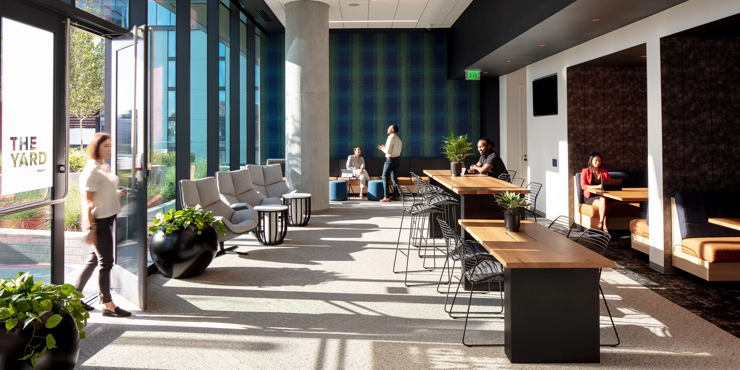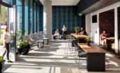 Knowing how biophilic design can improve occupants’ health and well-being, we ensured a strong connection back to nature. Interior greenery mimics the exterior landscape and creates refuge around the lobby seating. The material palette uses natural materials like stone, warm white oak, and an abundance of plants, and biophilic patterns can be found throughout the space, such as in the wood-style metal panel ceiling.