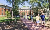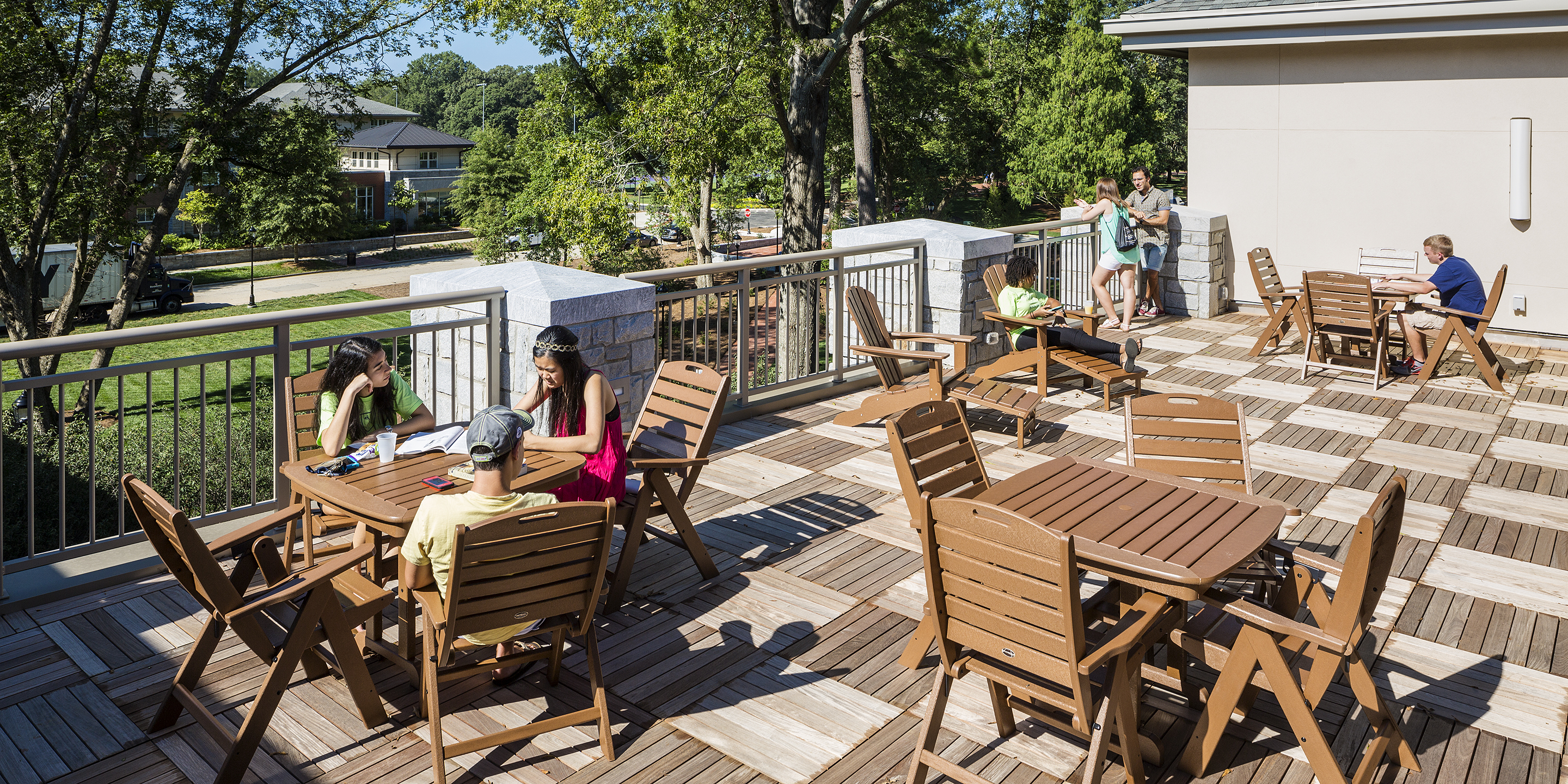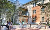 The first floor features a large lobby, living room, and lounge space. A tech lounge and gym facility on the second floor overlooks the two-level lobby and gathering space. The third floor has a large outdoor roof terrace with views of the Historic Quad, including direct access to an adjacent kitchen for social functions.