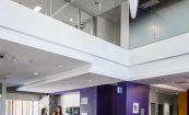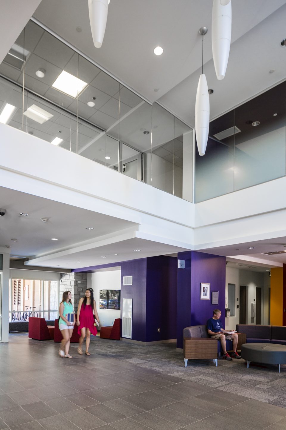 Spaces are arranged and sequenced throughout the building to encourage students to get out of their rooms and interact to enrich their college experience and promote wellness. To promote student interaction, Fleming Hall includes several spaces at a variety of scales. Each floor has two study lounges, and two laundry rooms, one in each wing.