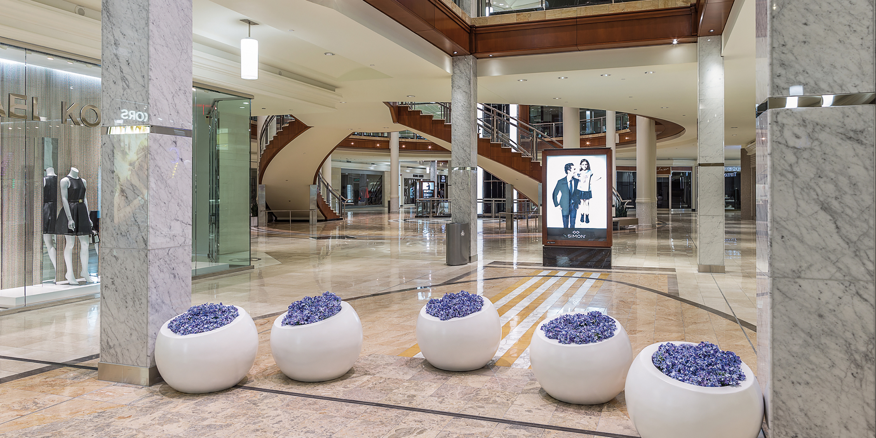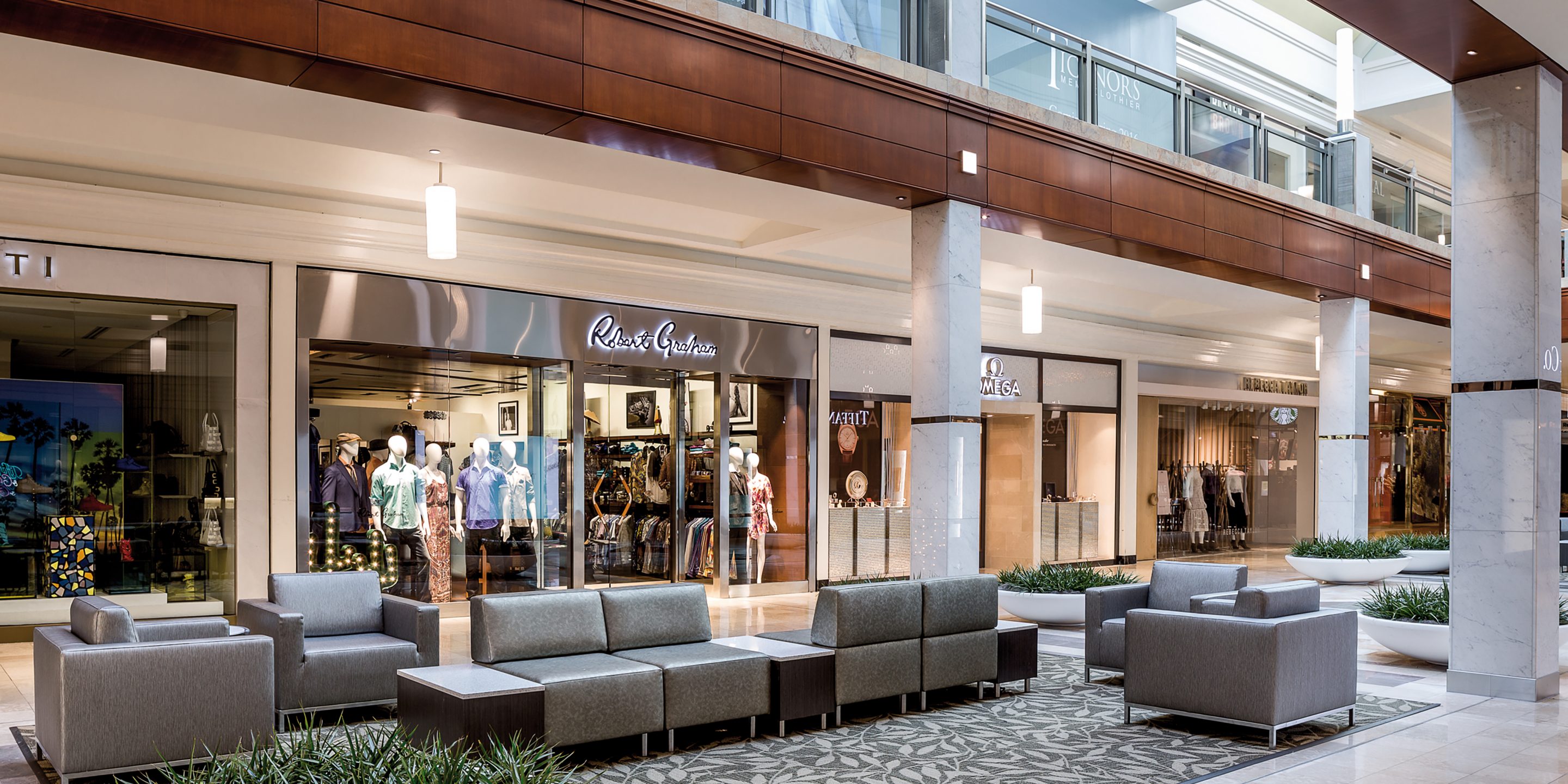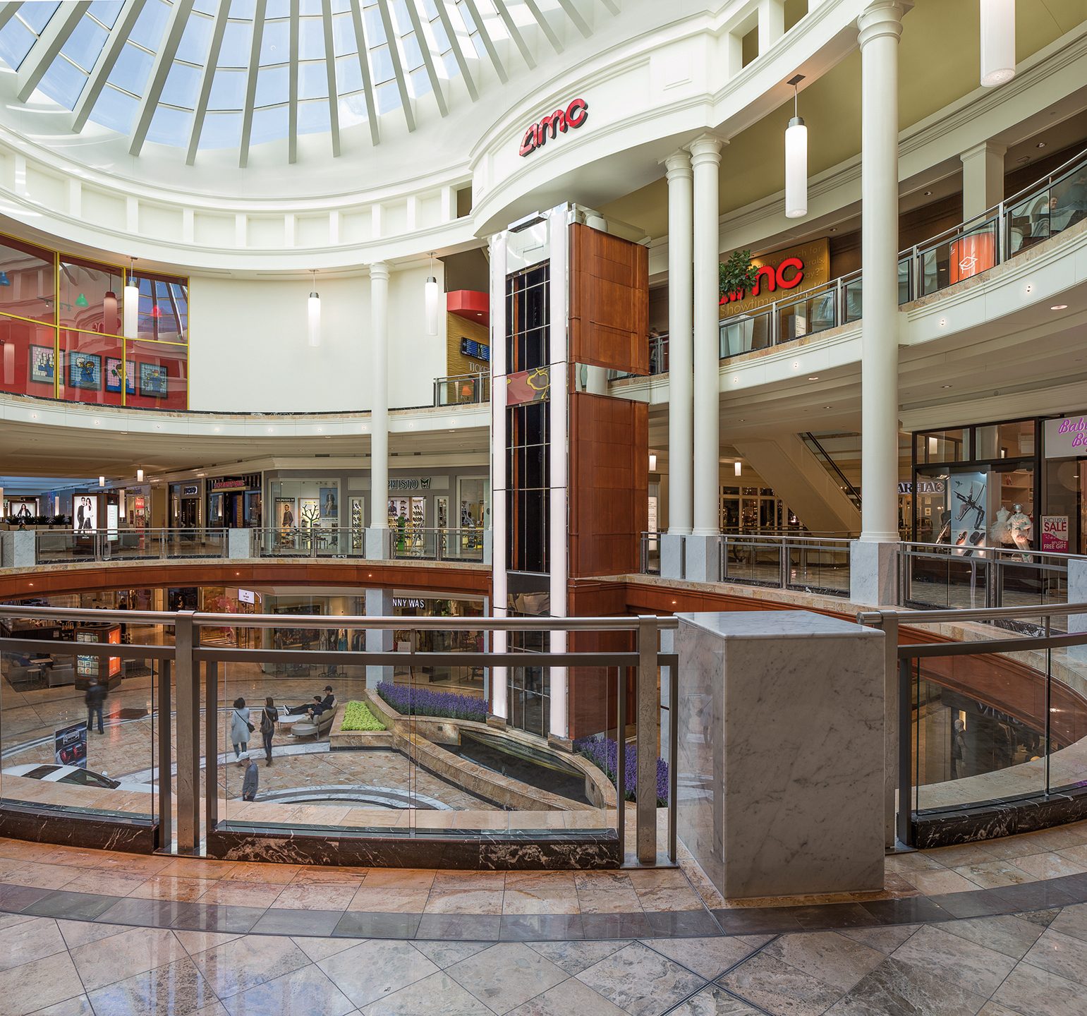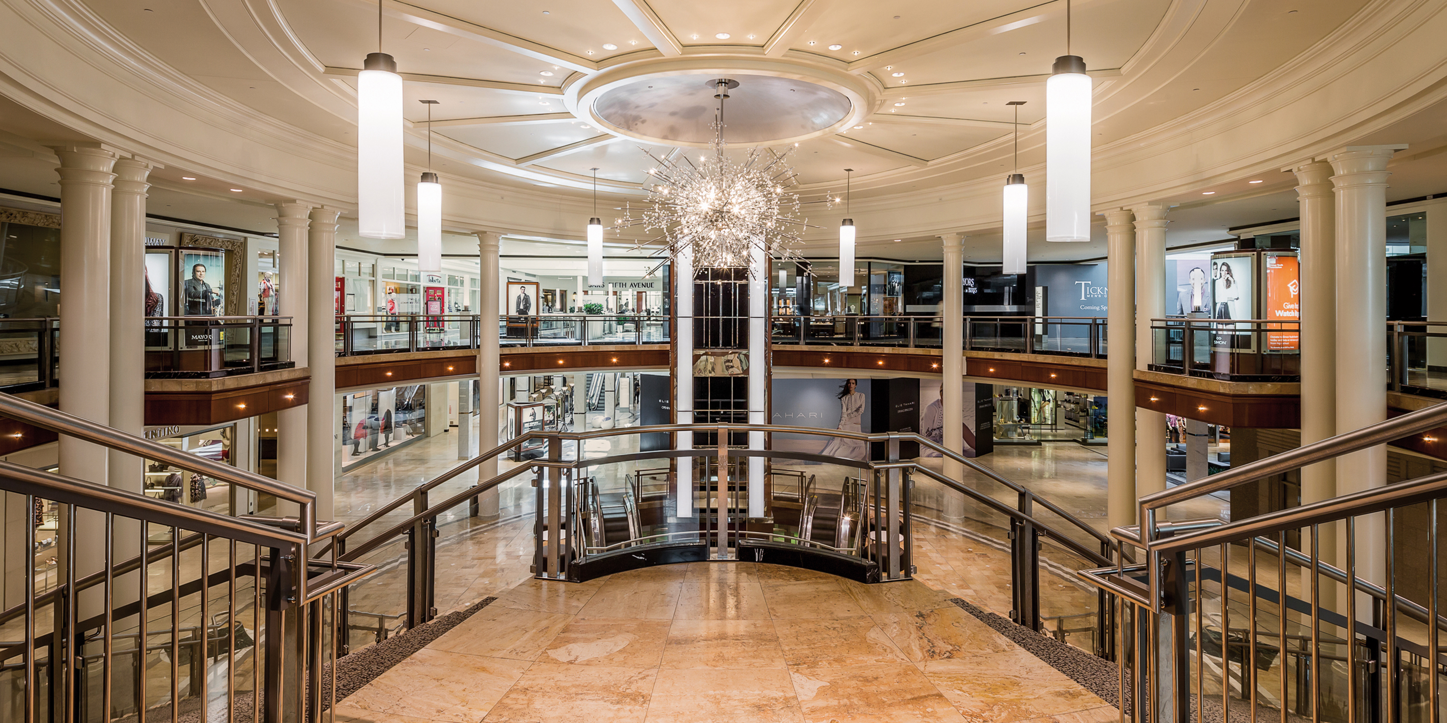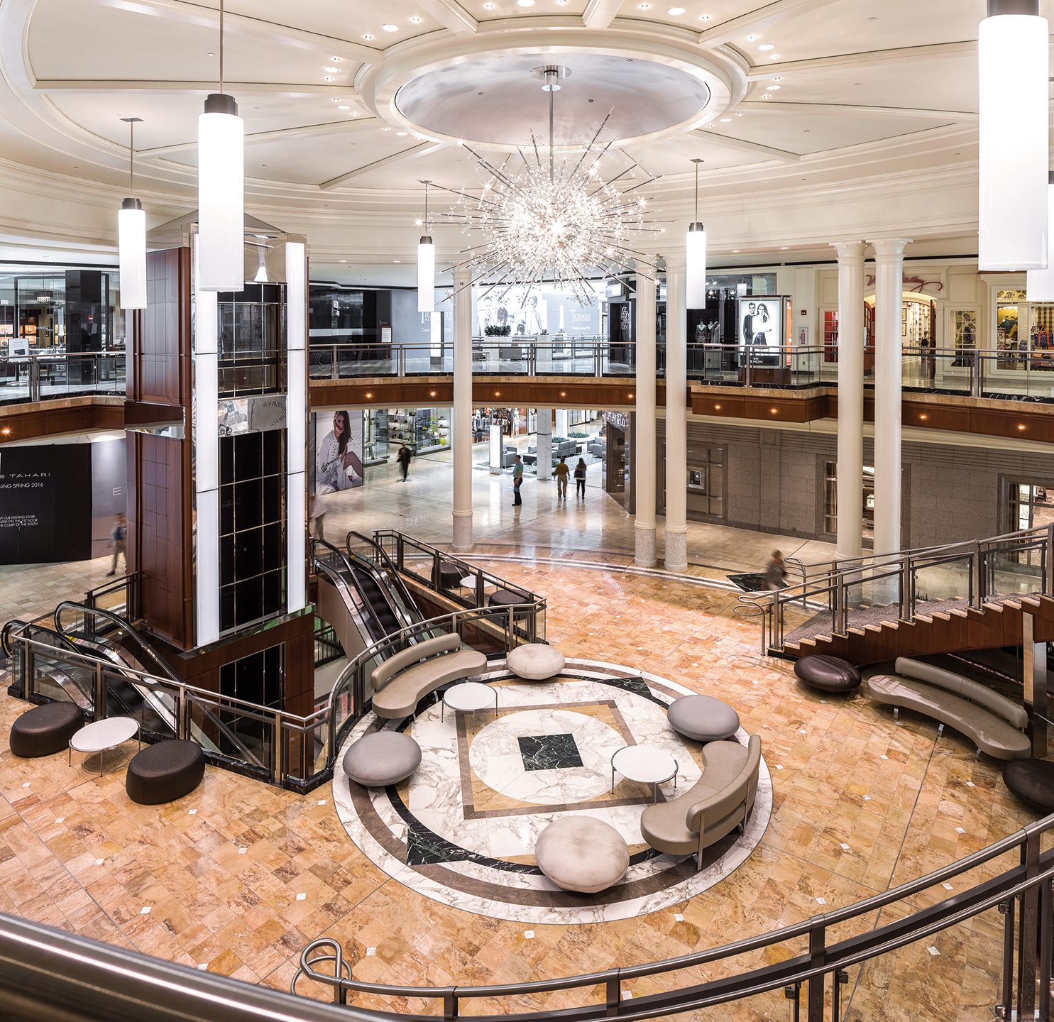 Cooper Carry’s retail designers realize people linger longer and shop longer when they are wrapped in an inviting, visually appealing environment. The experience begins the moment they arrive. The design team focused attention on the parking deck vestibules, brightening them up and making the area more visually inviting. Once inside the mall, much of the brass fixtures and surfaces will be replaced with stainless steel finishes, appealing to the more modern shopper. Lighting is paramount to the shopping experience, and our designers took it to the next level with modern fixtures and re-direction of the light sources to greatly enhance the shoppers’ experience. Custom light sculptures and LED light cylinders will replace the existing torcheres, complemented by LED recessed pin lights and LED can lights throughout.