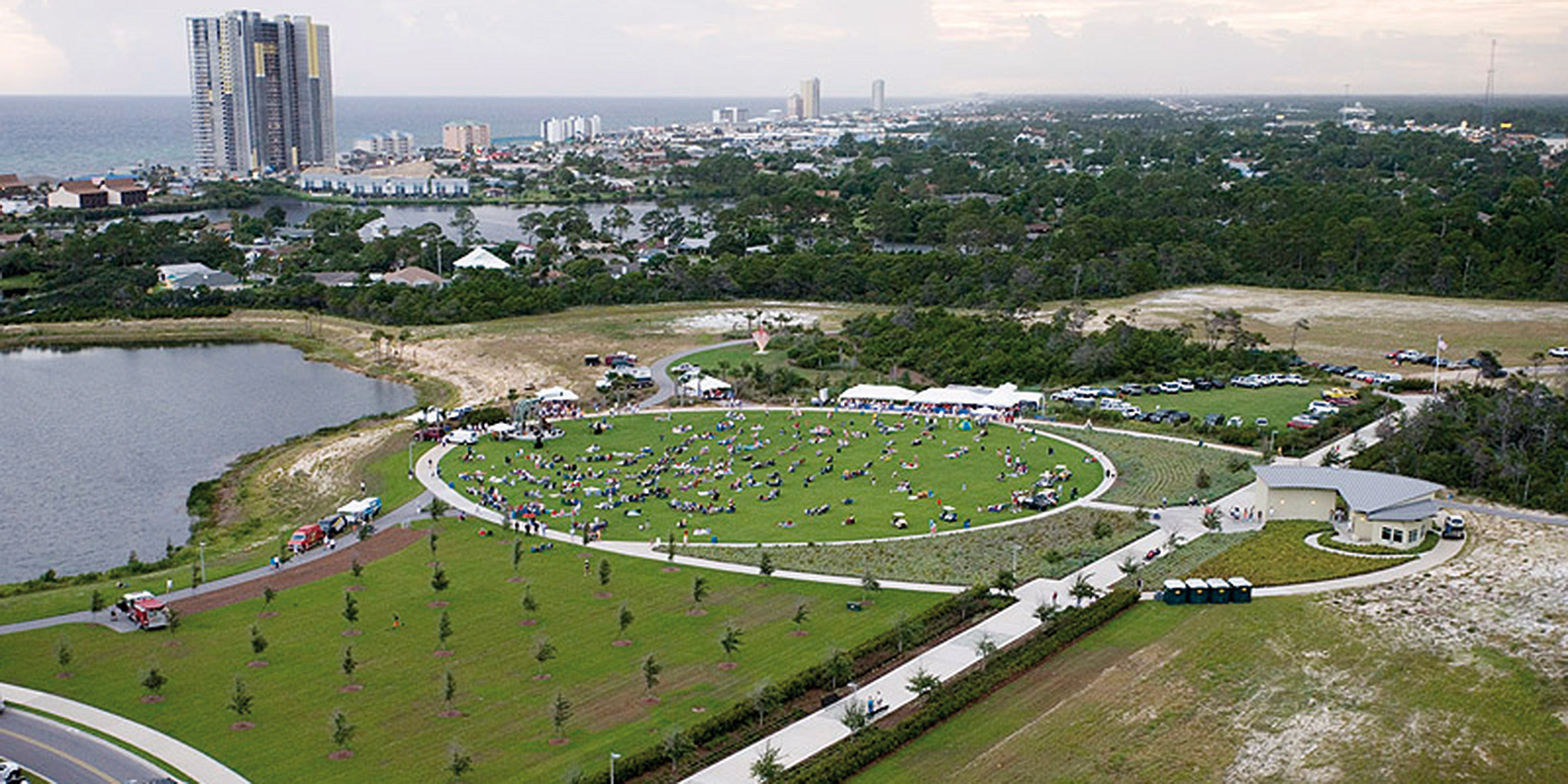 Cooper Carry designed a master plan and implementation drawings for Panama City Beach’s entertainment district, Pier Park. The plaza will house thousands of visitors at the pier and the beach each year in an exciting atmosphere of restaurants, retail and entertainment uses. An iconic bandshell provides a focus for the grand green space while providing a venue for local artists. Whimsical sculptural art sets the tone for expectations of this entertainment space.