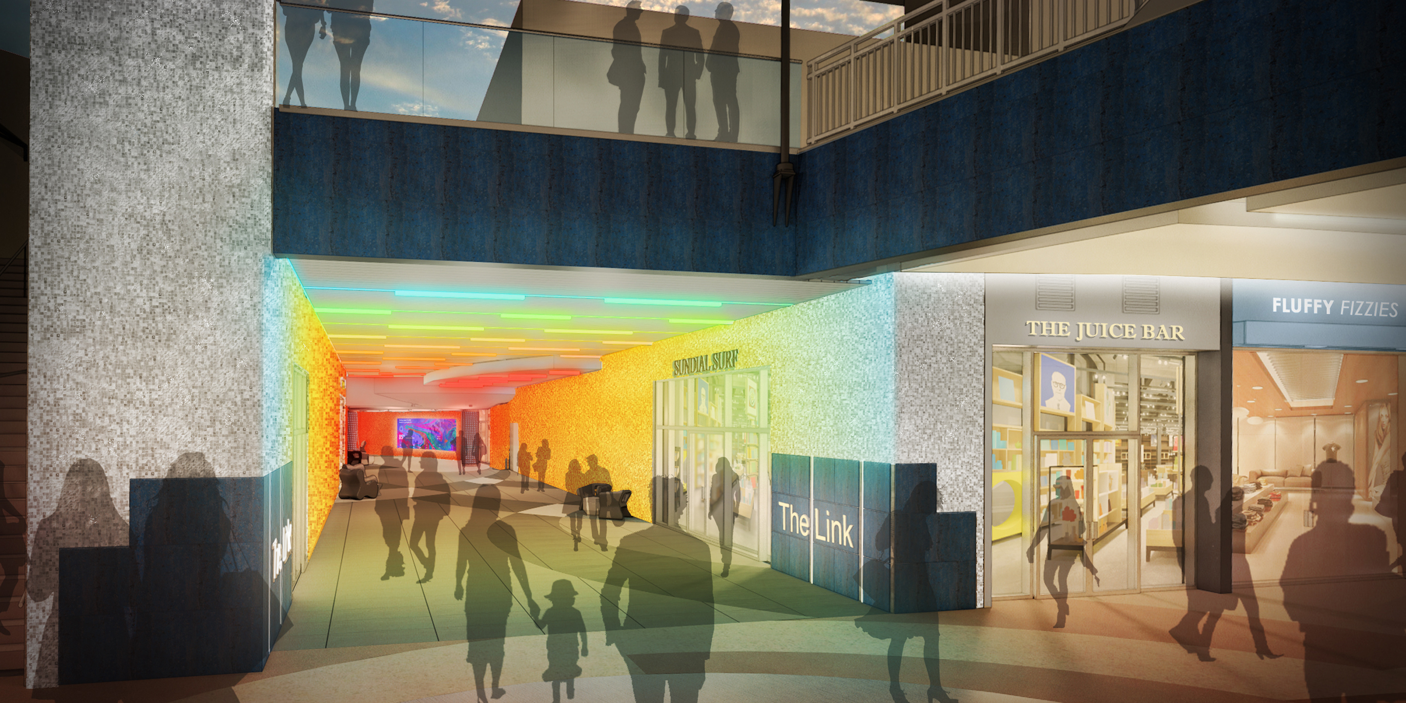 The revised design will amplify retailer presence by raising storefronts where possible, extending tenant materials and signage to give the center a more retail-prominent expression. A new escalator will drive traffic up to the restaurant grouping to make them even easier to get to, and new glass rails and lighting will link the upper and lower level experiences. The center will also have hospitality-like seating groups with playful shade structures, new paint schemes, comfortable chairs, and new upscale lighting.