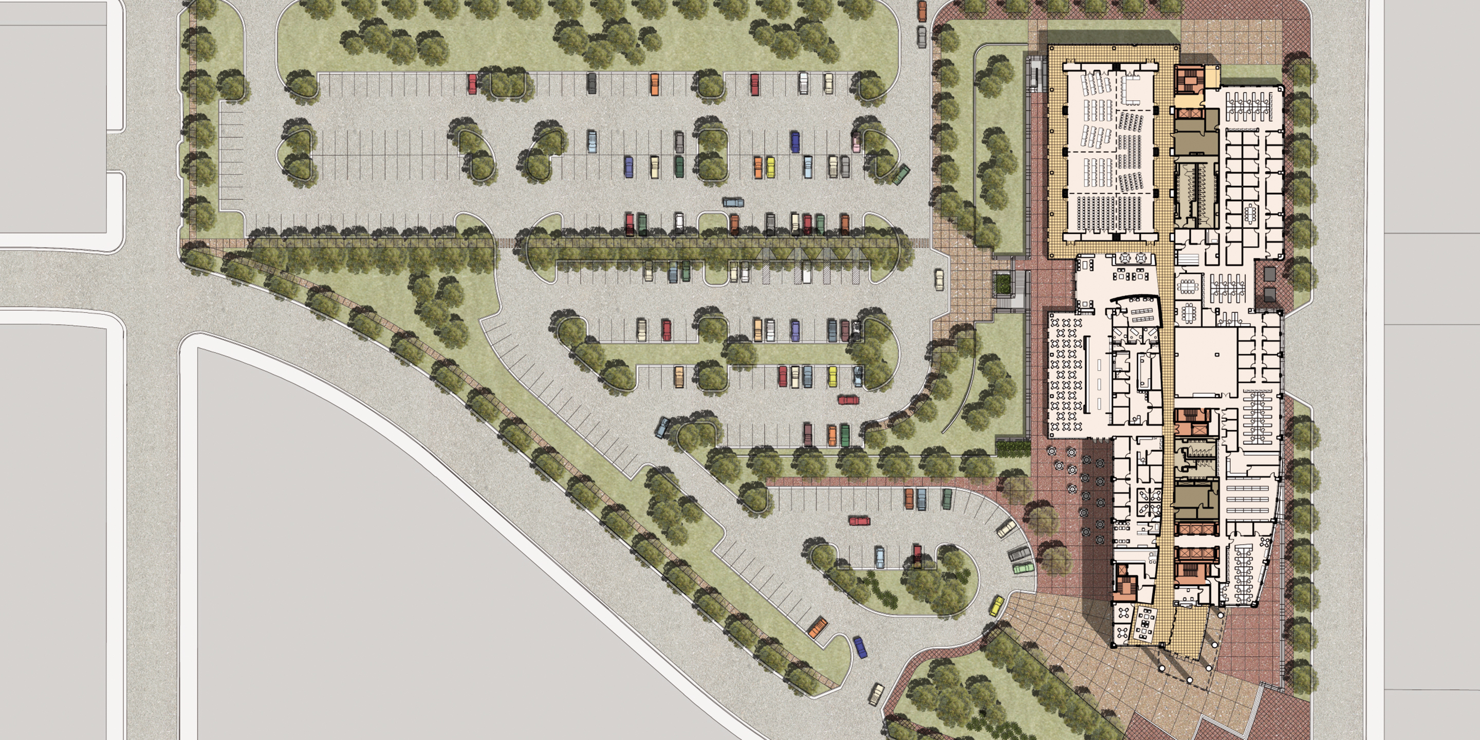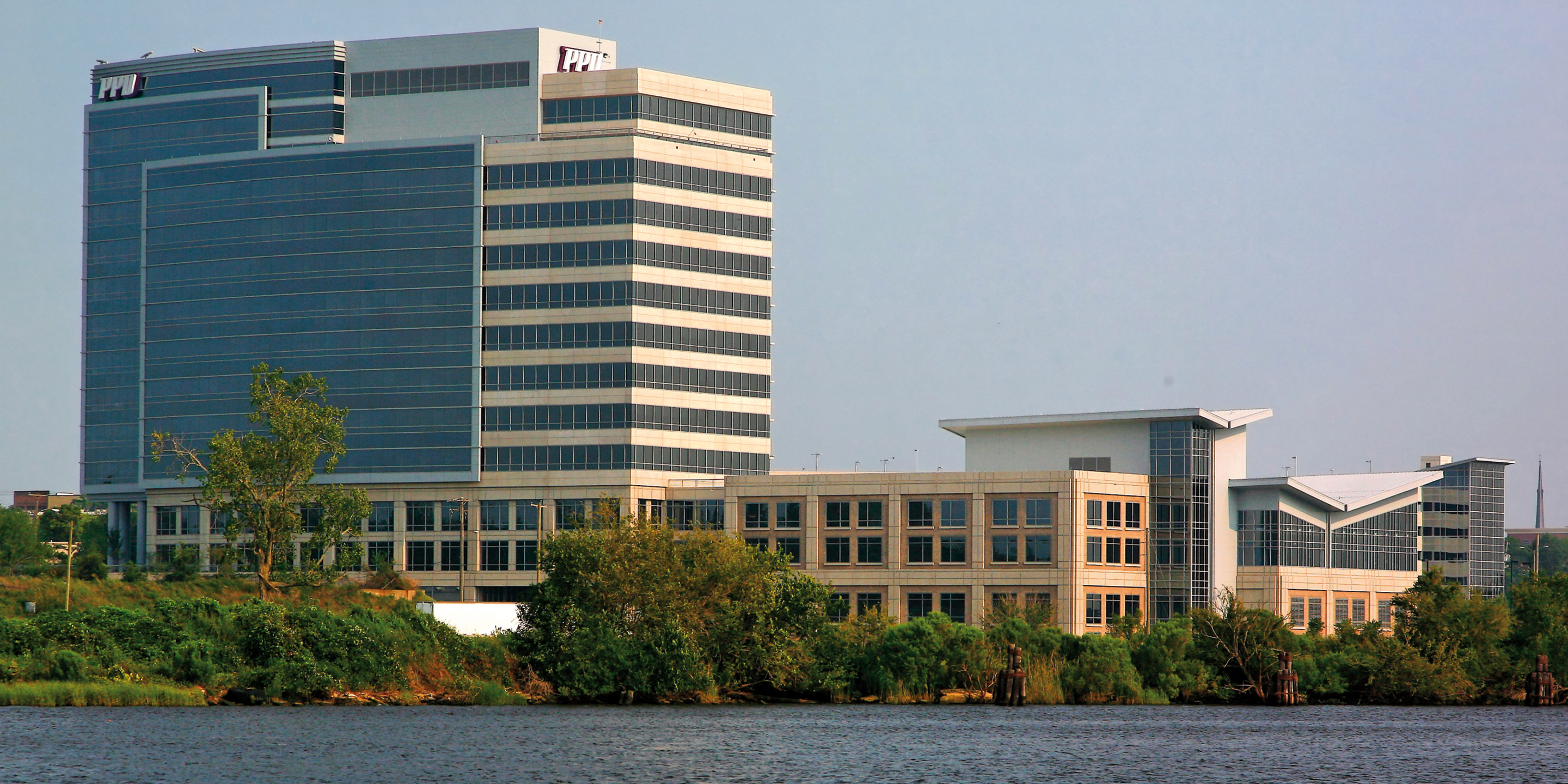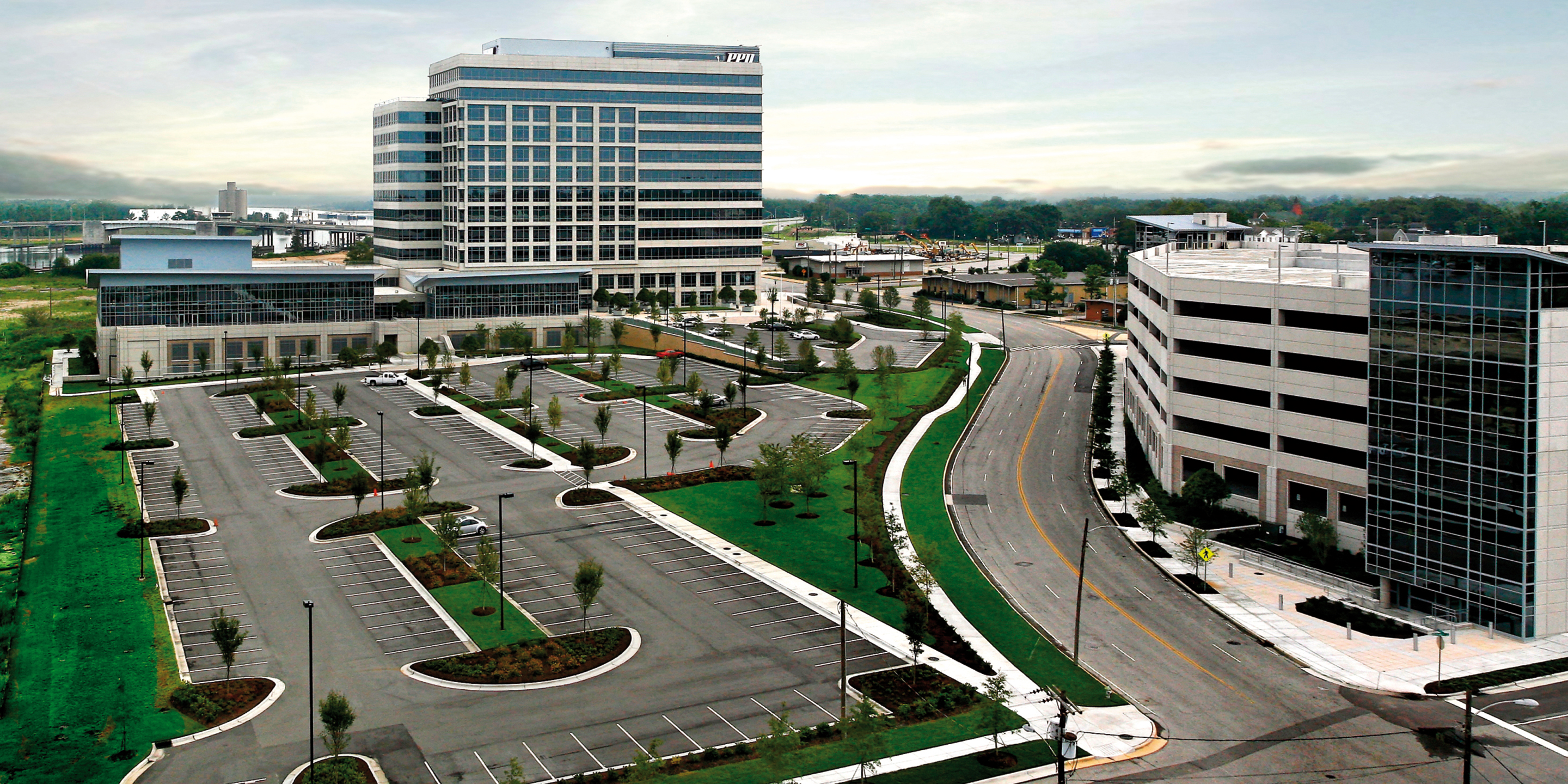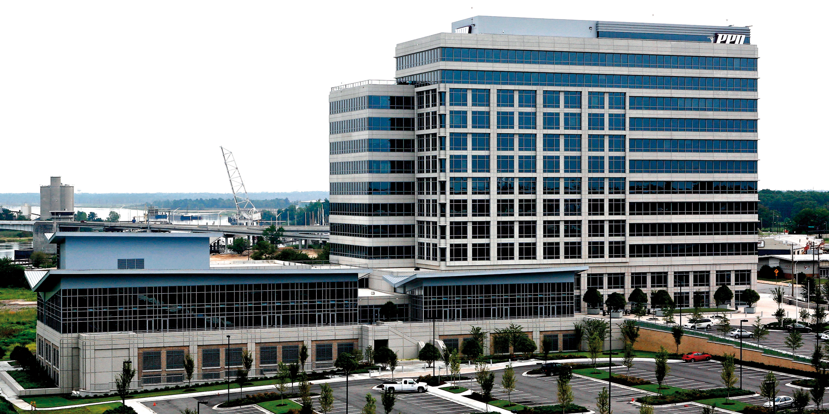 Cooper Carry was master planner and design architect for the new 450,000 square foot PPD Pharmaceuticals Corporate Headquarters in Wilmington, North Carolina. The project is located on a brownfield industrial site formerly part of a shipping terminal on the Cape Fear River. The site serves as the northern terminus of the historic and reemerging riverfront retail and pedestrian corridor. The master plan anticipates future growth of retail business and professional offices on the site. Designed to meet current energy standards and LEED AP Certification the project provides office, management, conference/meeting and hoteling space for the many remotely based pharmaceutical testing coordinators who work worldwide. The aesthetic was developed very closely with the client, emphasizing a modern design approach. The building ‘base’ incorporates a precast and brick vocabulary while the upper levels exhibit reflective glass, precast spandrels and metal panel accents. Natural lighting, city and river views were primary design opportunities afforded by the site.