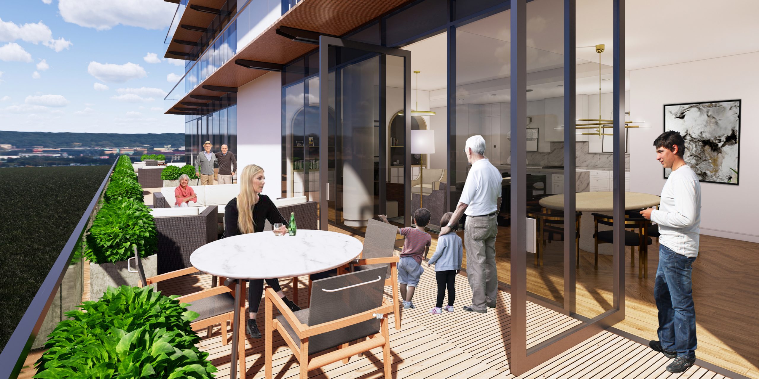 - Large exterior social and community gathering spaces integrated as a daily path to encourage providing gathering and socialization.