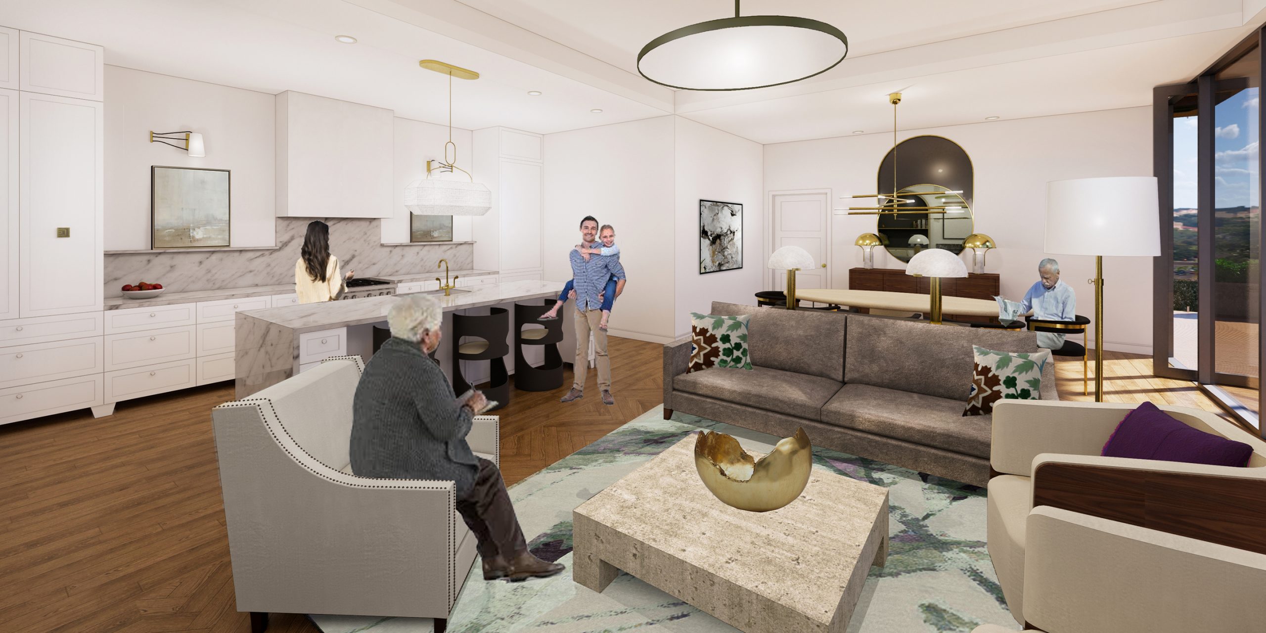 - Open floor plans to provide connection, wide views, ease of movement, designs custom for integrated accommodations for limited reach ranges and mobility. Soft edges and integrated supports are visually seamless with stylish design.