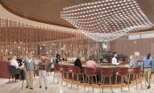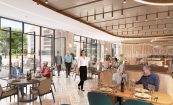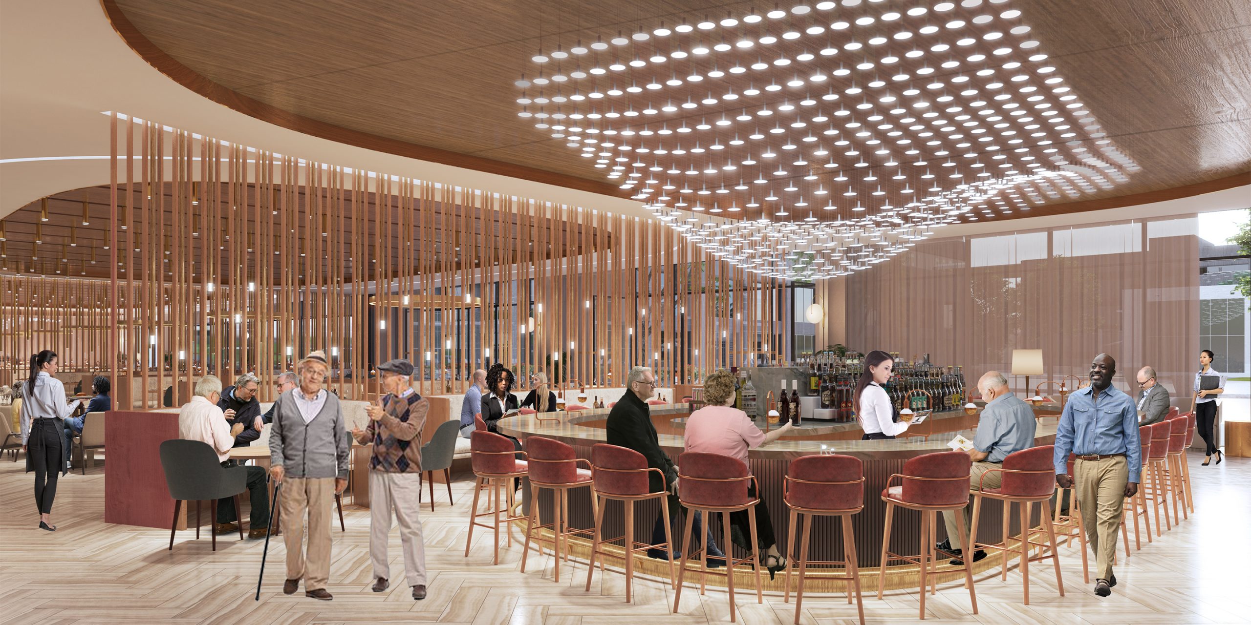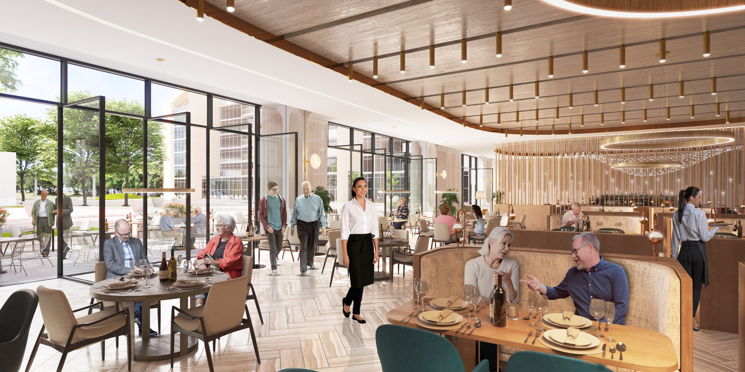 Pulling the primary restaurant and bar for the Senior Living community down to a shared lobby would allow for people watching inside the restaurant and the lobby as well as the street level. This would be open to the public and have extended hours, sidewalk entrances and street and park dining, enhancing the social and community connectivity.