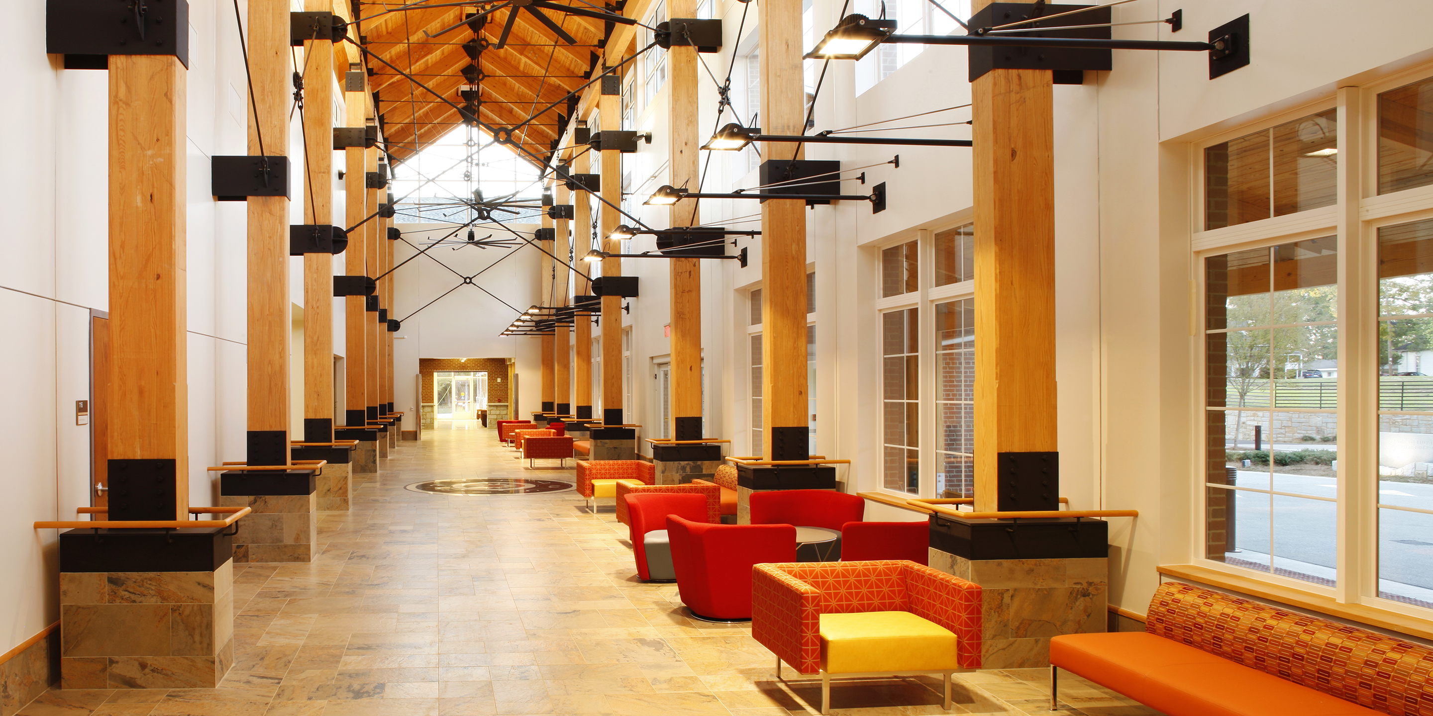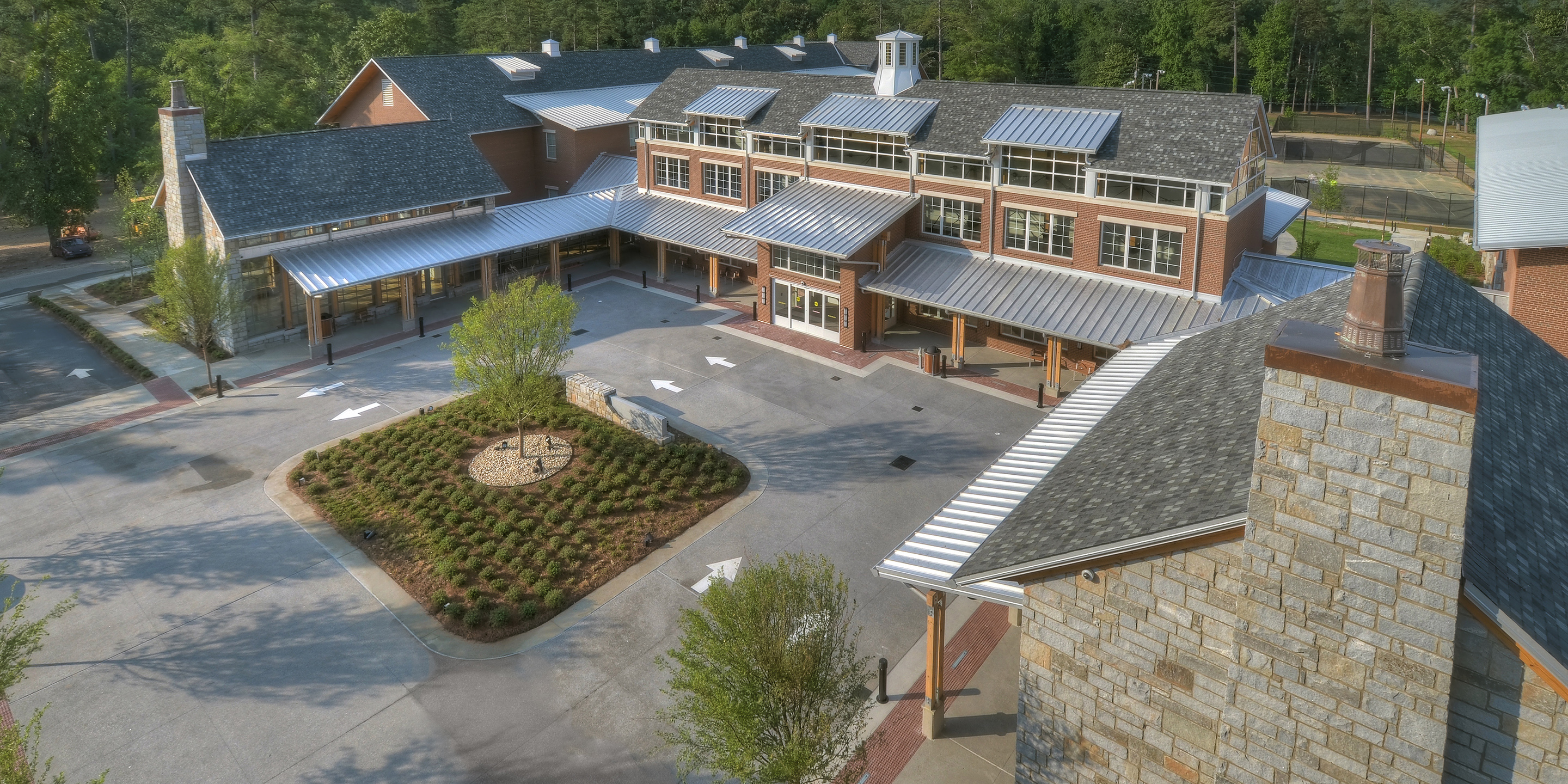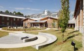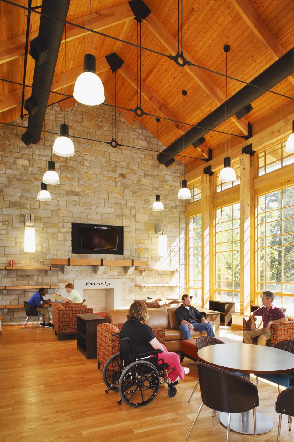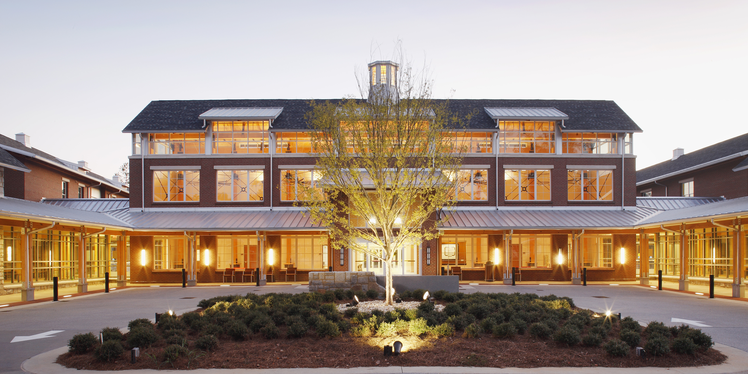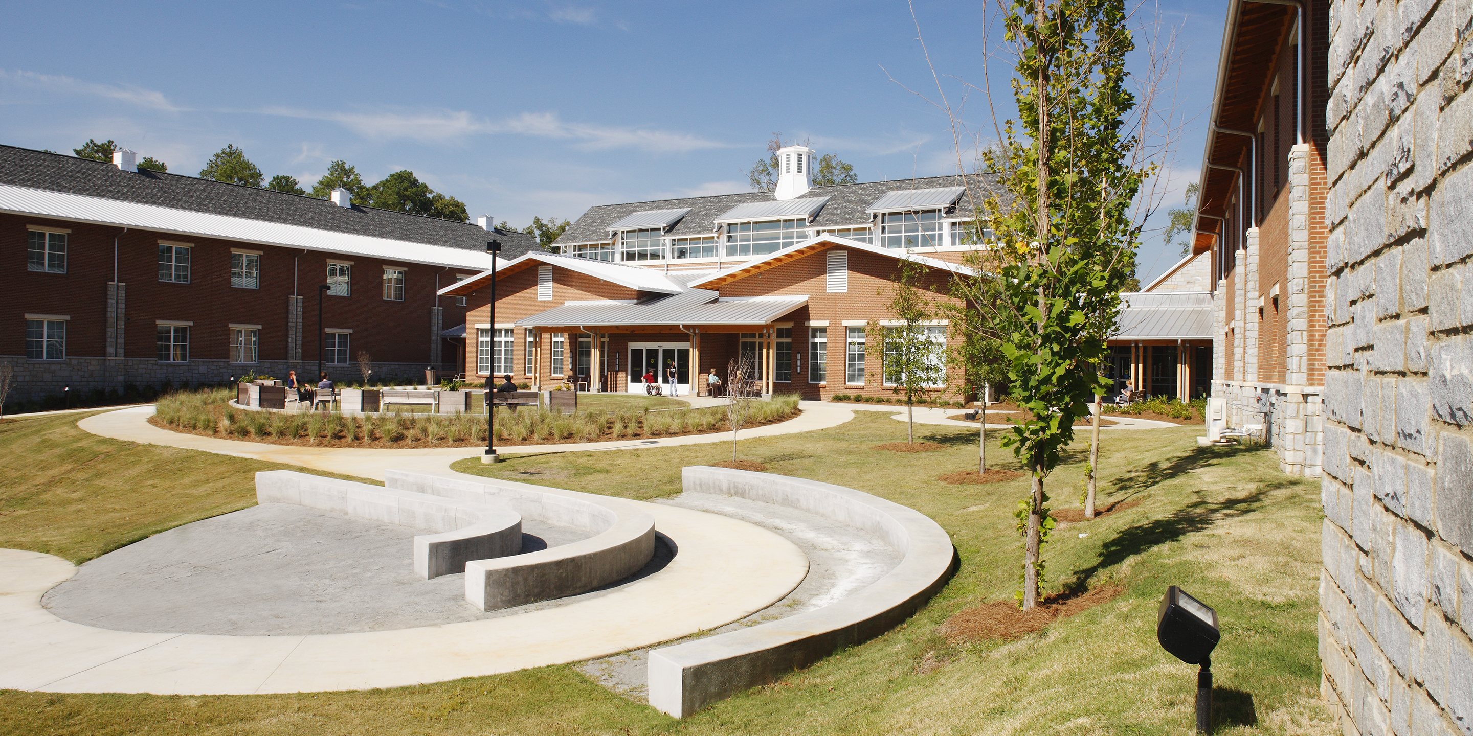 The Roosevelt Warm Springs Institute for Rehabilitation is a residential, evaluation and training facility. It serves patients with disabilities in a 24/7 residential environment providing counseling and case management services, employment development services, life adjustment services, health management services, behavioral management services, academic education, driver’s education, and therapeutic recreation. The primary objective of this facility is to prepare patients to re-enter public life through independent living. The building structure is 72,800 gross square feet on three overall levels. It is a two-story concrete and timber-frame structure with a partial basement for back-of house and equipment spaces. The spatial program is organized around a central commons building and two adjoining residential wings. The central wing is the main arrival, registration and public zone. It includes a great hall commons, a café, a library, instructional classrooms and administrative areas. The two residential wings consist of a total of 155 beds in four dwelling configurations, a nursing observation and exam suite, and common lounges at the end of each hallway. The exterior spaces create places for community and offer learning opportunities. Covered porches surround the entry court, providing a shady resting place. The rear court features an amphitheater and outdoor teaching spaces that spill out from the classrooms. Terraces off the library and café provide a quiet meeting place. A landscaped rain garden demonstrates water management while a planting garden provides therapy for the residents.