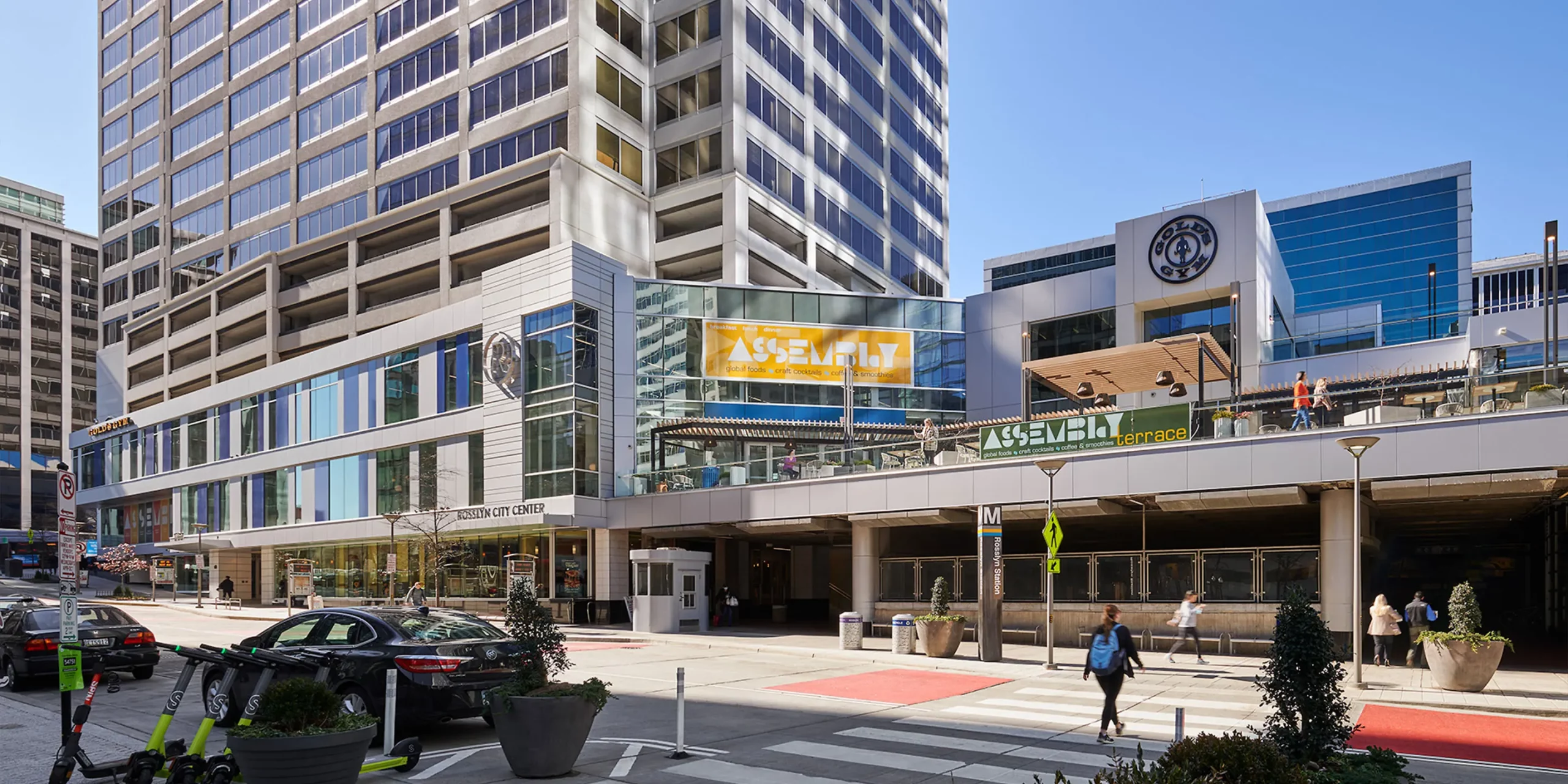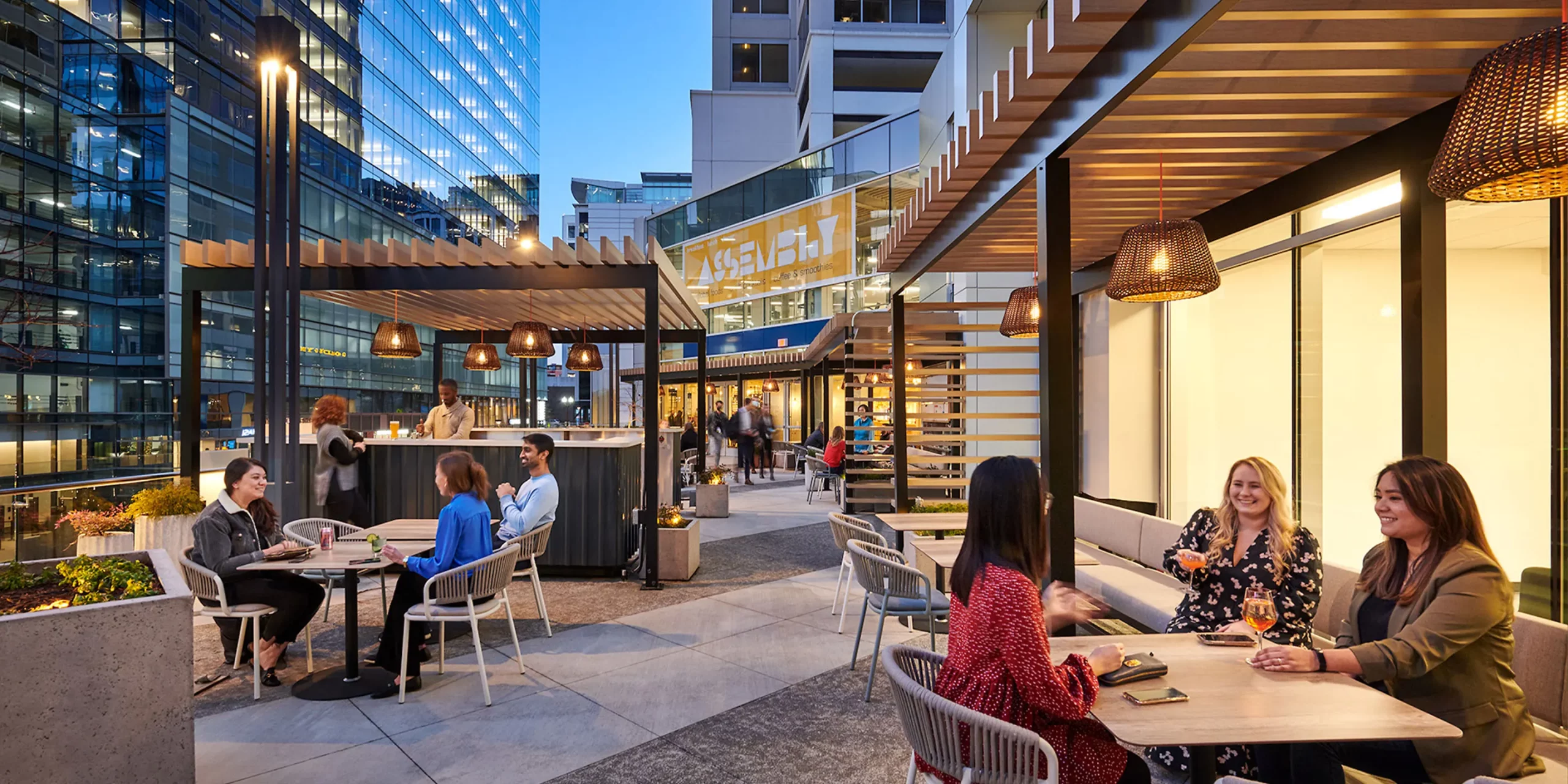 The 110,000-square-foot renovation reimagined the existing façade with a contemporary and vibrant metal panel and curtain wall system. The tenant spaces were reorganized to accommodate a state-of-the-art Gold’s Gym as well as an upscale new food hall dubbed Assembly.