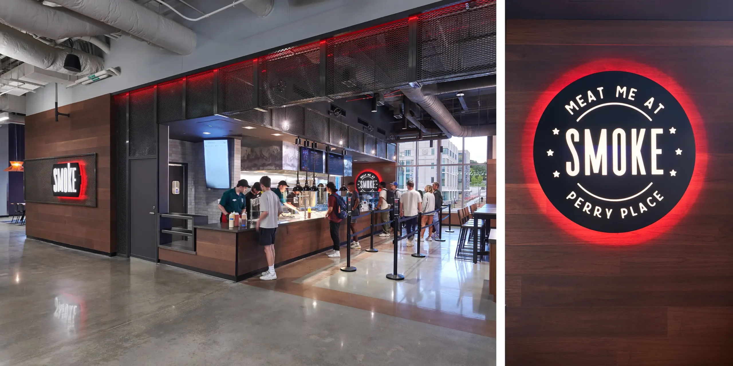 Cooper Carry's brand team developed the Smoke barbecue restaurant brand for the new dining facilities at Hitt Hall at Virginia Tech. This dining hall outlet will feature smoked meats, so Cooper Carry developed the Smoke concept referencing the misty hills of Blacksburg and great Virginia barbecue. The logo is a wordmark instantly recognizable as a meat smoker. The letter "K" extends beyond the frame of the meat smoker where the smoke escapes. The type is modern and has a strong vertical presence that draws attention. A secondary badge logo was designed to reflect a traditional barbecue sauce label with the clever tagline of "Meat me at SMOKE."