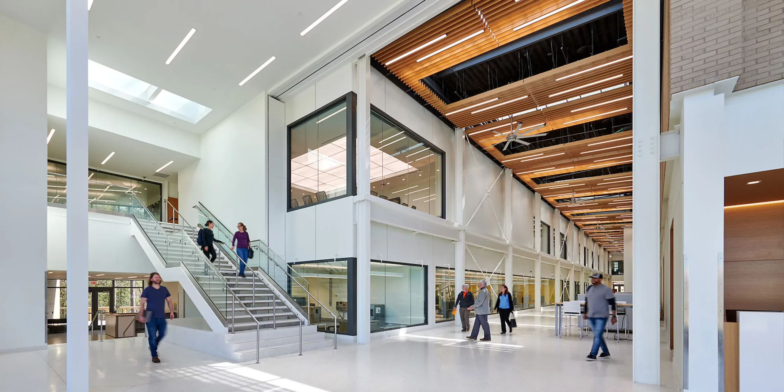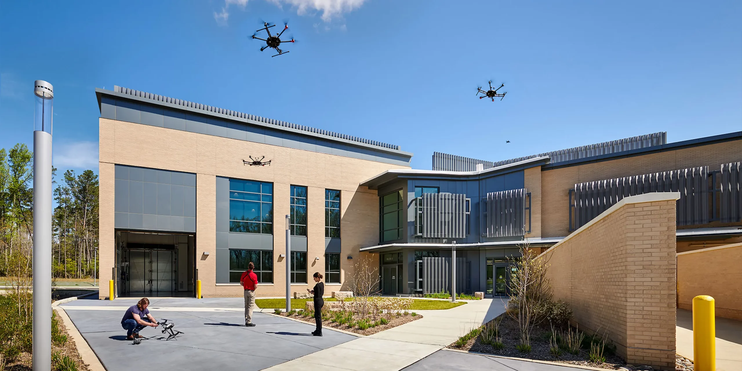The building has been designed for industry and government partners to collaborate with academic faculty and students on translational engineering research that grows new jobs in the region. Research focuses on developing technologies for unmanned aerial and aquatic vehicles. The building houses classrooms, laboratories, conference spaces, and faculty offices. The proximity of research labs to academic and meeting areas promotes interaction, and generous interior glazing showcases ‘engineering in action’ to visitors and building users.