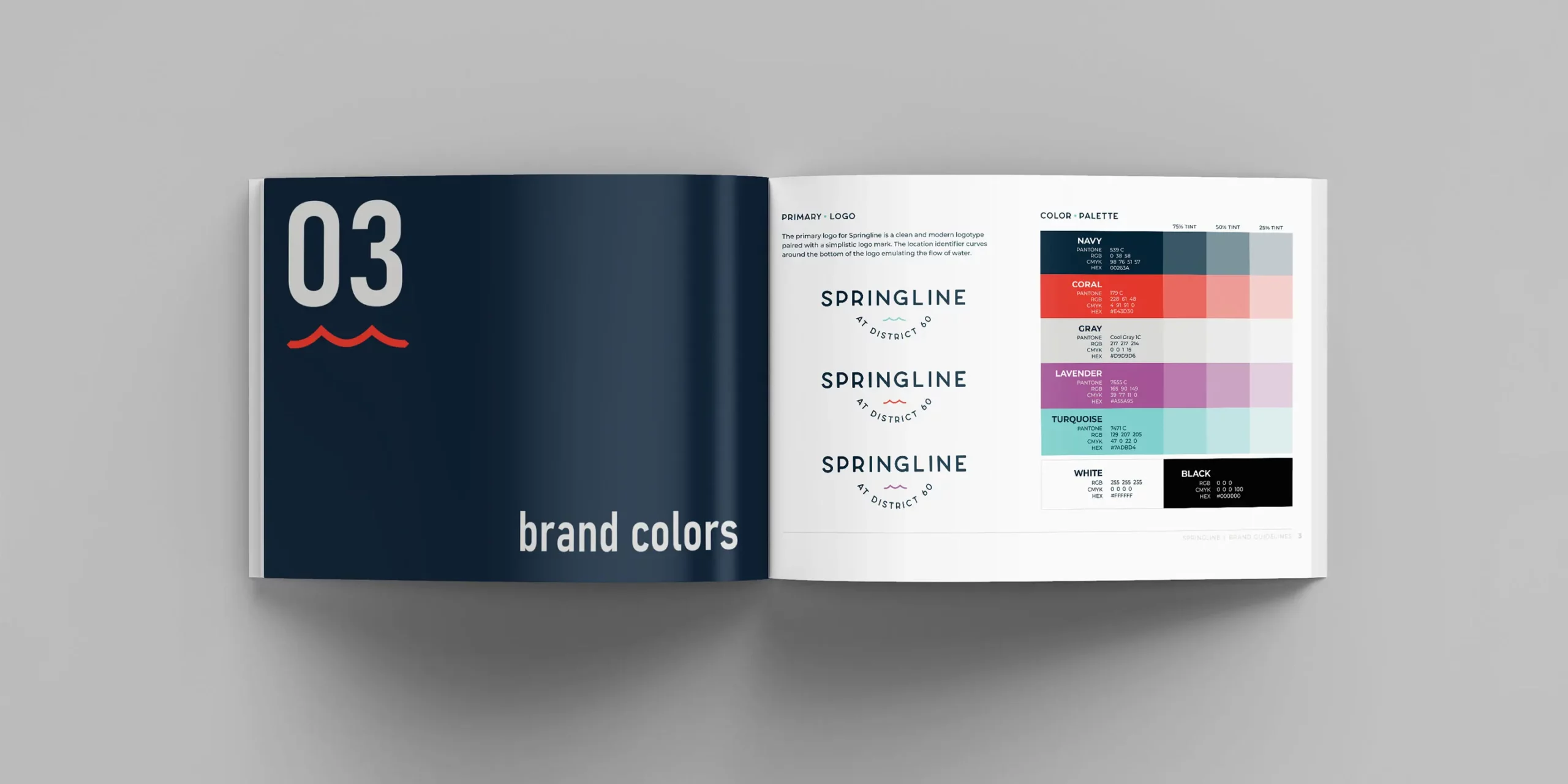 After a six-month long intensive branding process, our Branding Studio decided on the name Springline at District 60 to celebrate the historic springs of Chesterfield County. The Springline brand is a clean and modern logotype with a minimalist mark incorporated to represent the spring waters. It offers a vibrant and versatile color palette to further maximize the brand.