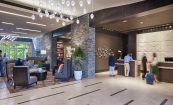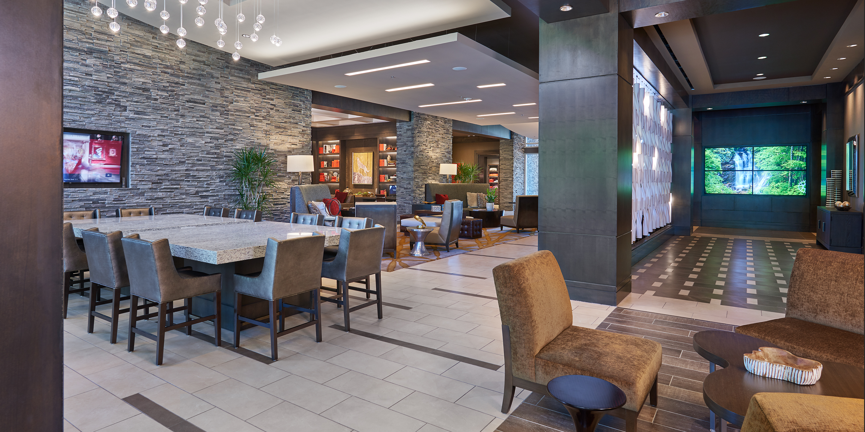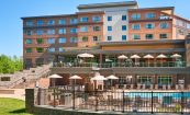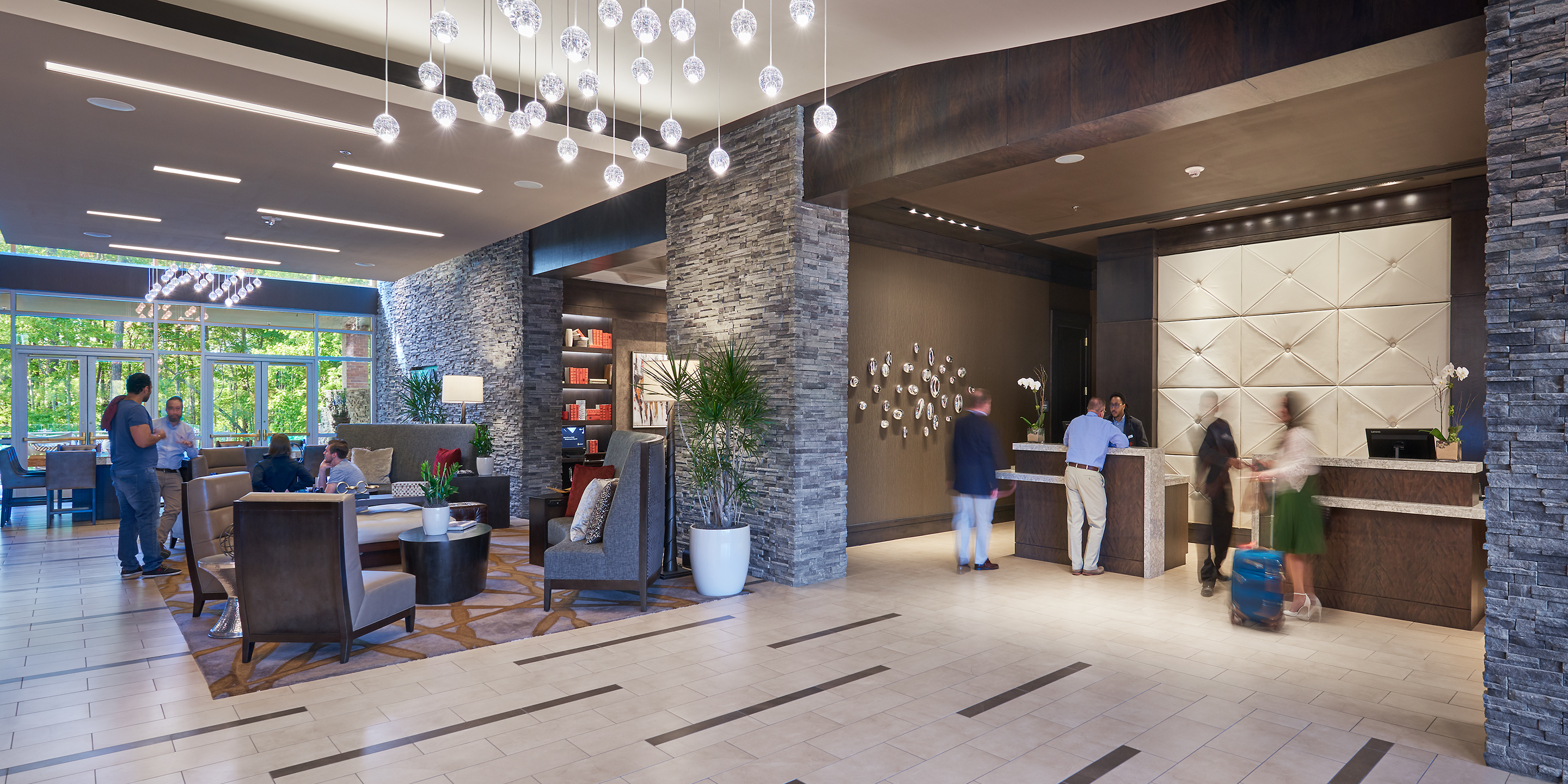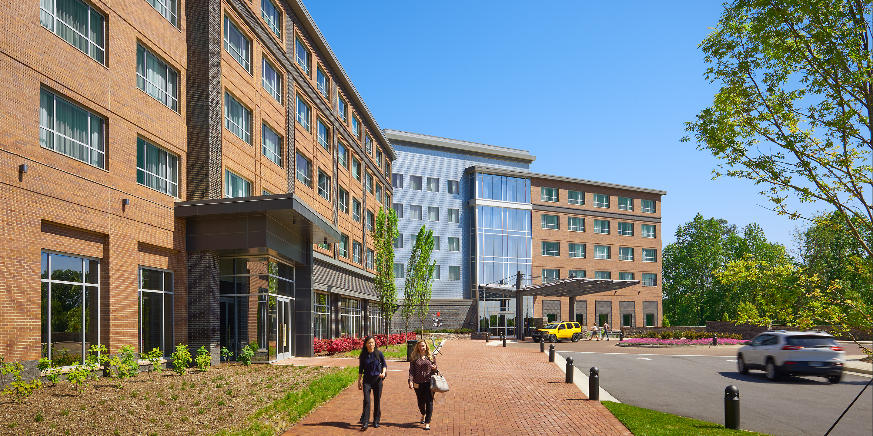 The StateView Hotel and Conference Center is located on Centennial Campus of North Carolina State University, adjacent to Lake Raleigh. The hotel is sited upon the crest of a hill within a mostly wooded area. The hotel is an Autograph by Marriott, a branded facility of 164 keys on four guestroom levels. The hotel features a lower level fitness center that opens to an outdoor pool and terrace, designed as an integral part of the landscape and existing natural character of the site. In addition to the hotel, the project includes a one-story, 8,500 gross square-foot conference facility. The facility includes a 4,000 sf meeting room and a series of smaller rooms that are multi-functional. Portions of the pre-function space have adjacencies to a 3,500 sf exterior event terrace that sits within the natural topography of the site. The project also includes approximately 267 on-grade terraced parking spaces. The gross area for the project totals approximately 118,000 sf.