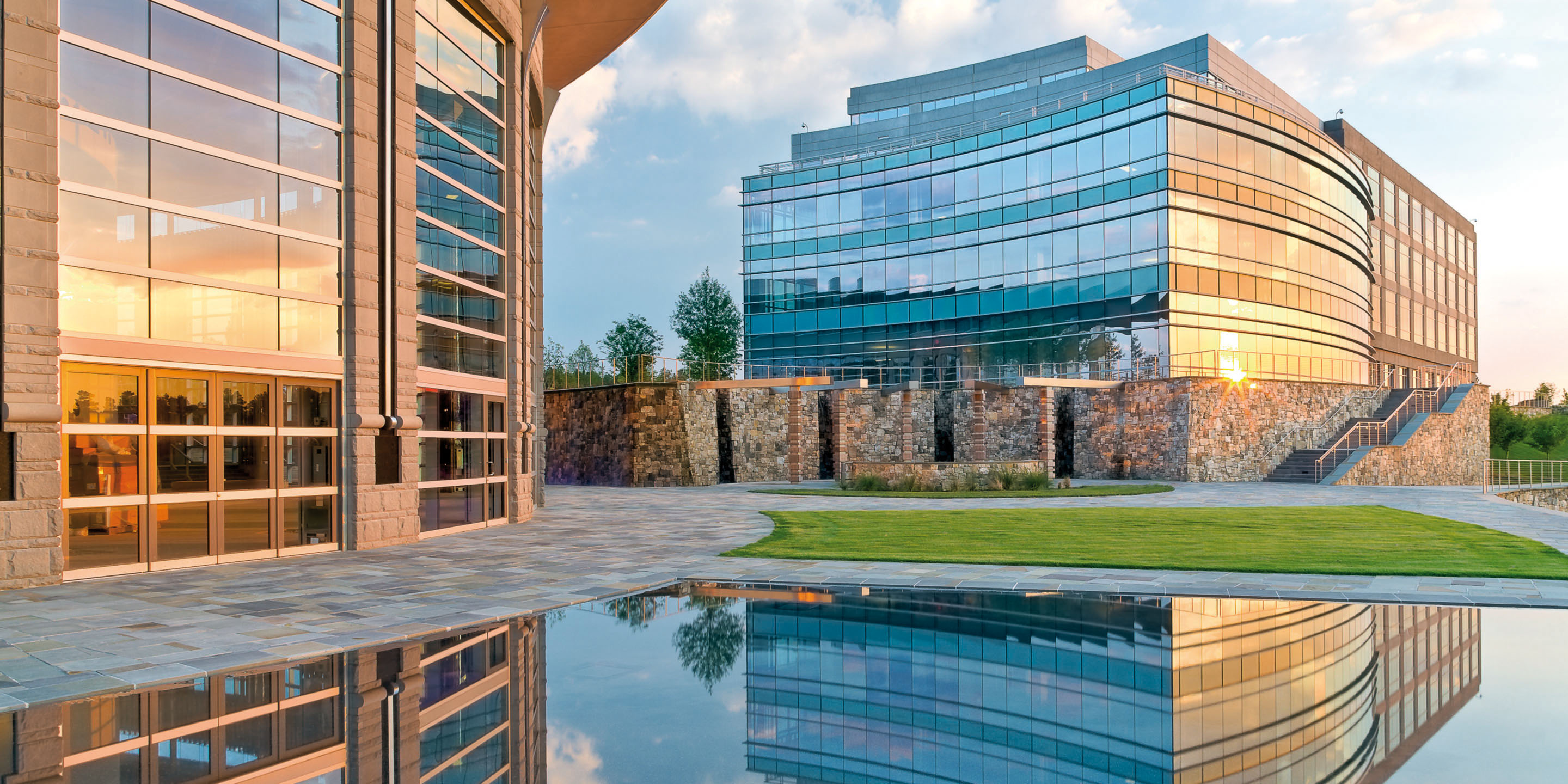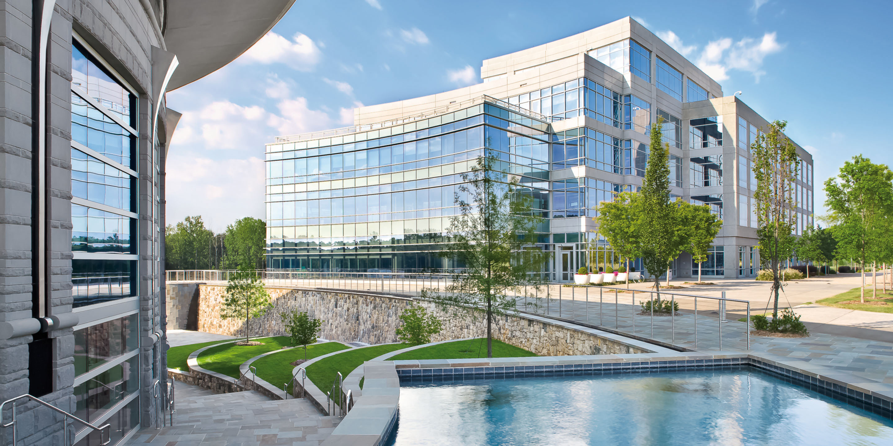 The TD Bank Campus (formerly Carolina First) was planned as a recognizable and environmentally sustainable corporate campus on a 65-acre brownfield site. Substantial regrading of the property was required as part of the toxic mitigation requirements, and the client set out to achieve a strong visual identity along the bordering I-85 corridor. Cooper Carry was selected as master plan architect, corporate building architect and landscape architect. We worked collaboratively with a Greenville based interior architecture firm and an affiliated architect hired for the conference center component. The zoned site plan accommodates over 1 million square feet of corporate development. Initial planning work provides for 4 office buildings and the conference dining facility. Currently, 2 of the 4 office buildings have been completed and occupied totaling 225,000 square feet. The site master plan has been realized, a large lake constructed and the site reforested with new tree cover. As needs are identified the conference facility and additional office buildings will come on line. The project has been awarded LEED-NC Gold for the site as well as the two first phase office buildings. These highly sustainable office buildings incorporate enhanced energy saving mechanical systems, a variety of solar reflective glazing and green roof landscaping on the upper level terrace decks. High priority was given during design to incorporating recycled as well as regionally produced materials. Special water conservation, rainwater harvesting, plant palette and sustainable site materials were all key components of the project’s LEED AP objectives.