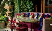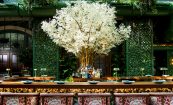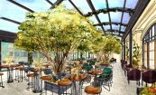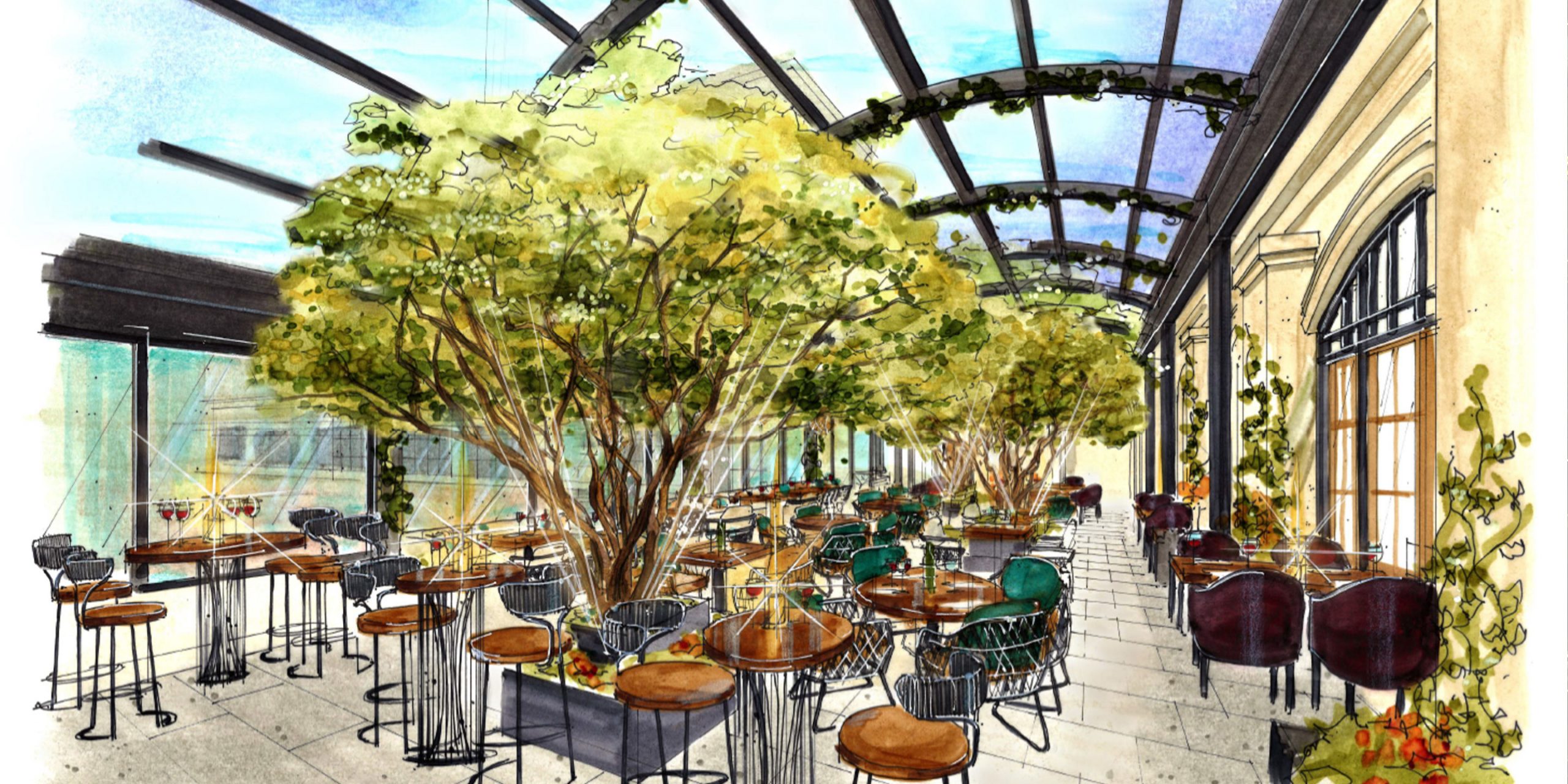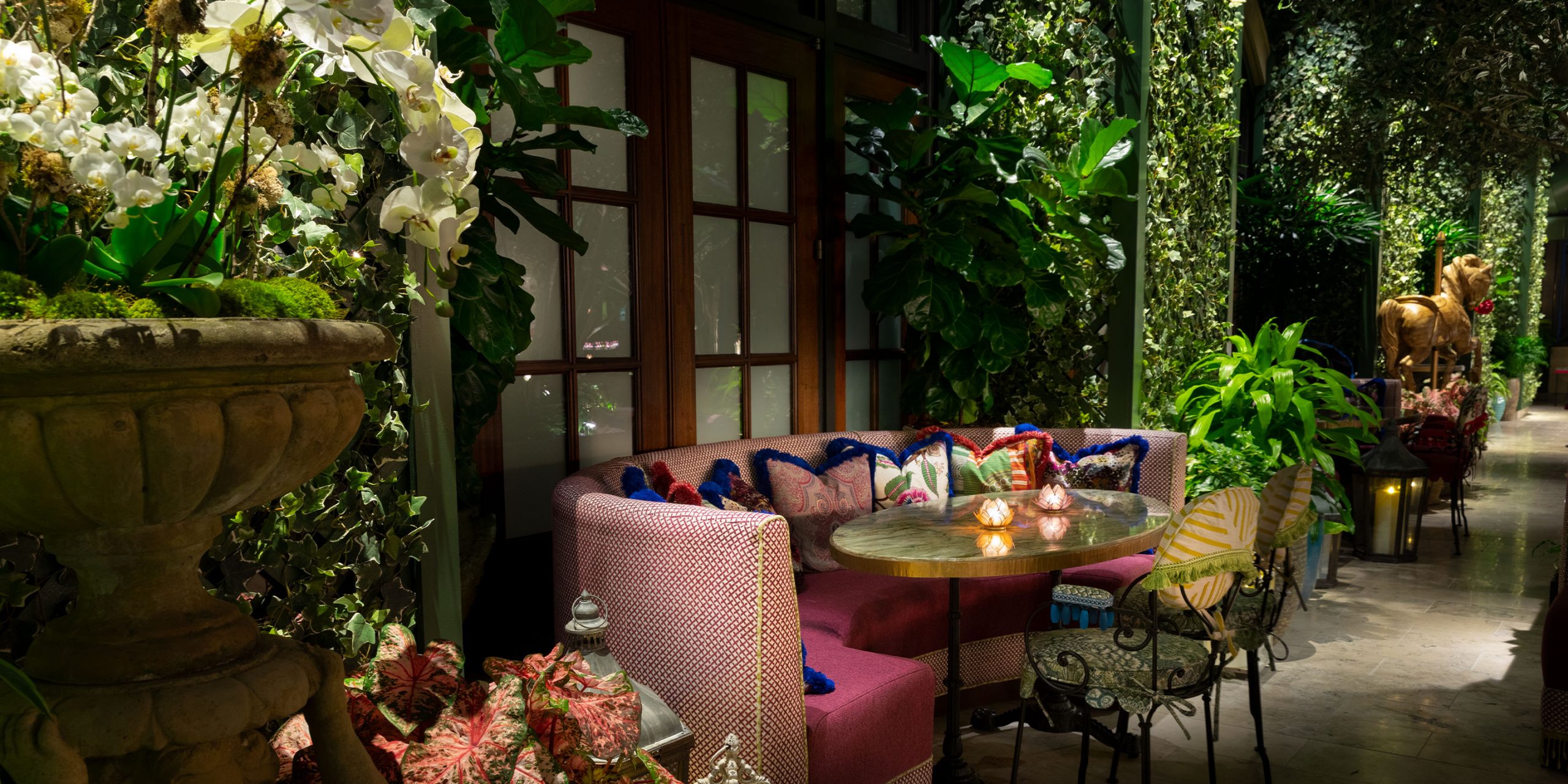 As part of the hotel's 10th anniversary, the St. Regis Atlanta underwent property-wide renovations, including a new outdoor garden terrace called The Garden Room. Designed by the Johnson Studio at Cooper Carry, the new 3,070 sf terrace is enclosed with a vaulted glass-and-steel roof as well as operable sliding windows around the perimeter to blur the lines of an indoor-outdoor experience. Inspired by the St. Regis' legacy of luxury, the terrace's design takes a maximalist approach to a quintessential Southern garden party. A fantastical white tree sculpture serves as a focal point behind the large outdoor bar. Seating is outfitted with highly decorative floral fabrics and fringed pillows in emerald green and magenta fuschia to juxtapose the geometric patterns and color motifs found inside the St. Regis in its Atlas restaurant, also designed by The Johnson Studio at Cooper Carry. A variety of live plans and trees are showcased on ledges and trellises through the greenhouse-like space, with uplighting used for a dramatic effect.