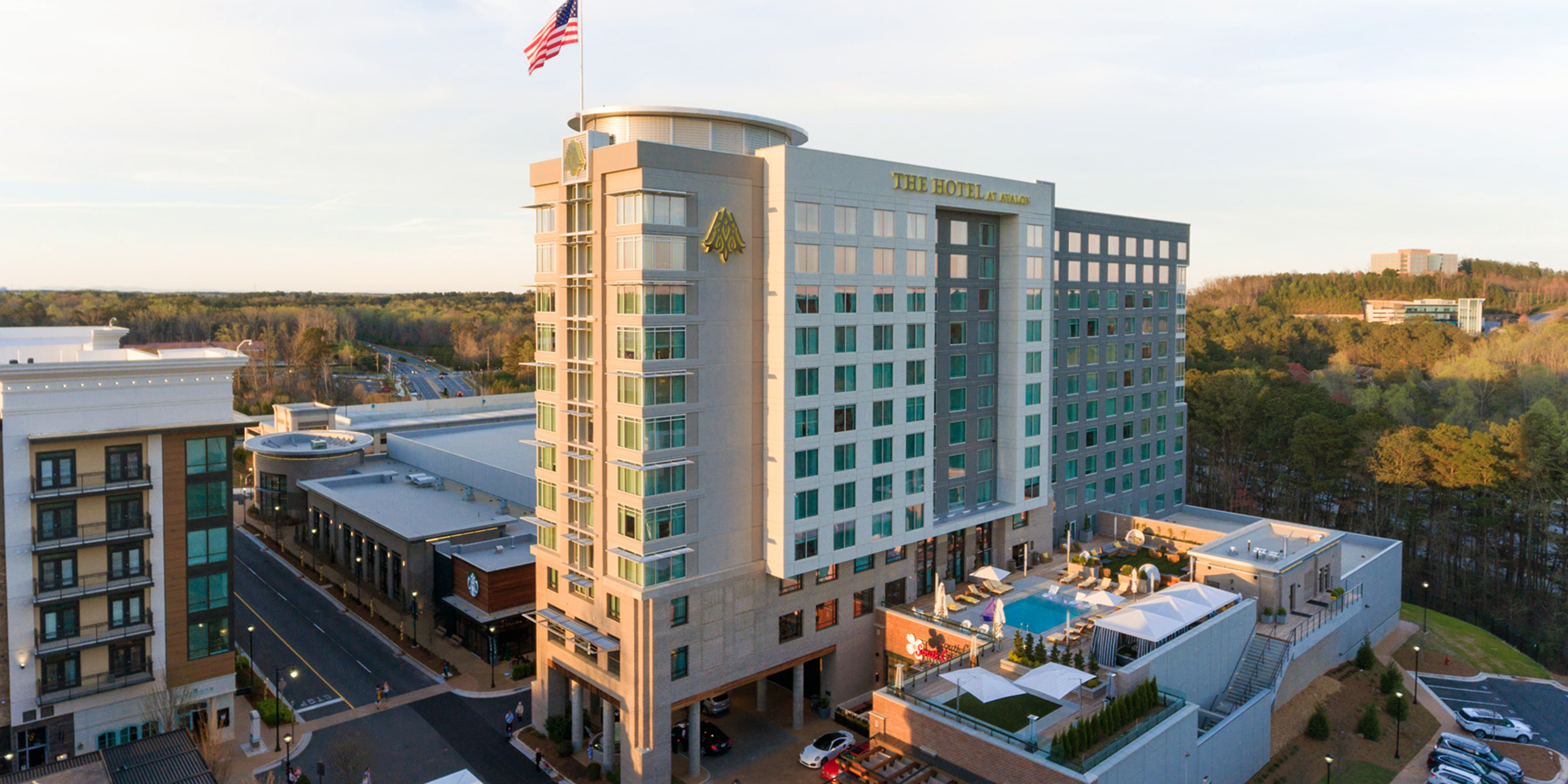 The Hotel at Avalon and Alpharetta Conference Center is a 325-key new hotel and conference facility that anchors the Avalon development in Alpharetta, GA, a suburb of Atlanta. The development serves more than 600 technology companies that are located nearby. Amenities include a pool, event space, fitness area, and spa. The ground floor also includes a small restaurant, South City Kitchen. In addition, the hotel features a second-floor bar above the porte-cochere, which will overlook the Avalon Boulevard retail and dining corridor. Conference facilities include 30,000 SF of meeting space, including a 23,000 SF exhibit hall/ballroom space. An associated precast parking garage includes 458 parking spaces.