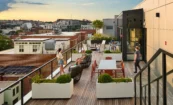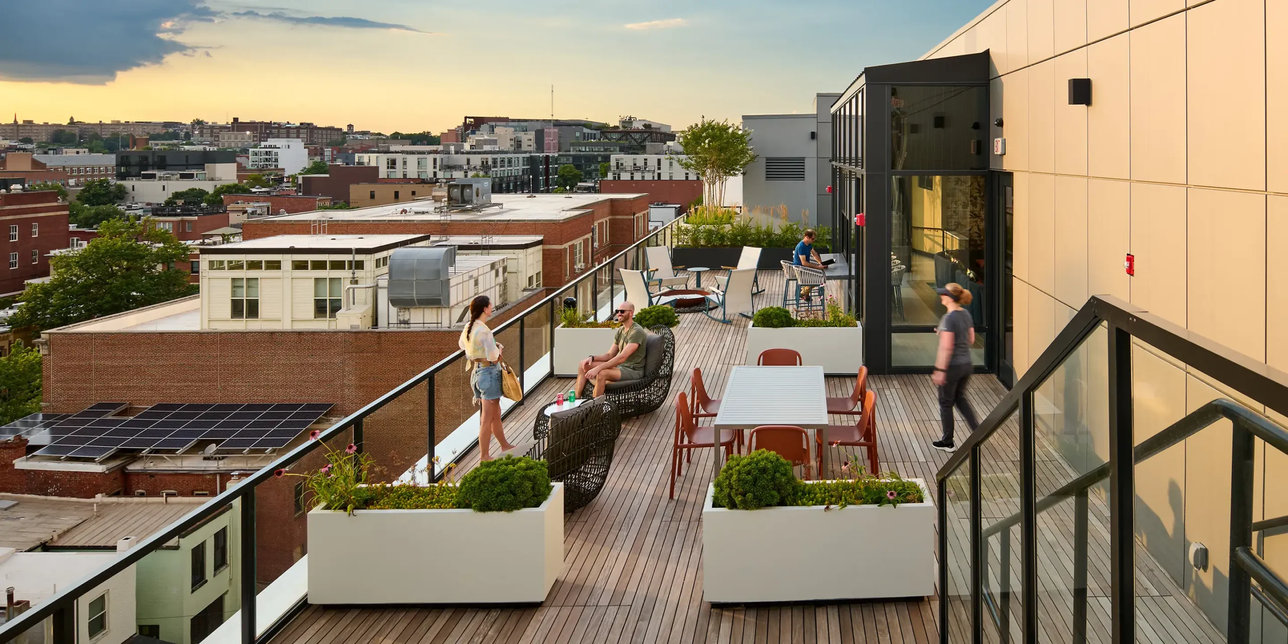 The rooftop offers welcoming spaces for a variety of activities with amenities such as a swimming pool, outdoor grills, dining areas, and a dog run. From there, residents are treated to sweeping views of downtown DC, the Capitol Building, and the Washington Monument. The ground level of the building is highly activated, with retail, a gym, and a double-level amenity at the residential entrance.