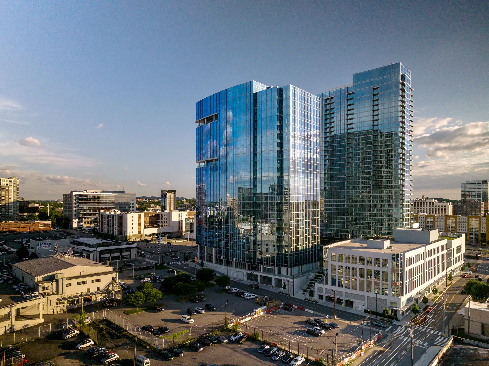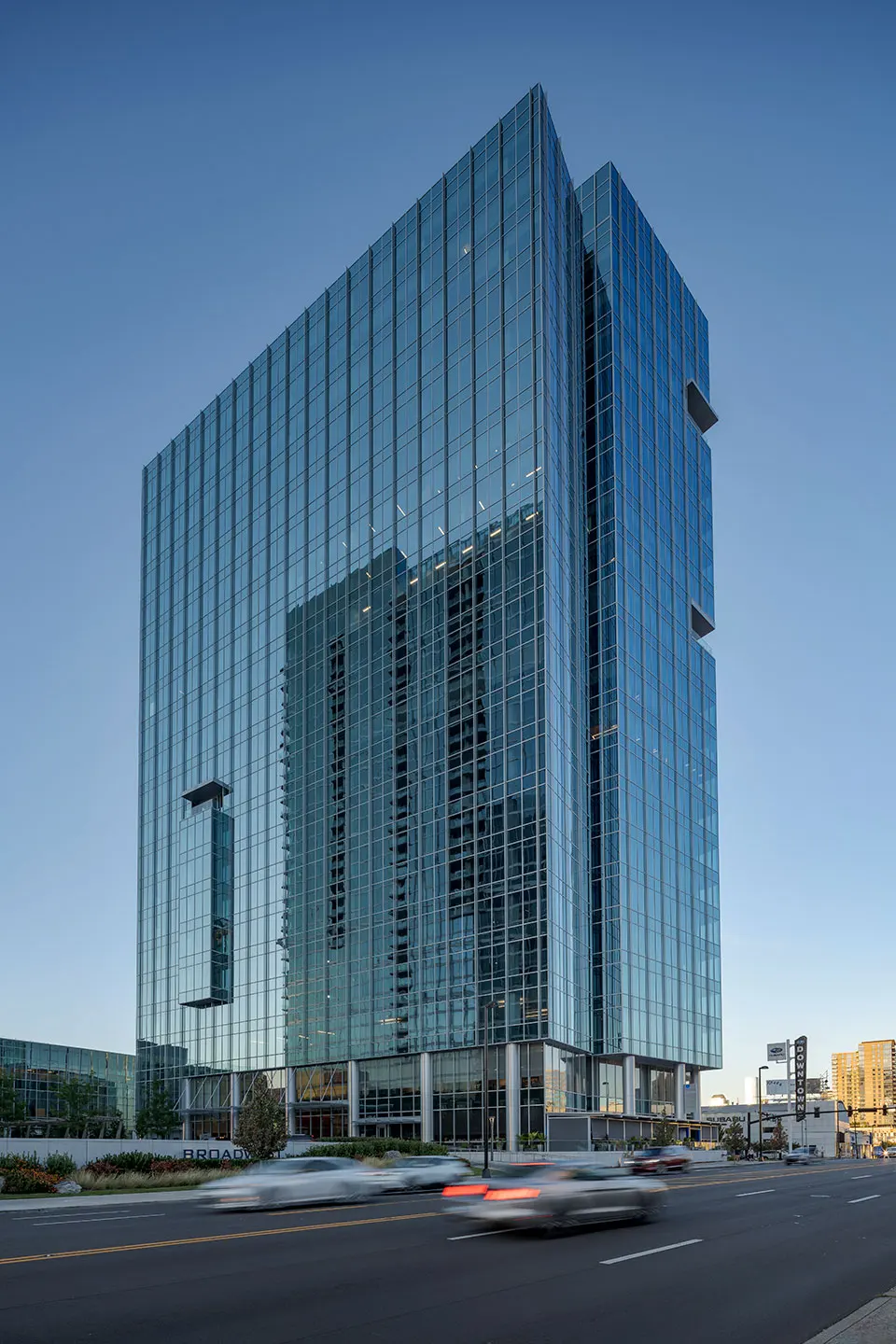 Broadwest is a 1.2 million-square-foot, pedestrian-friendly, mixed-use development in Nashville’s vibrant Midtown neighborhood. As a nod to its location where Broadway and West End Avenue splits, Broadwest is defined by two glass towers. The first tower spans 21 stories and offers 500,000 rentable square feet (RSF) of Class AA office space with 10-foot, floor-to-ceiling glass throughout and abundant daylight inside for tenants. The contemporary style of the office features modern lighting and décor, and the office spaces are designed with flexibility at the core.