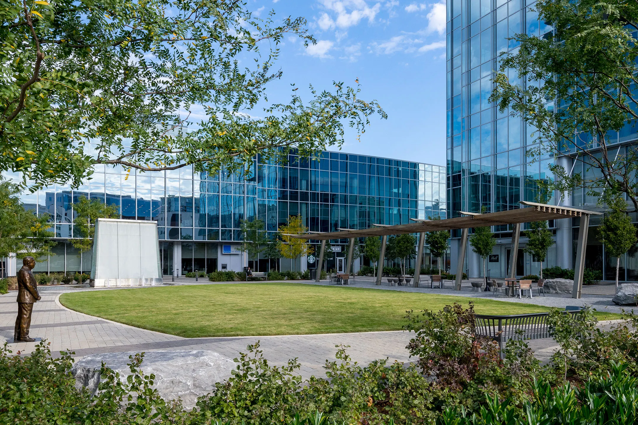 Dining options are available at the street level of the first tower, which connects to a spacious 1.5-acre plaza flanked by a 3.5-story, 125,000 RSF flex building with retail and additional office space. Office tower tenants can easily enjoy lunch al fresco along the plaza or at one of the several eateries in the adjacent tower.