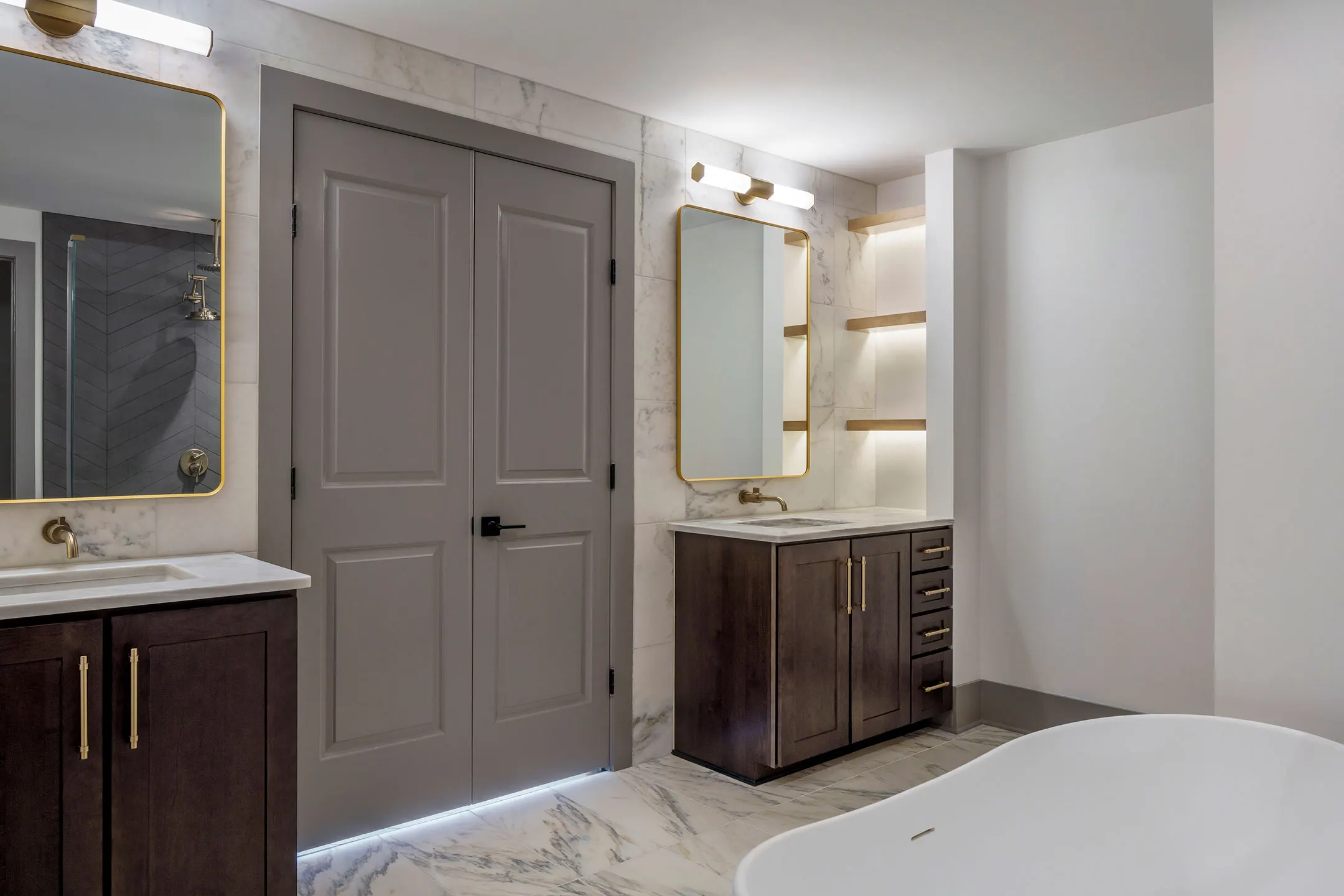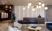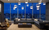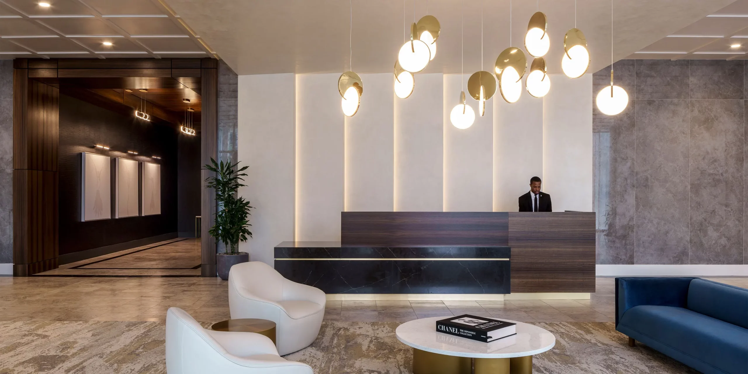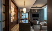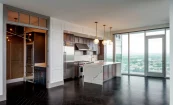 The residences feature chevron-patterned hardwood floors, custom kitchen and bathroom cabinetry, and marble countertops and bathrooms. Many of the units have dedicated bars and wine coolers to maximize hosting options. For those who choose to leave the cooking to someone else, room service is available from the Conrad Hilton below.