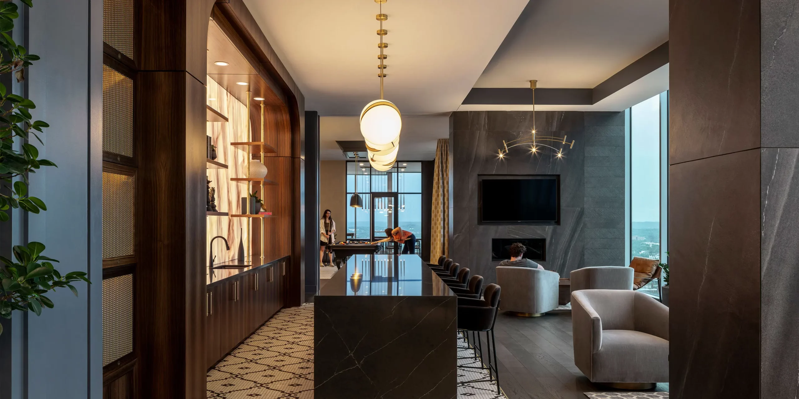 The main public areas include a lobby with curated art, golf simulator space, library, full-service bar and lounge, and a catering kitchen. Rooftop amenities feature covered seating with a gas fire pit, outdoor grilling stations, a pool with integral sun shelf, and sun deck with cabanas, all with panoramic views to downtown and the West End. The development also includes a pet spa and dedicated dog park with automated washdown system.
